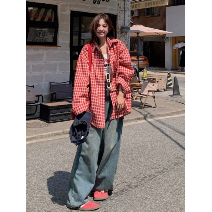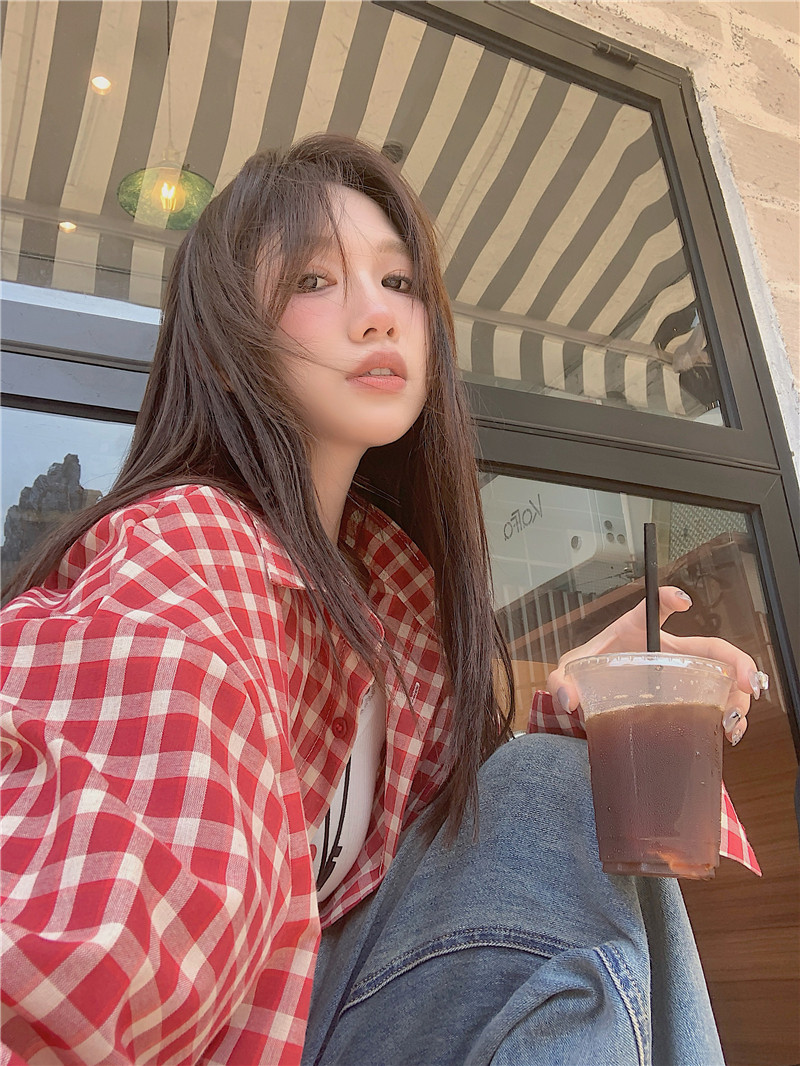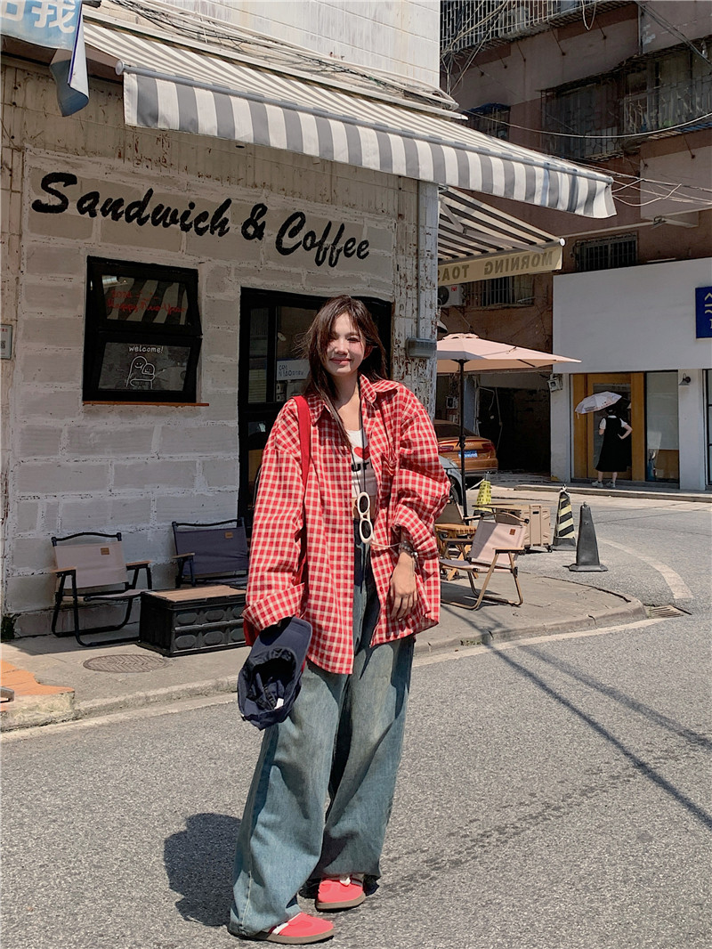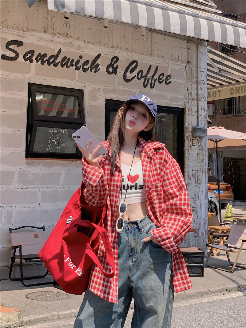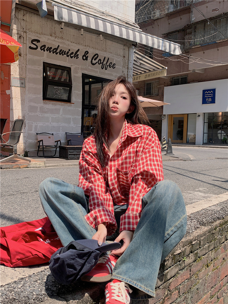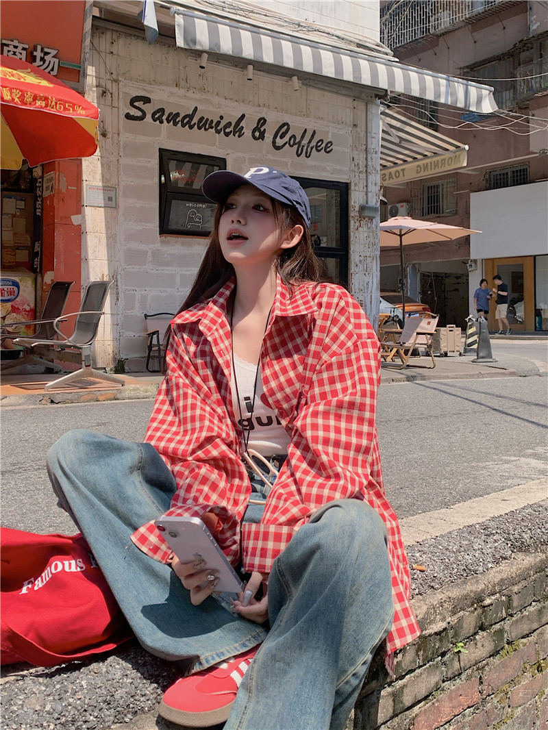 港風紅色大碼格子襯衫外搭女寬鬆顯瘦oversize百搭男友風長袖襯衫
