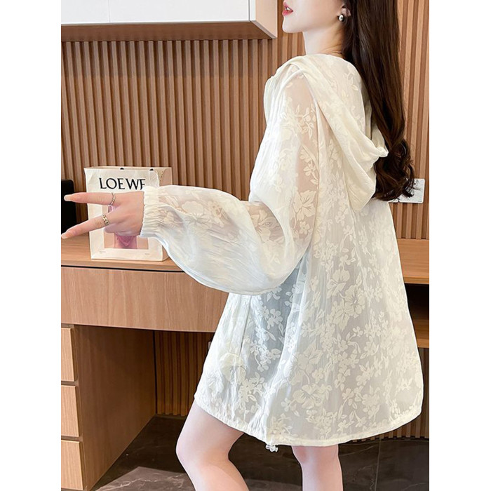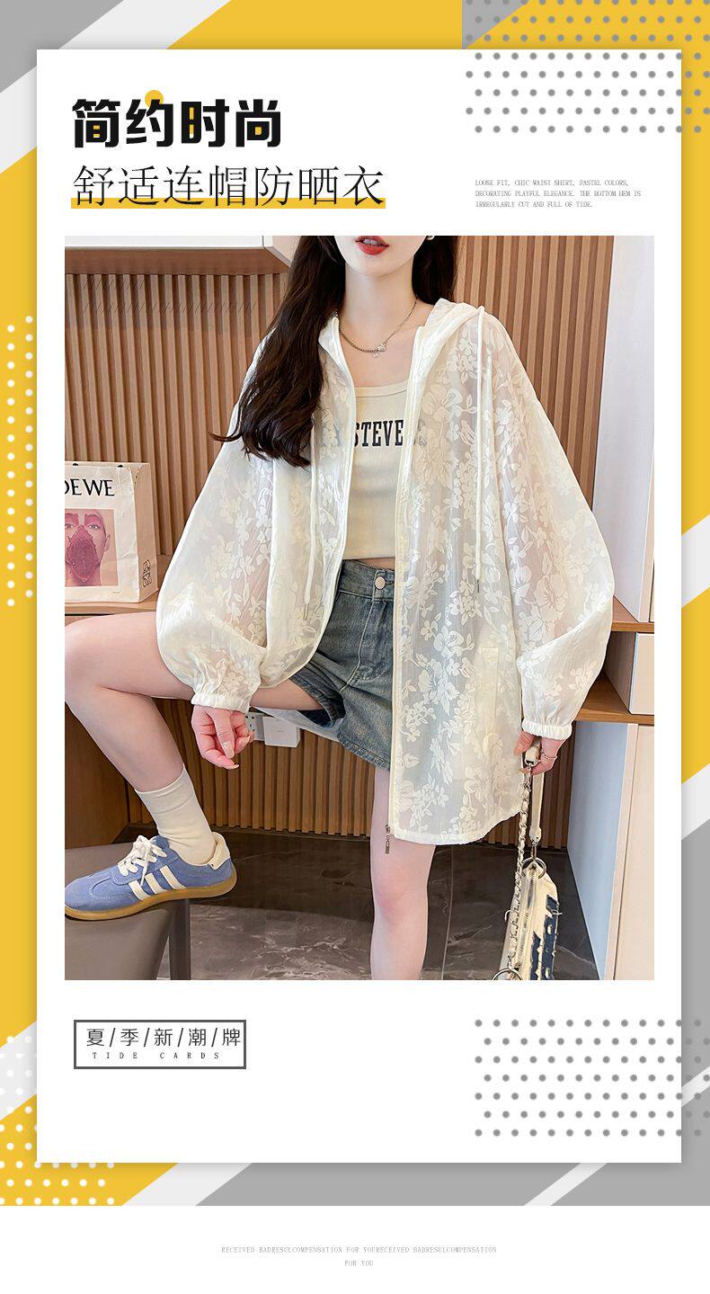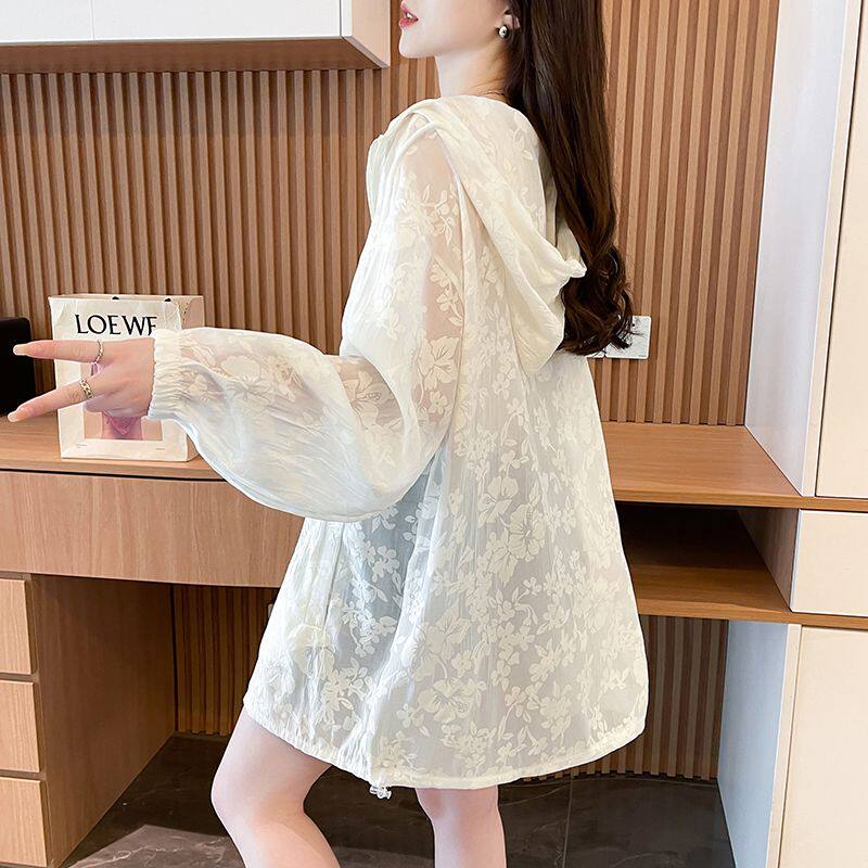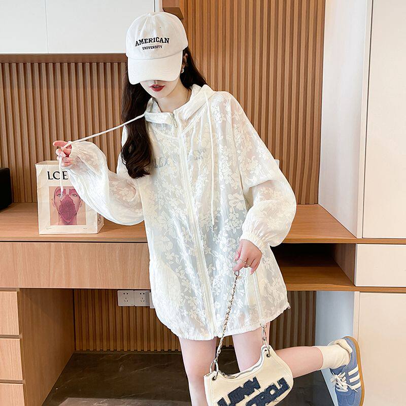 提花網紗連帽防曬衫女夏季輕奢薄款胖mm中長款開衫流行外套上衣服