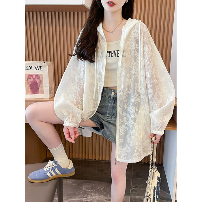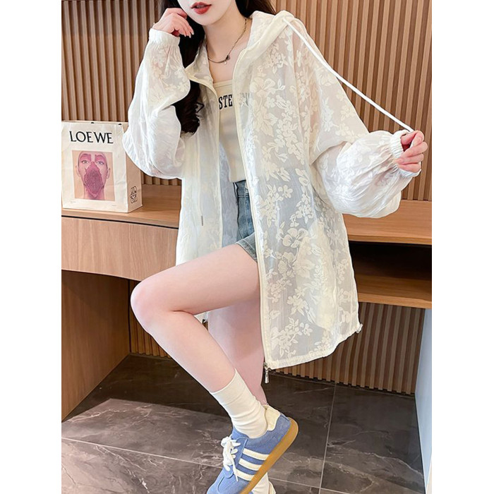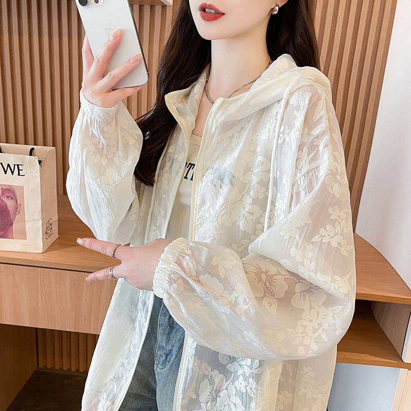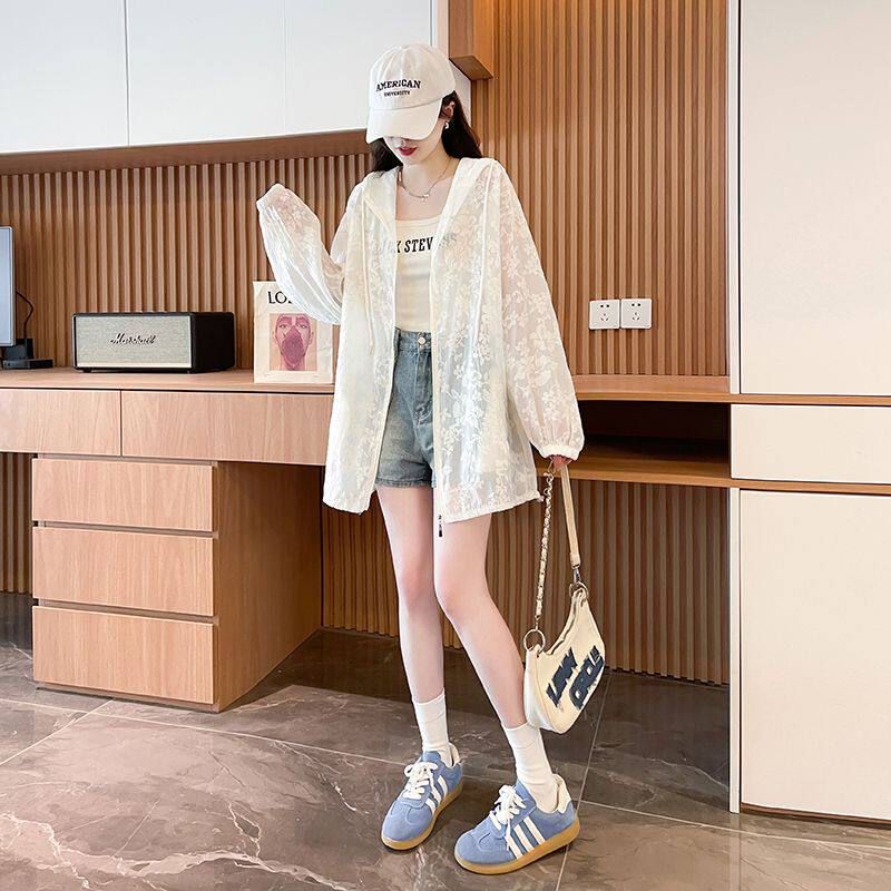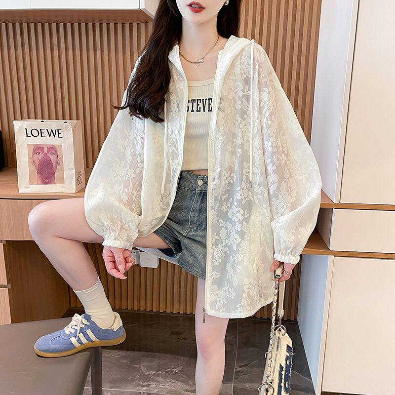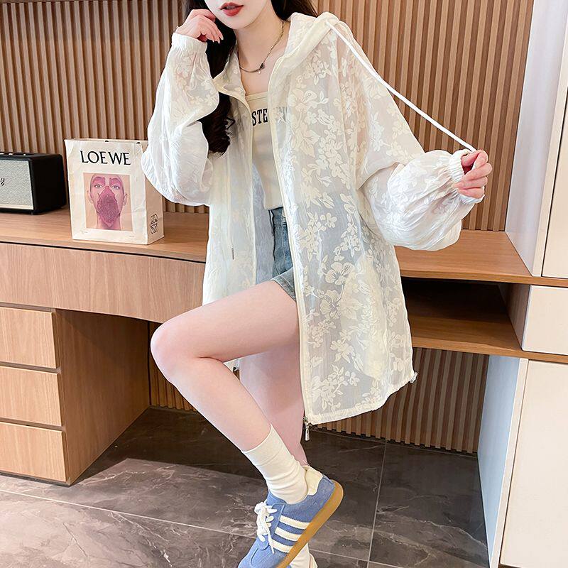 提花網紗連帽防曬衫女夏季輕奢薄款胖mm中長款開衫流行外套上衣服
