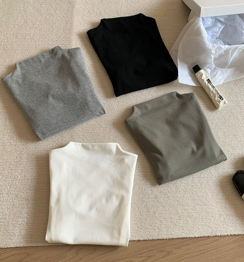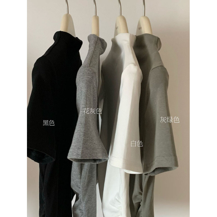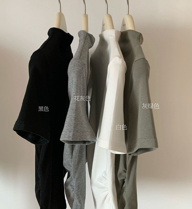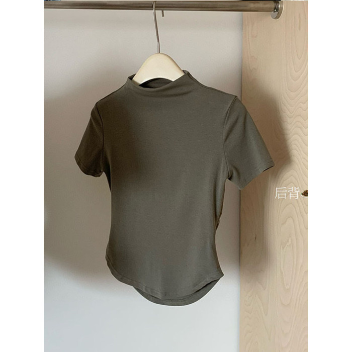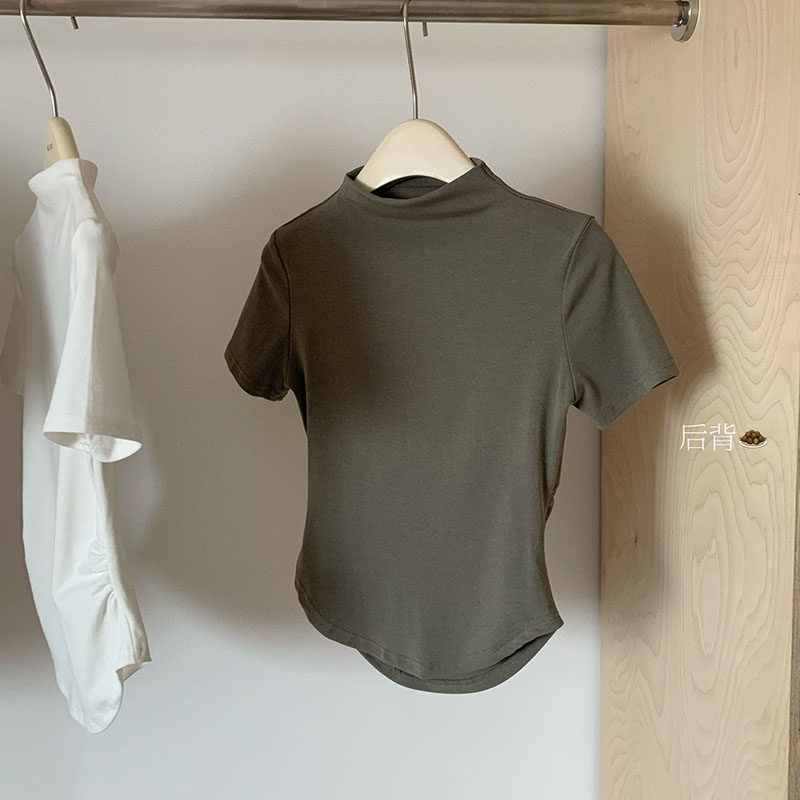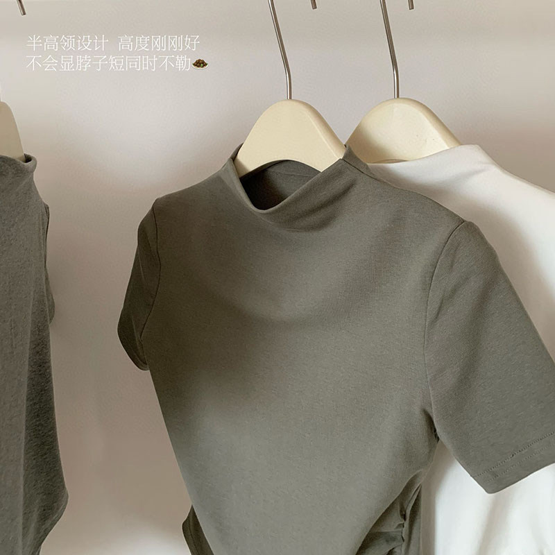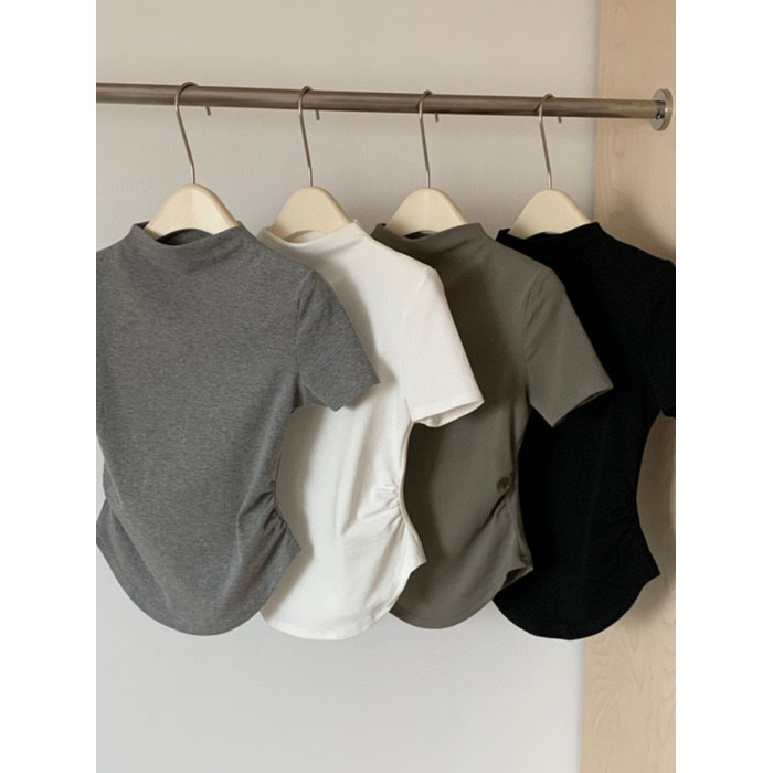 南油高級女裝褶皺收腰半高領短袖正肩T恤設計感辣妹純色上衣