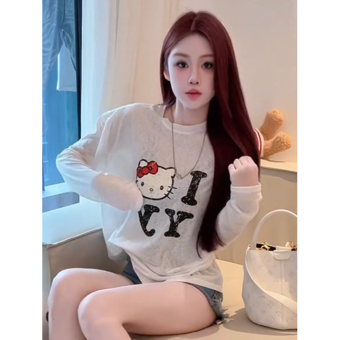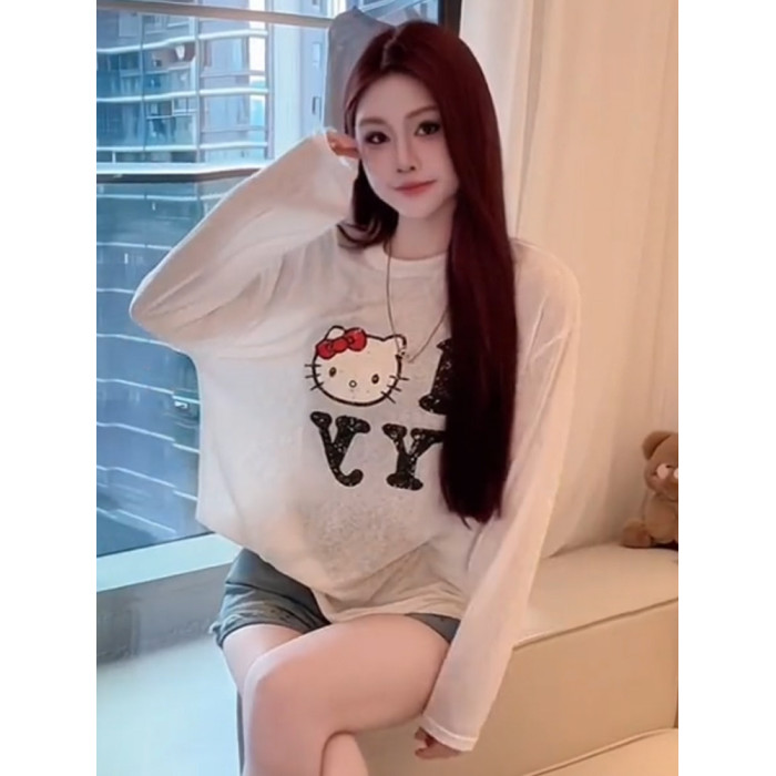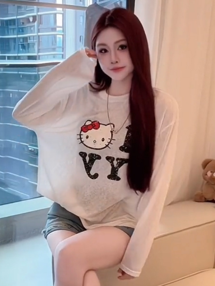 2025夏季圓領薄款微透貓咪印花長袖防曬衫女新款寬鬆顯瘦百搭上衣