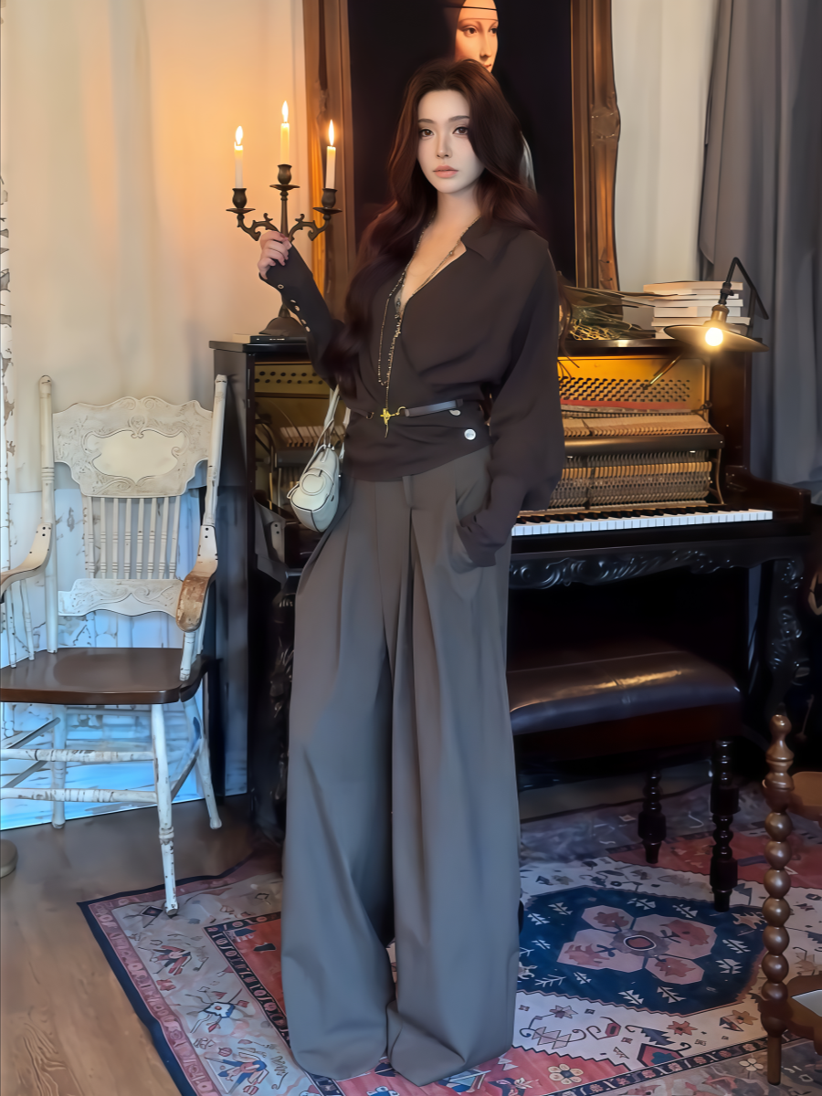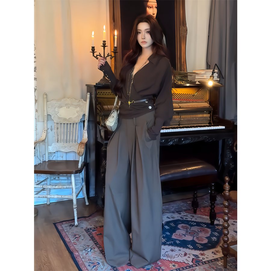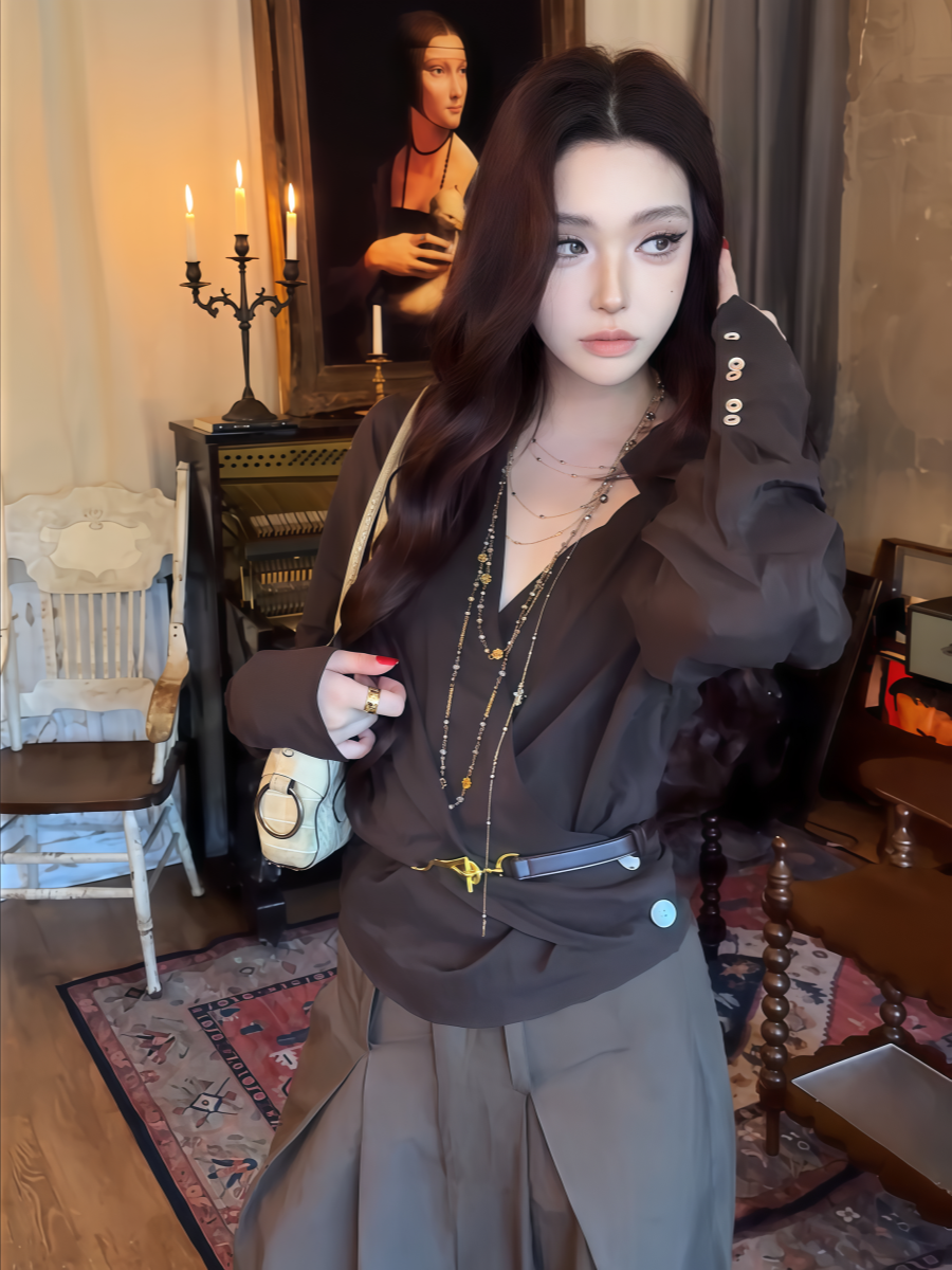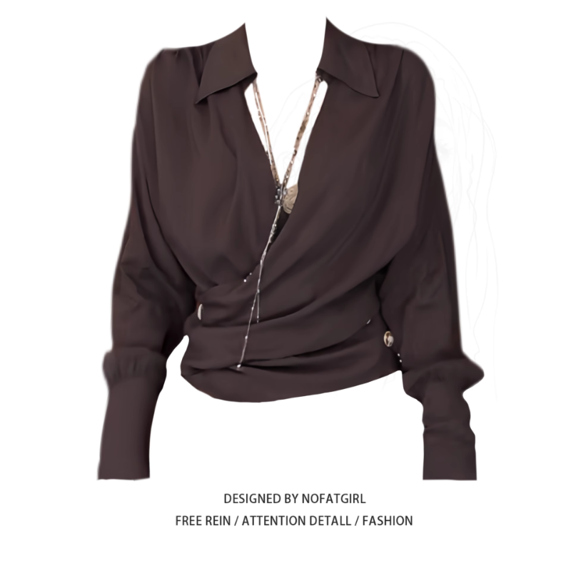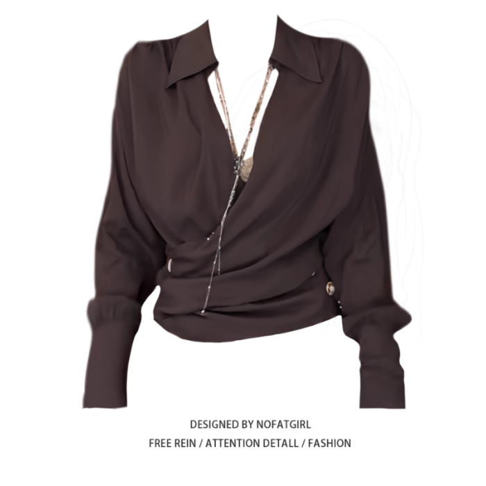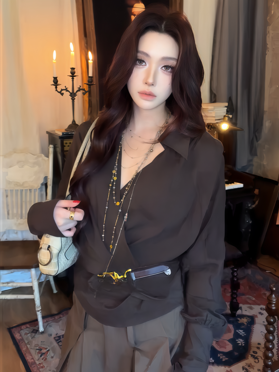 大碼胖MM性感辣妹交叉V領收腰咖色長袖襯衫早秋新款修身顯瘦上衣