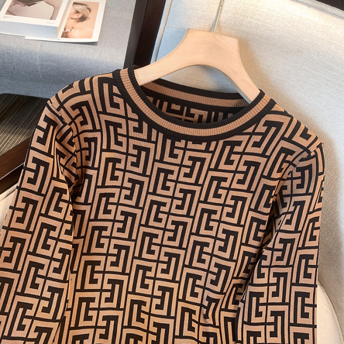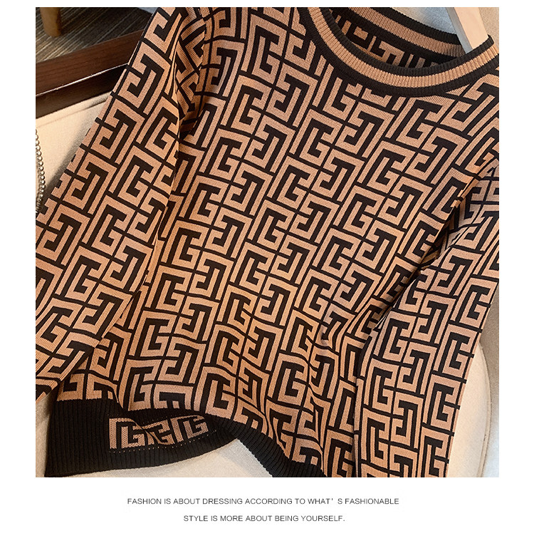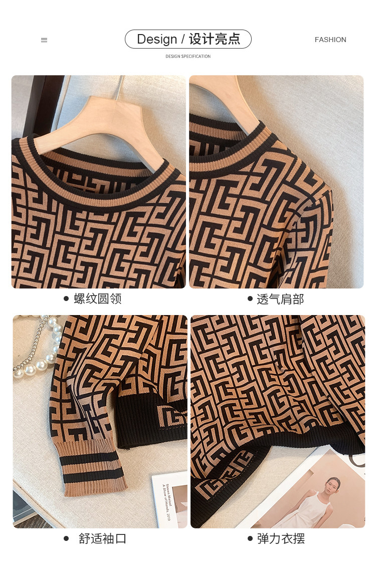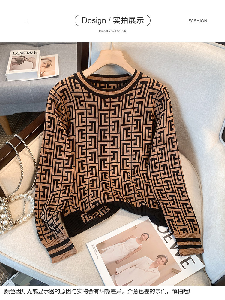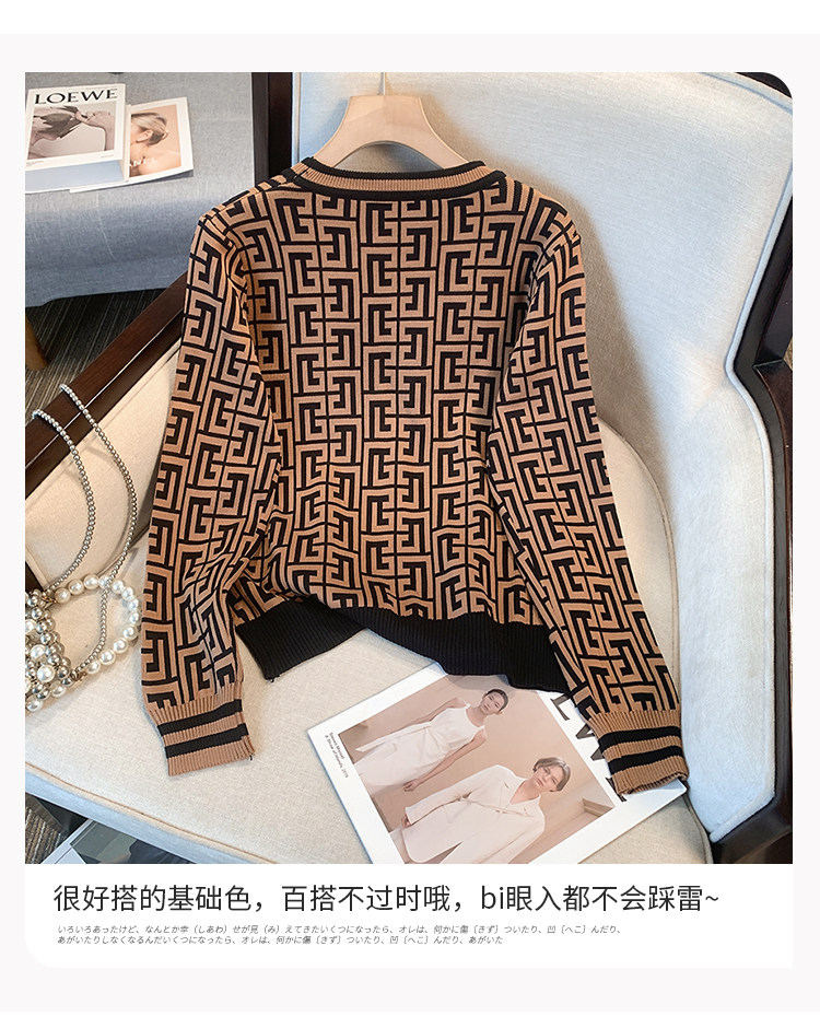 撿漏2024秋冬裝新款復古提花拼色長袖針織衫女裝圓領套頭打底毛衣