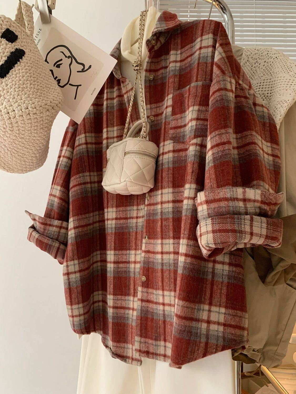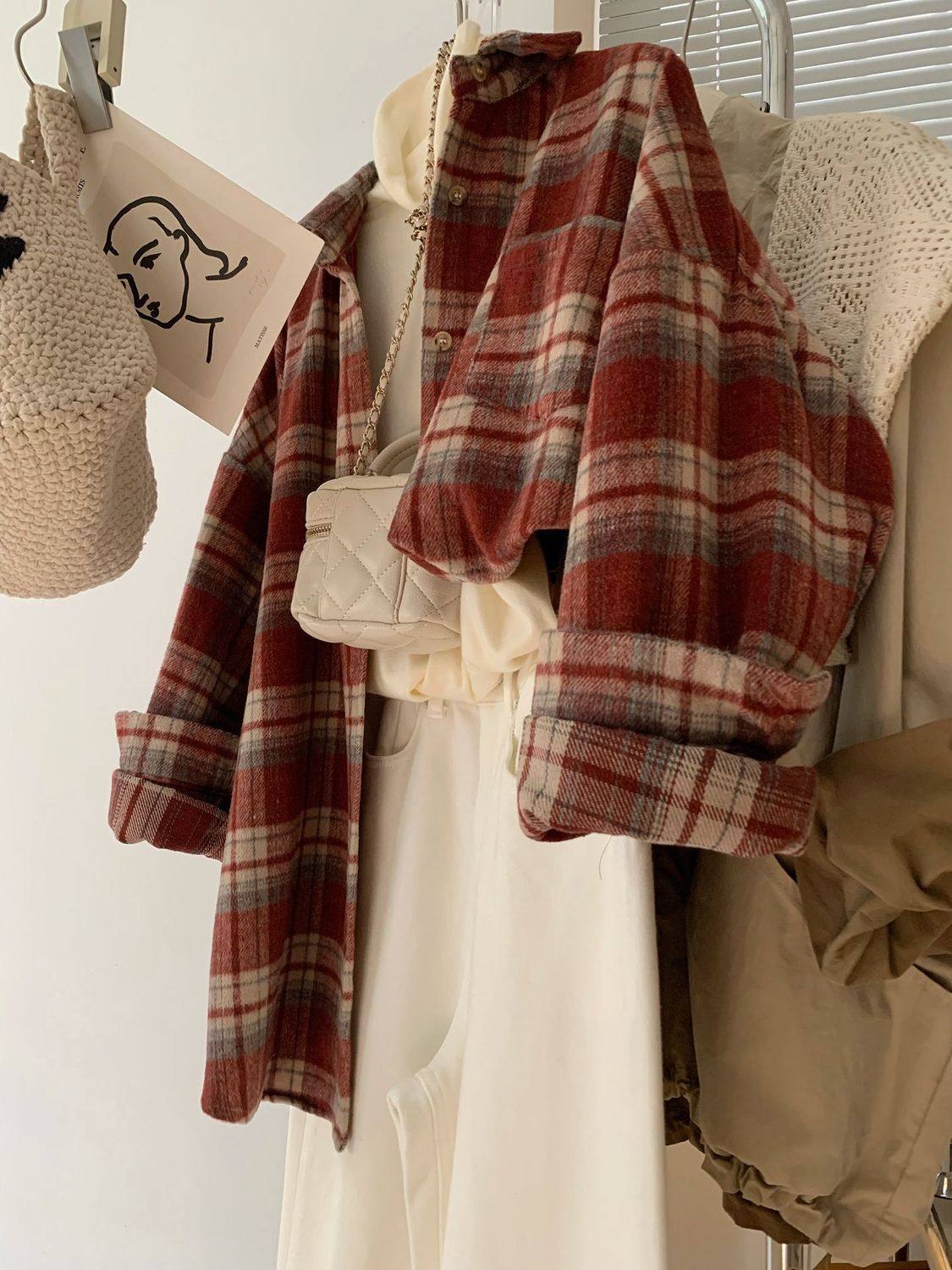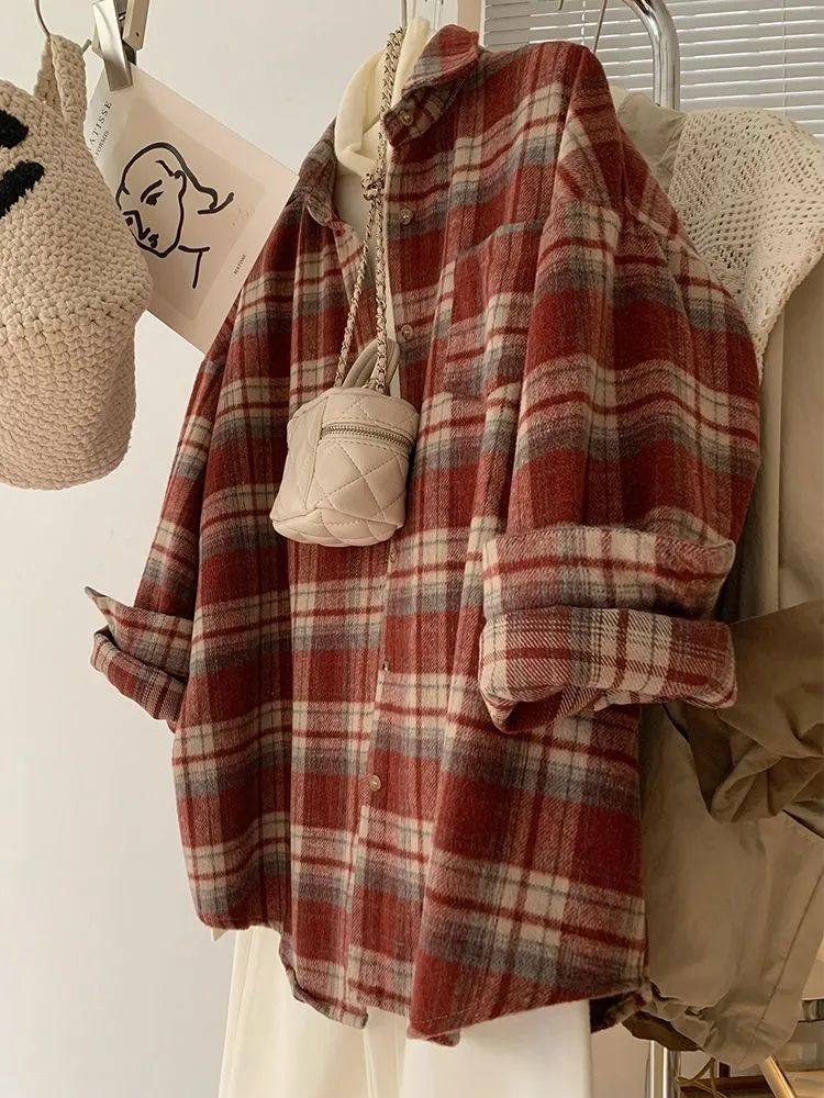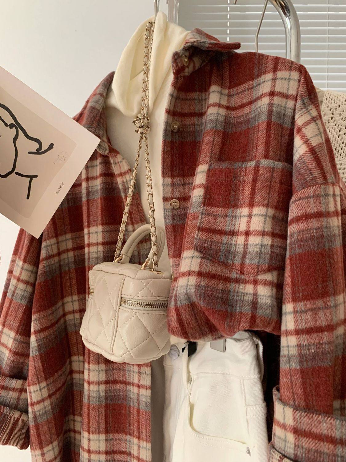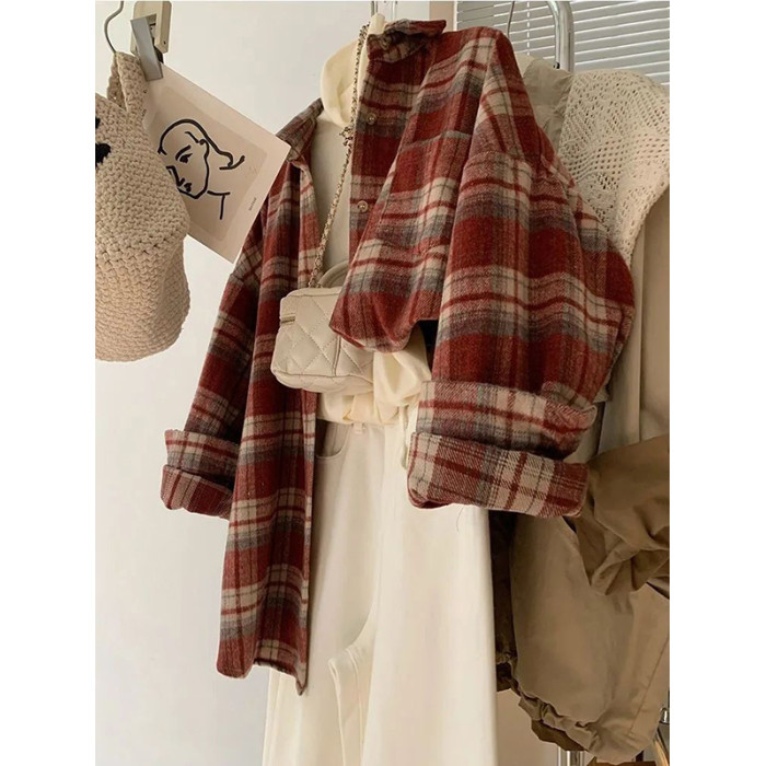 巨顯白!超好看紅色毛呢格子襯衫女時髦洋氣法式復古曡穿襯衣上衣