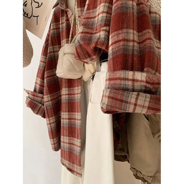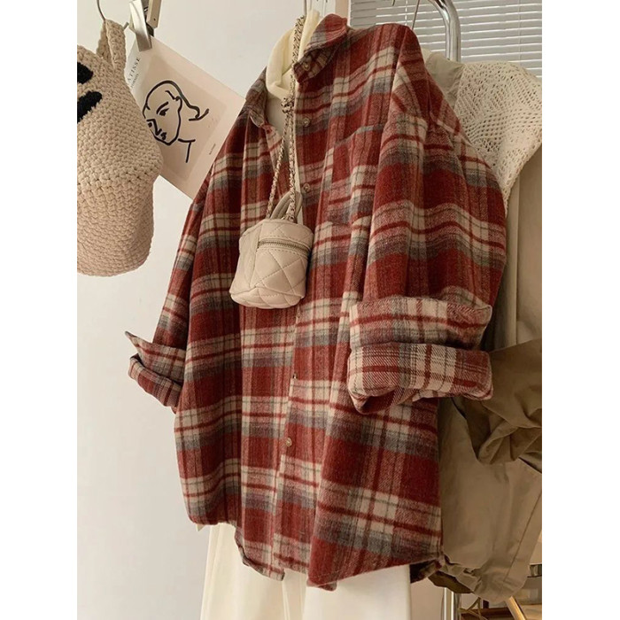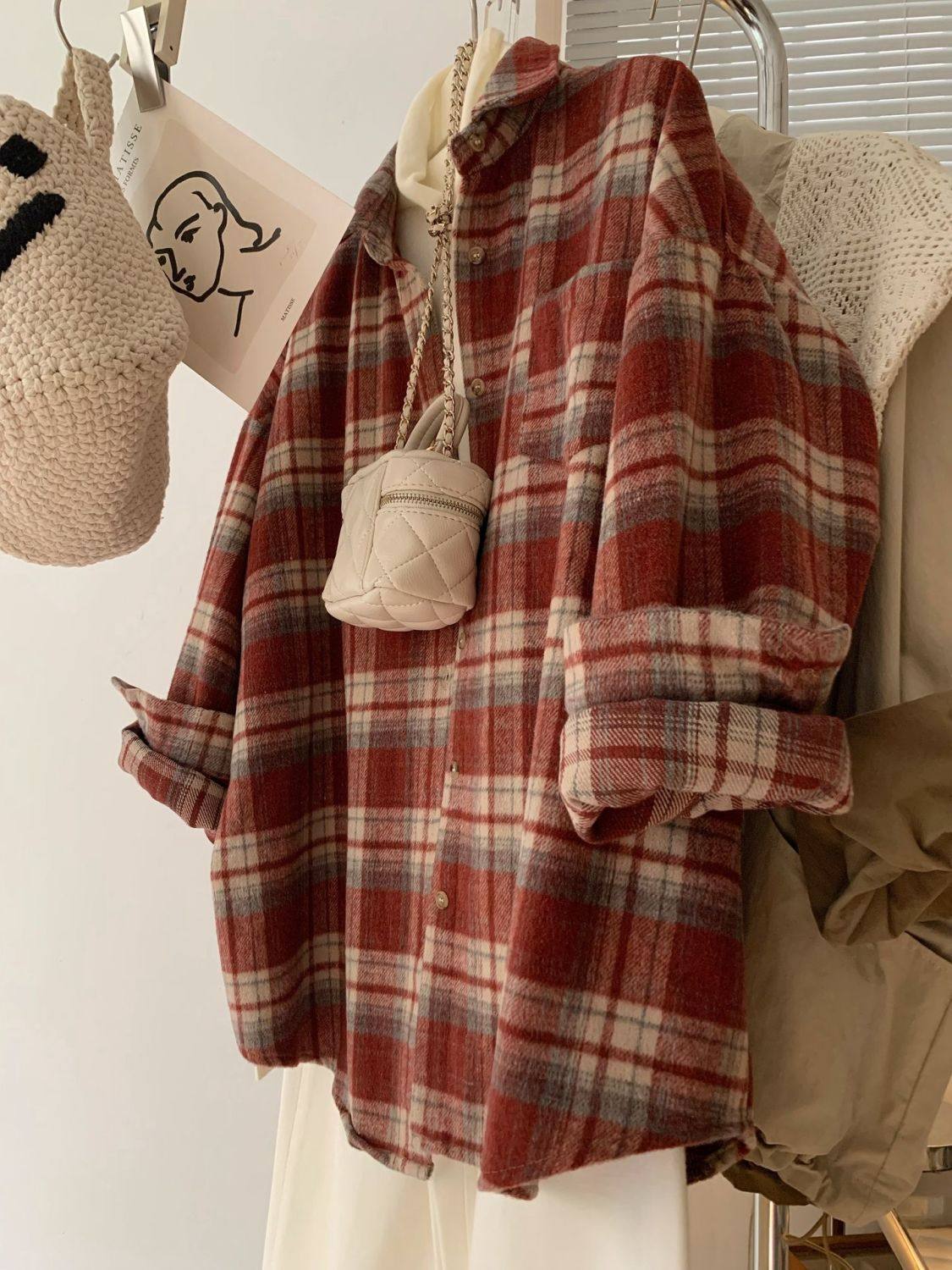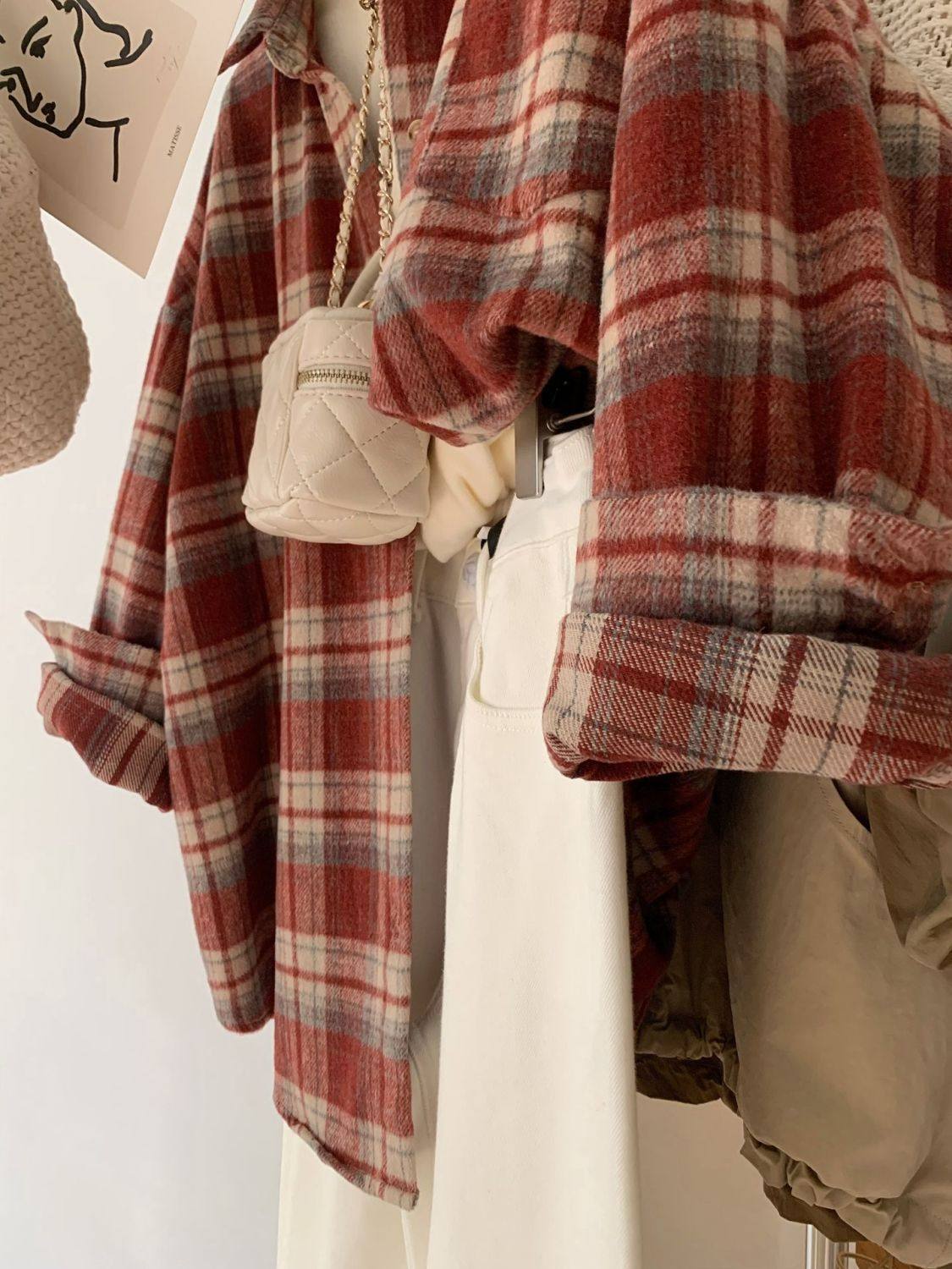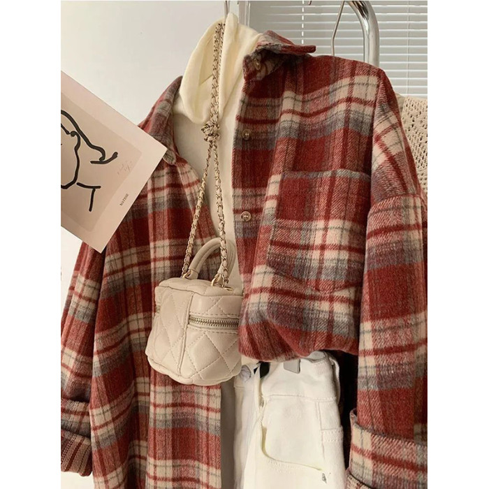 巨顯白!超好看紅色毛呢格子襯衫女時髦洋氣法式復古曡穿襯衣上衣