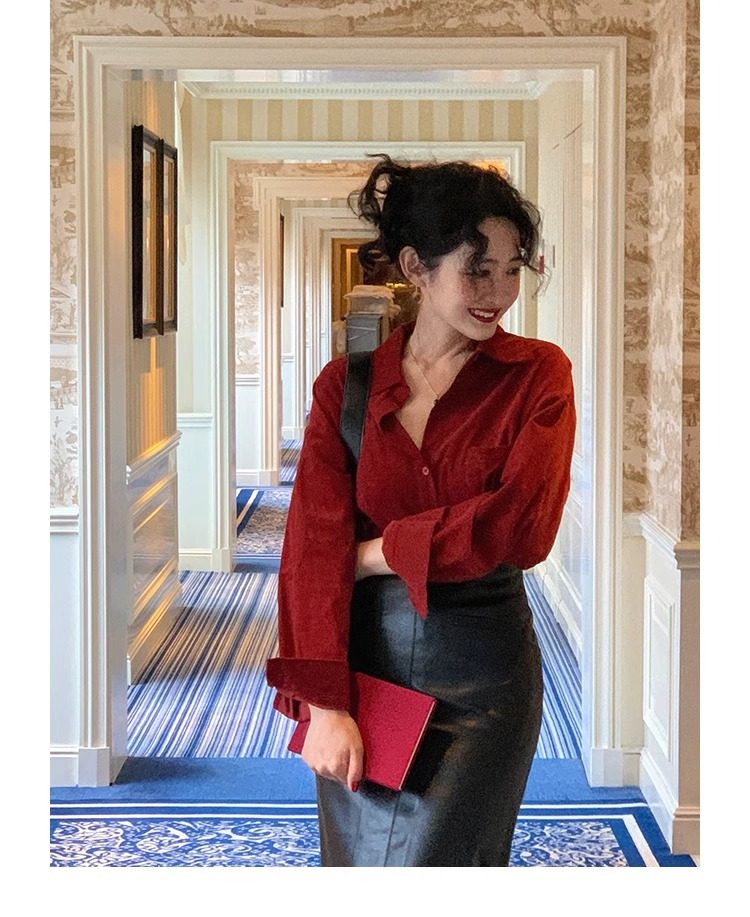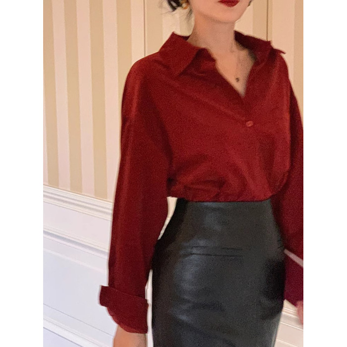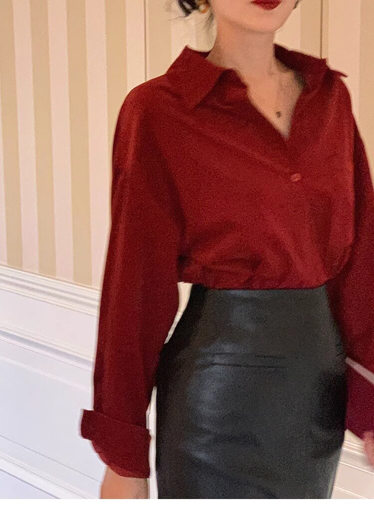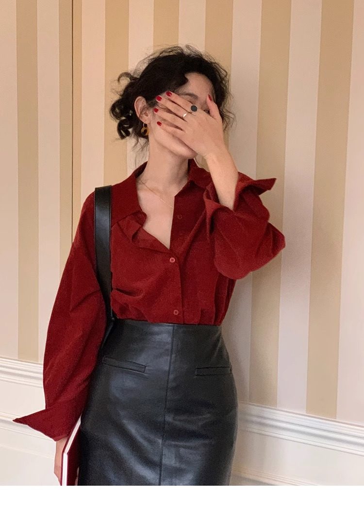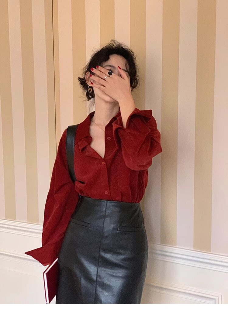 法式復古酒紅色長袖襯衫女2025春秋新款復古港風甜美上衣高級感
