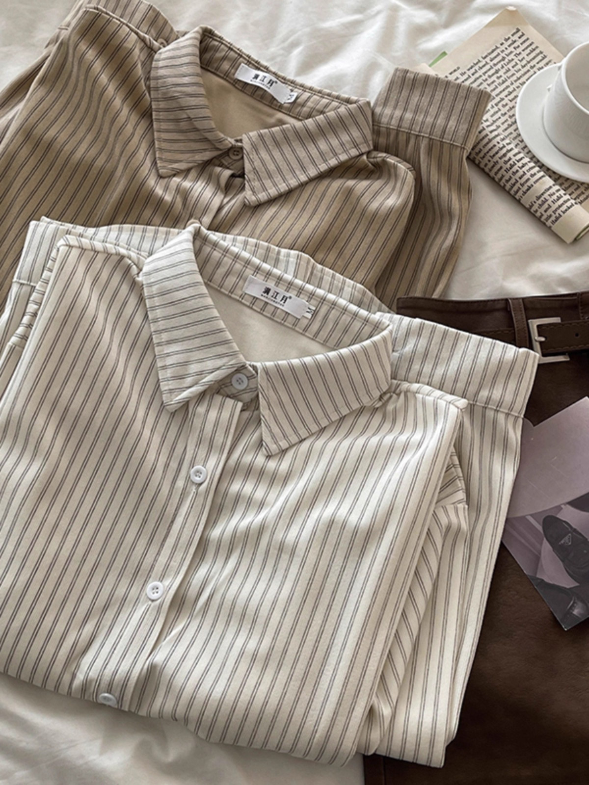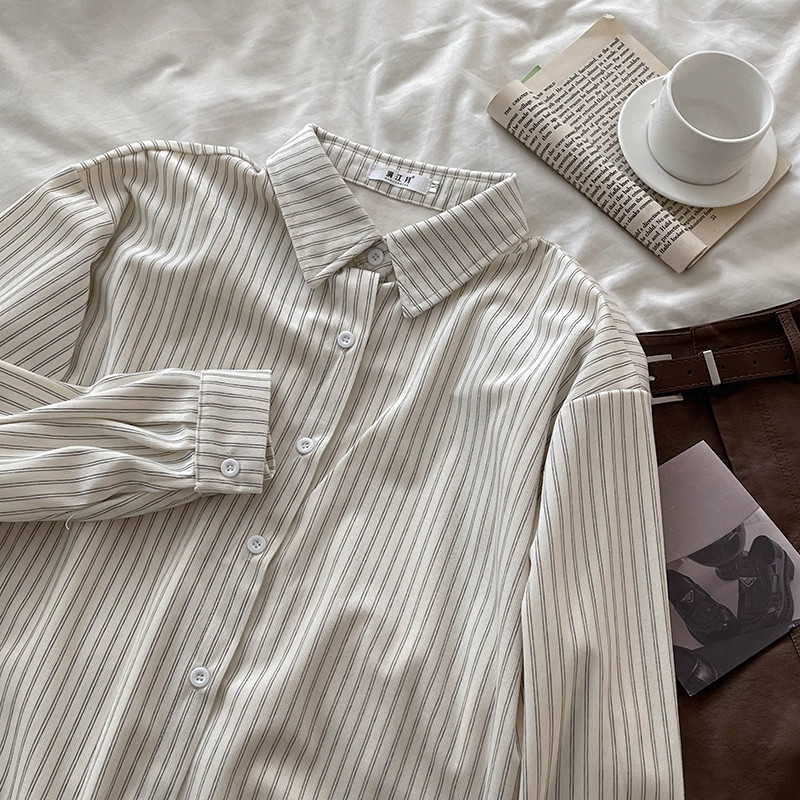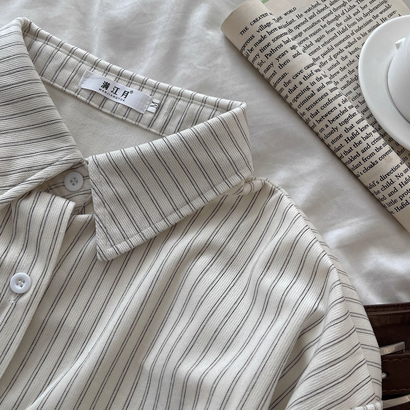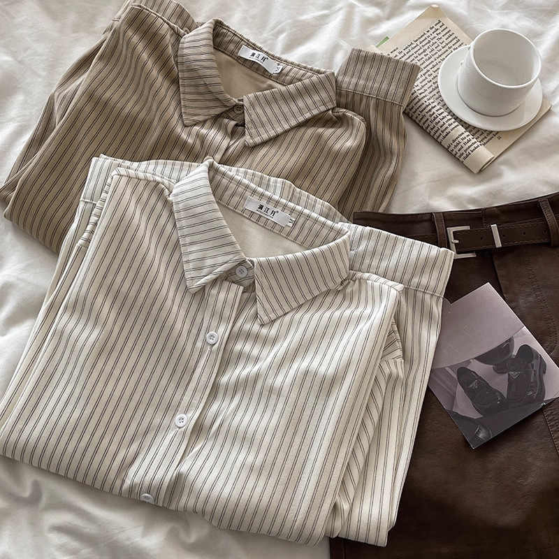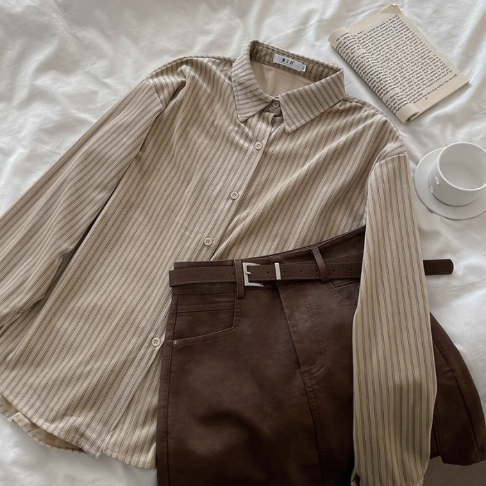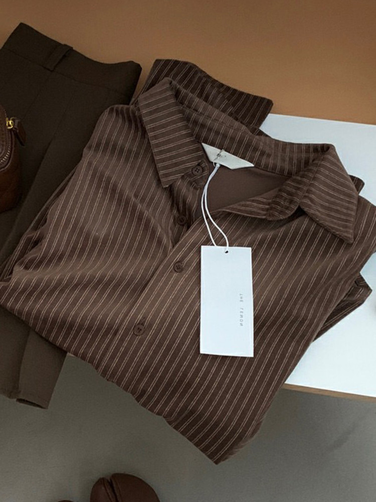 韓系慵懶風咖啡色條紋襯衫女春秋2025新款寬鬆燈芯絨曡穿長袖上衣