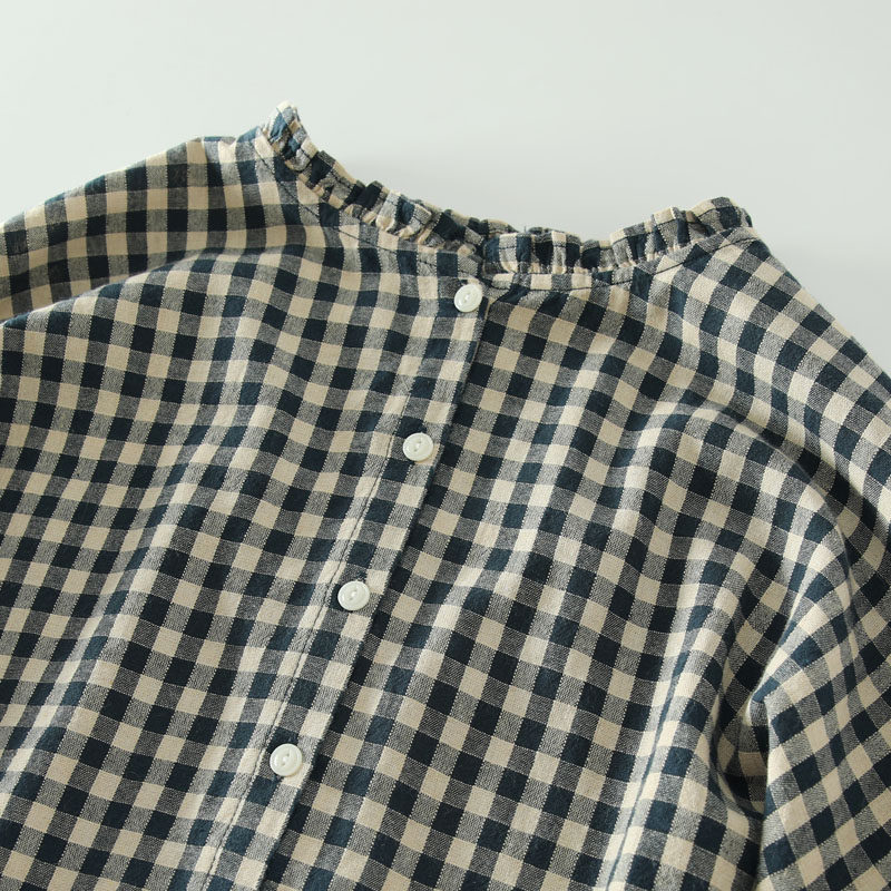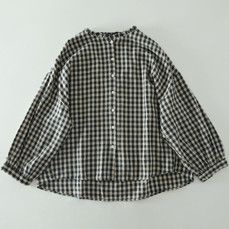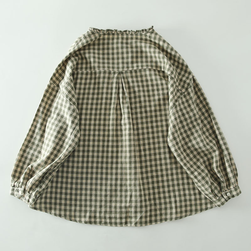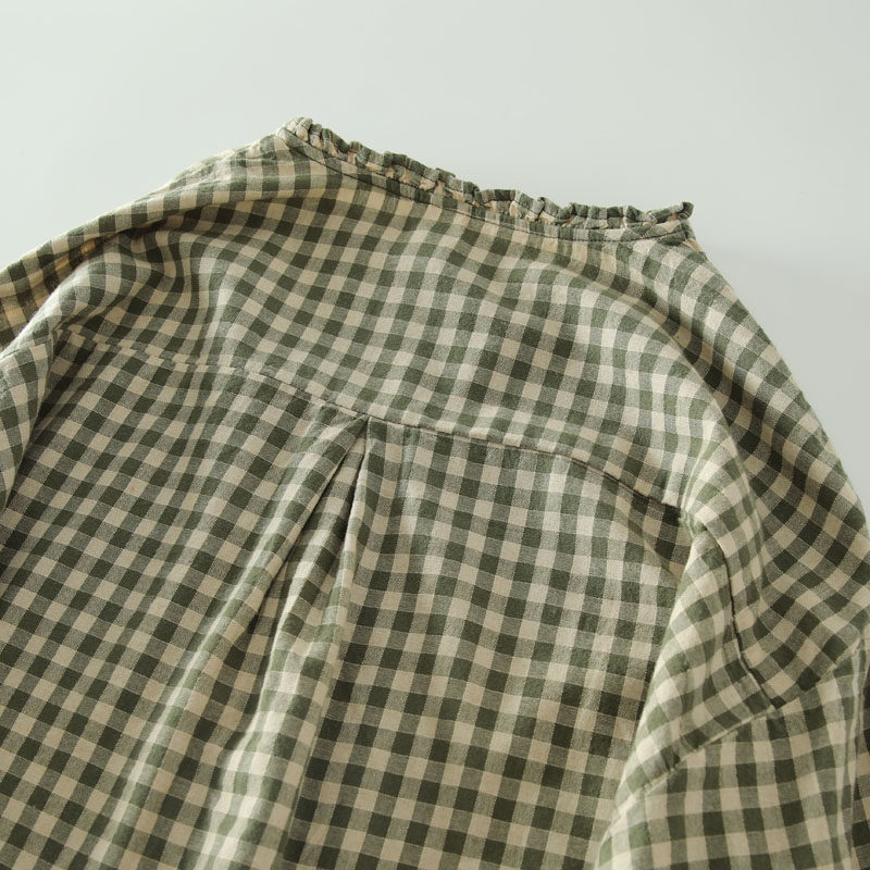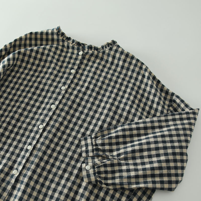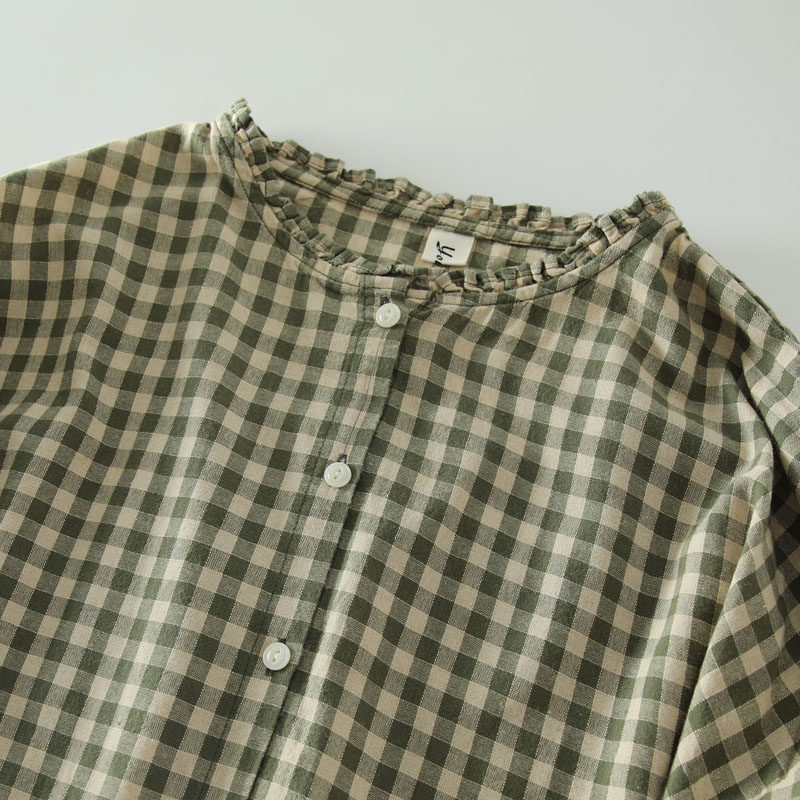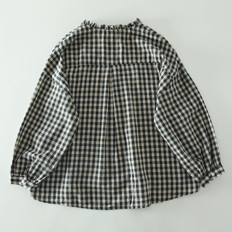 甜美日系木耳花邊領純棉格子長袖襯衫女寬鬆百搭小衫上衣春秋新款