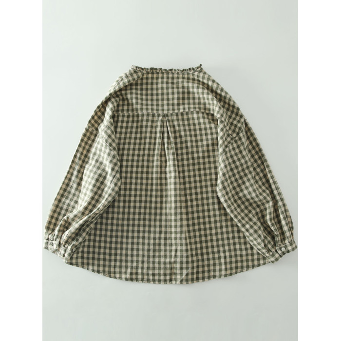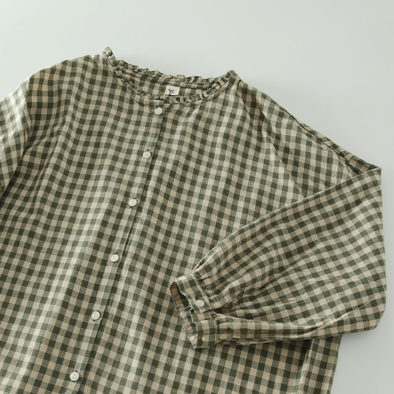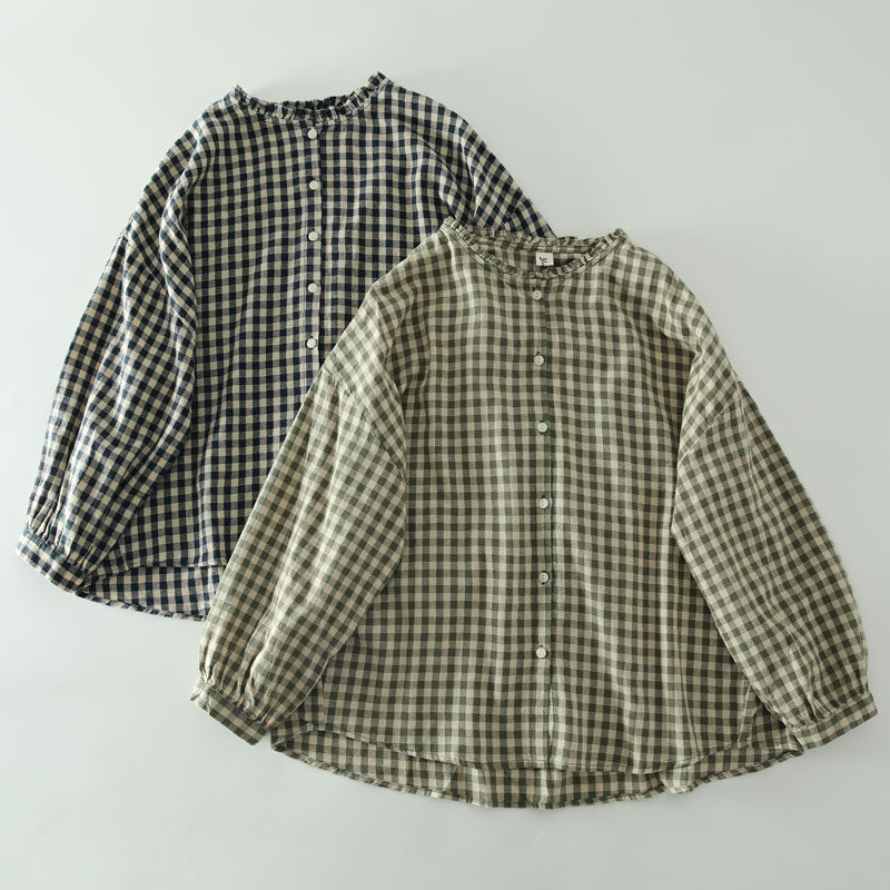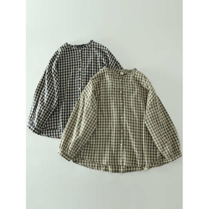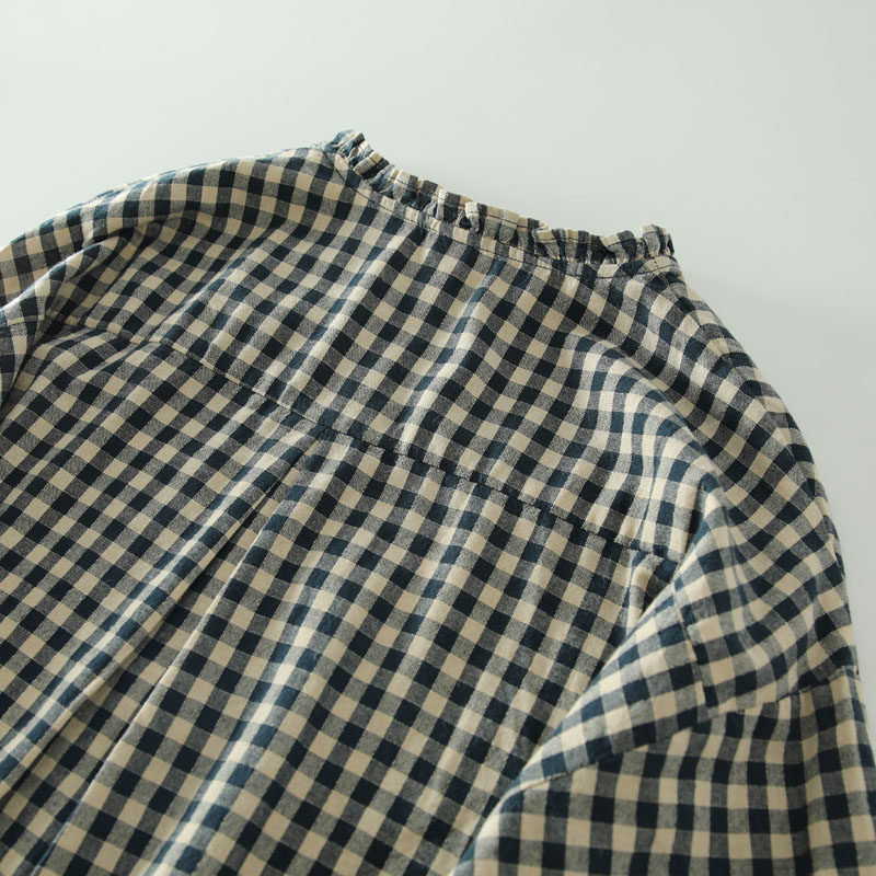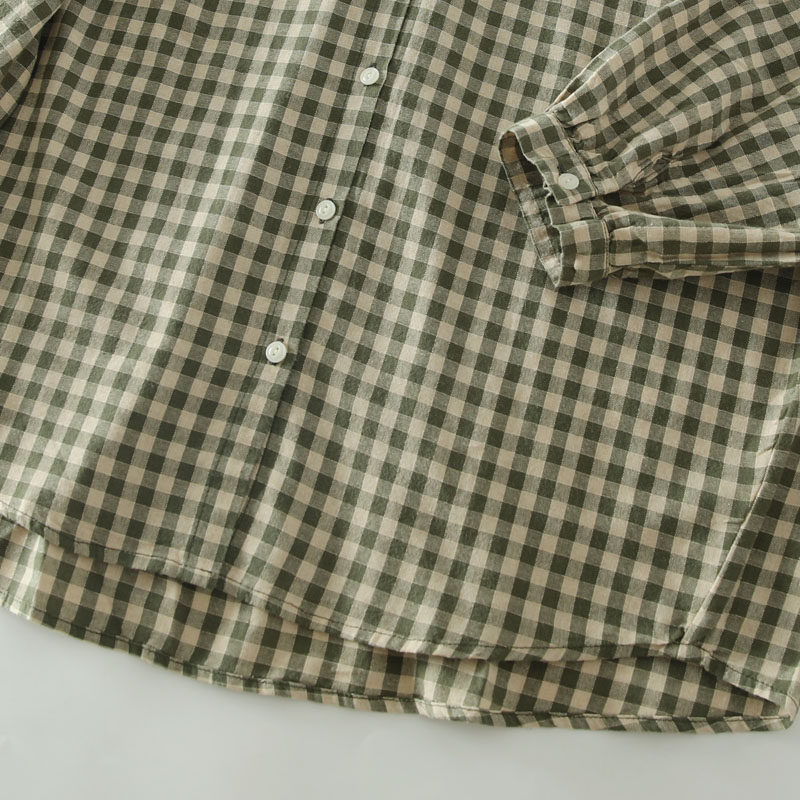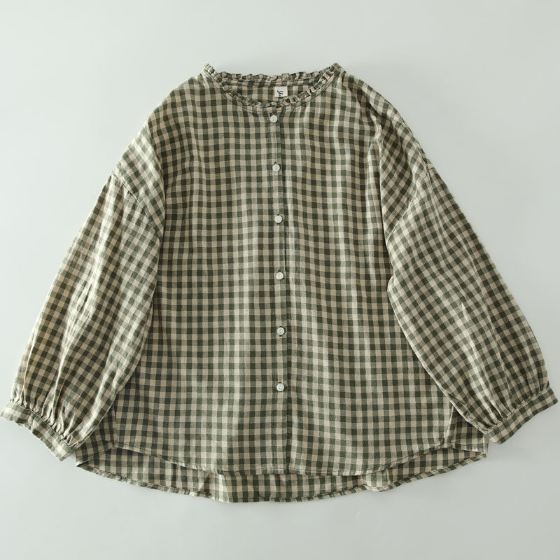 甜美日系木耳花邊領純棉格子長袖襯衫女寬鬆百搭小衫上衣春秋新款