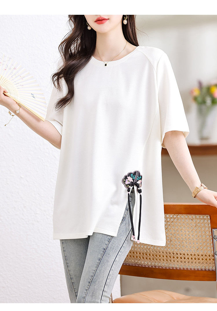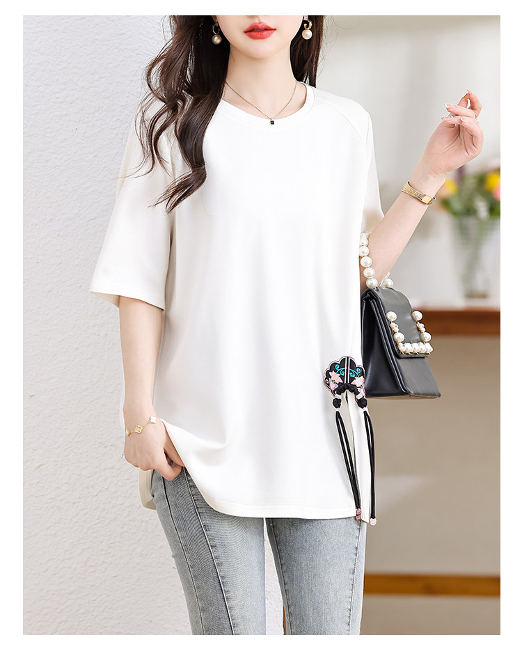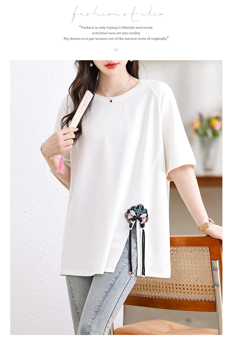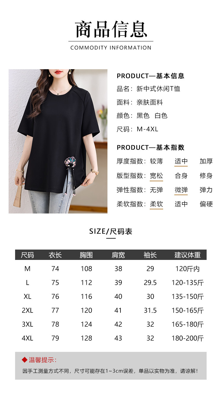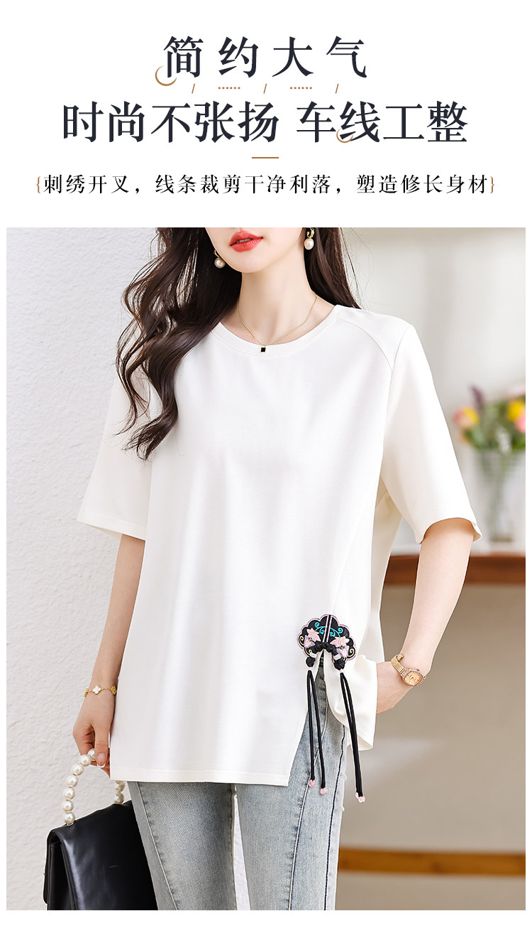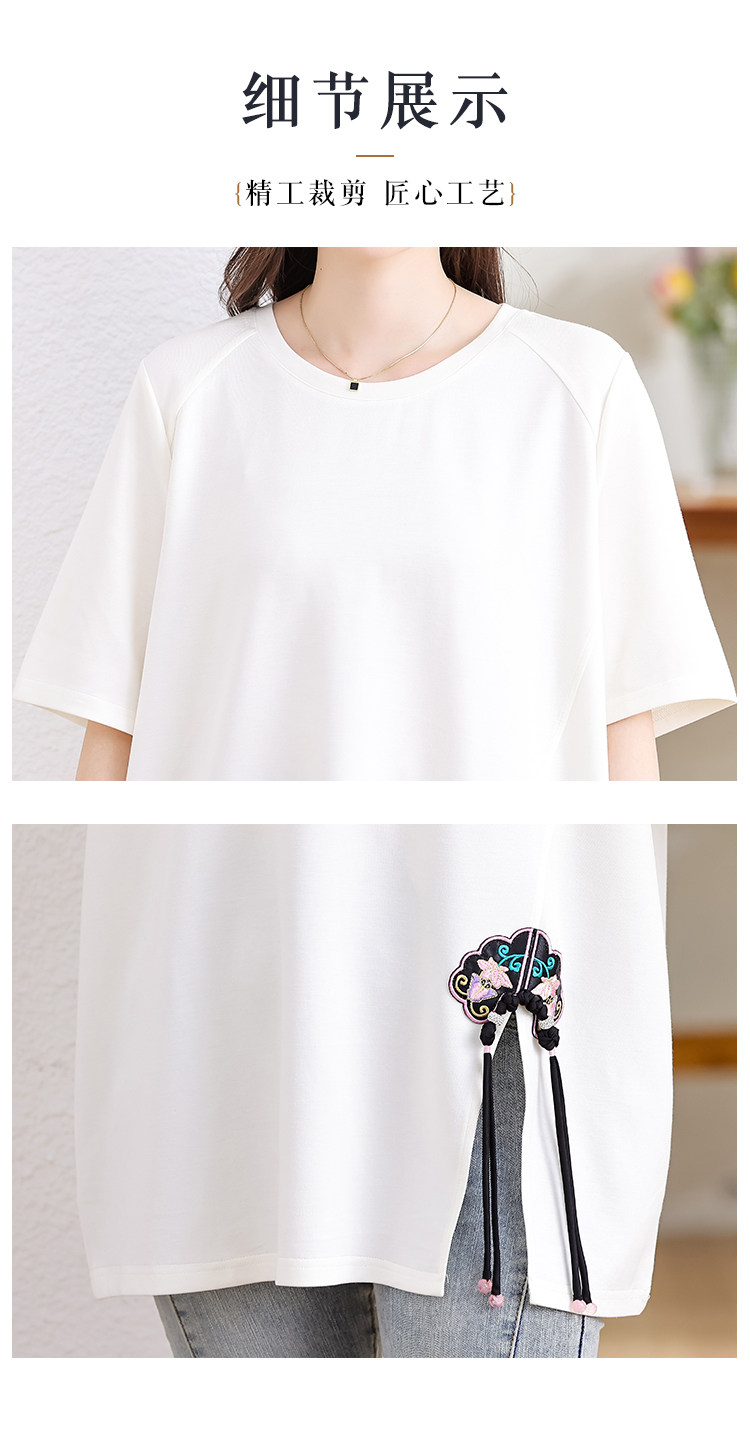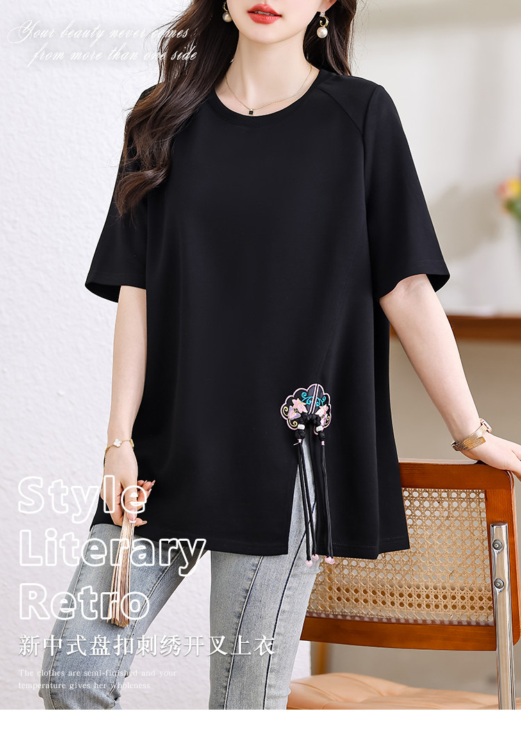 九月陌墨盤釦開叉短袖T恤女夏季國風寬鬆上衣2024新款大碼女裝潮