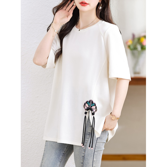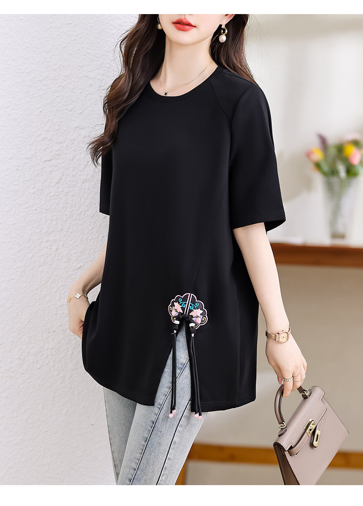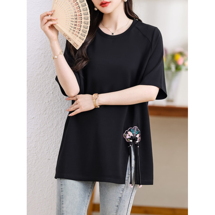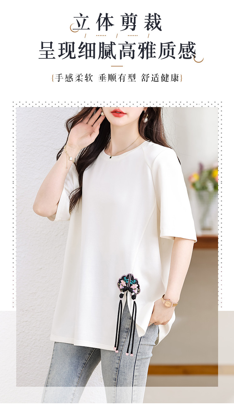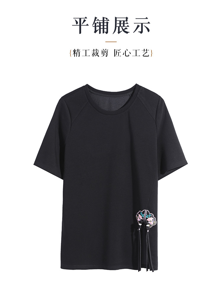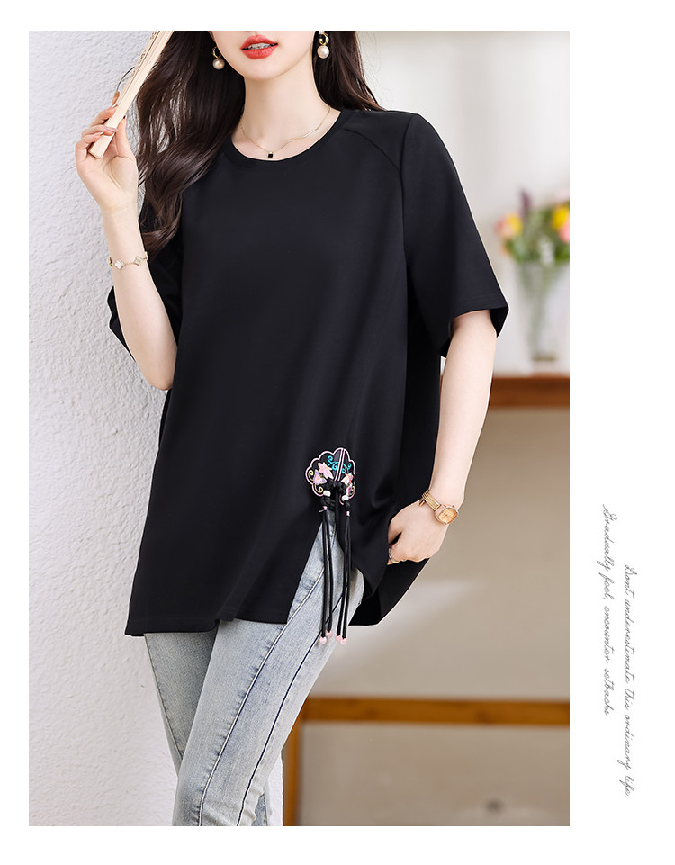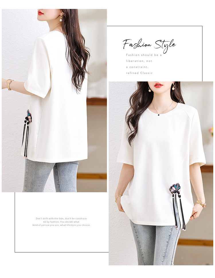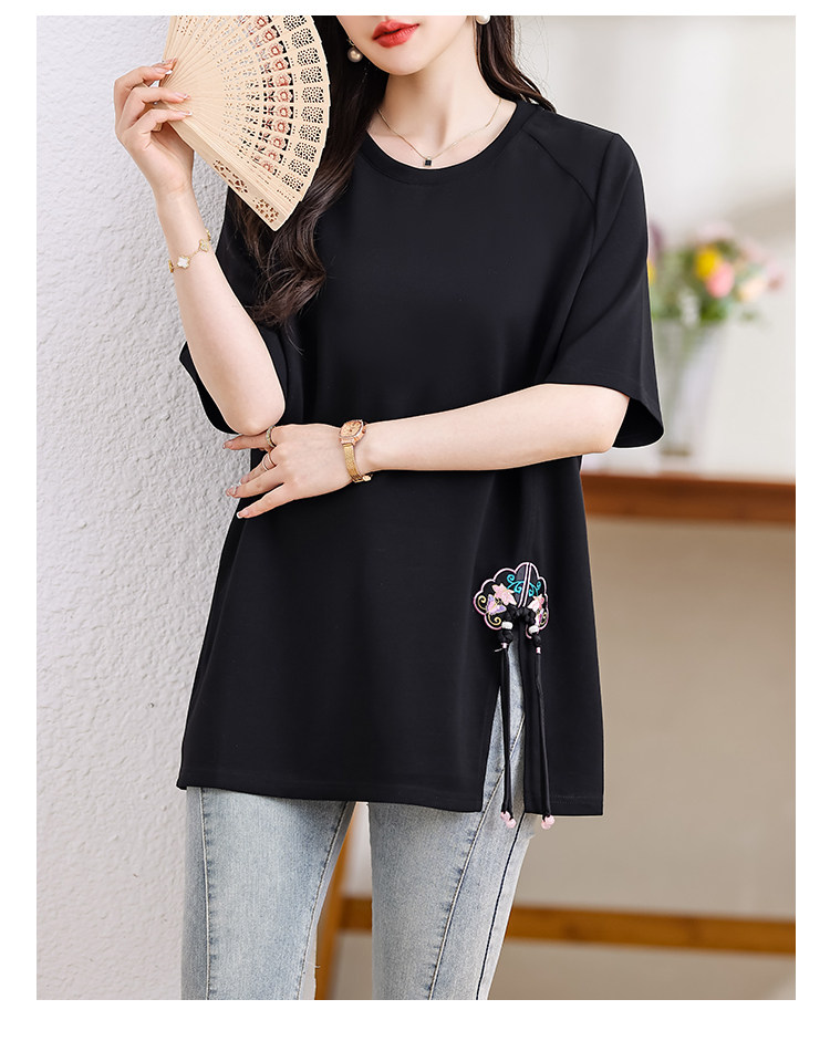 九月陌墨盤釦開叉短袖T恤女夏季國風寬鬆上衣2024新款大碼女裝潮