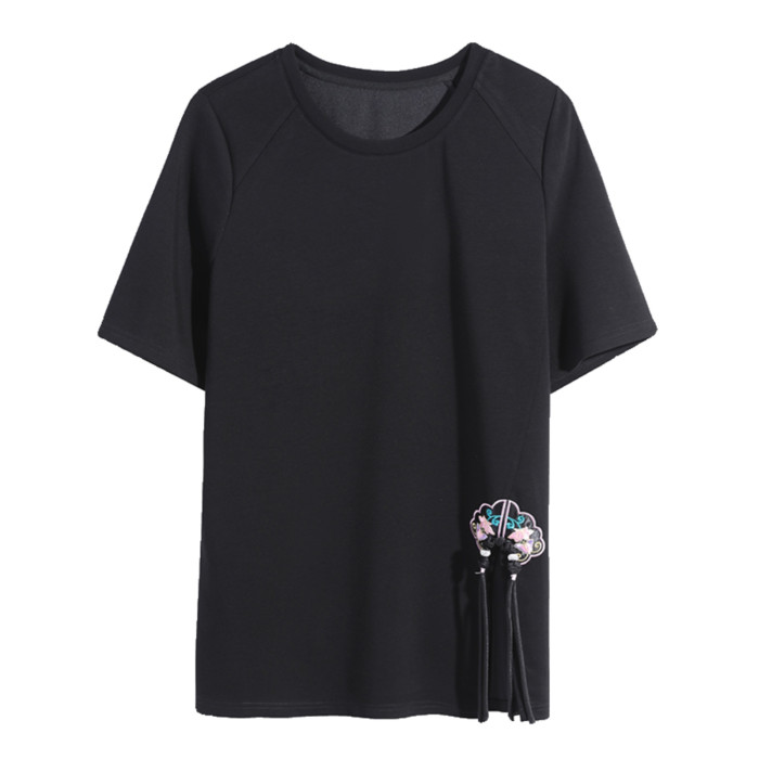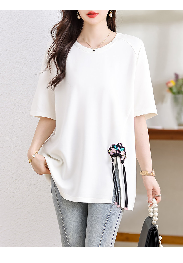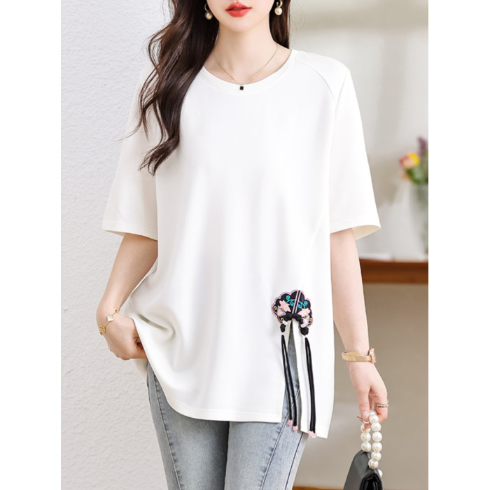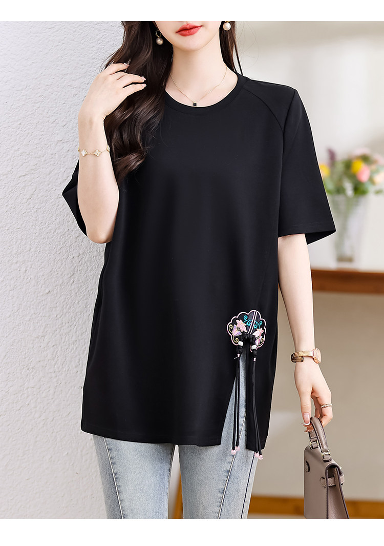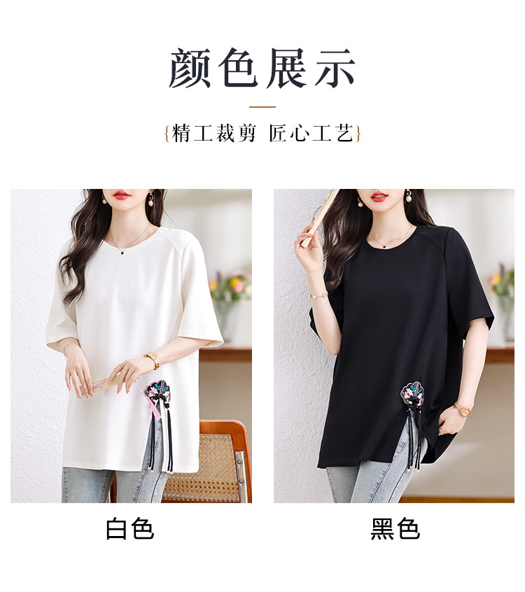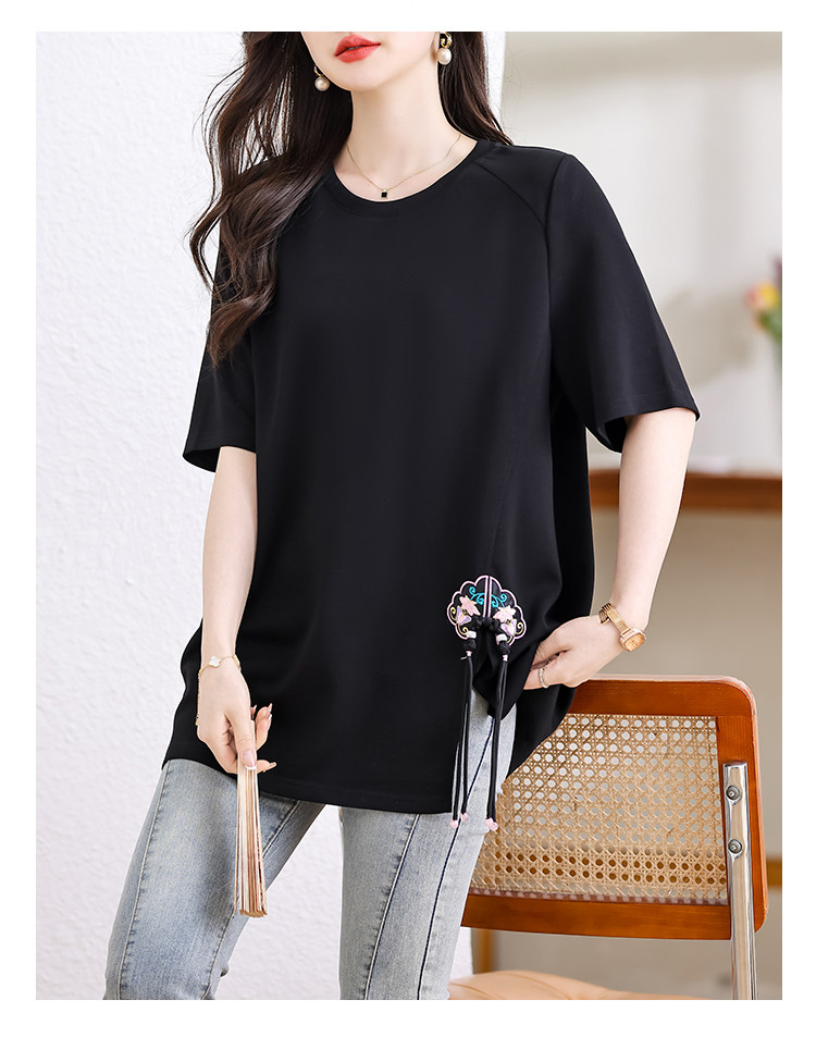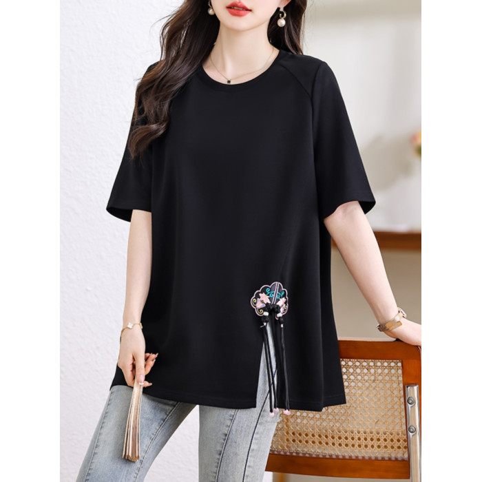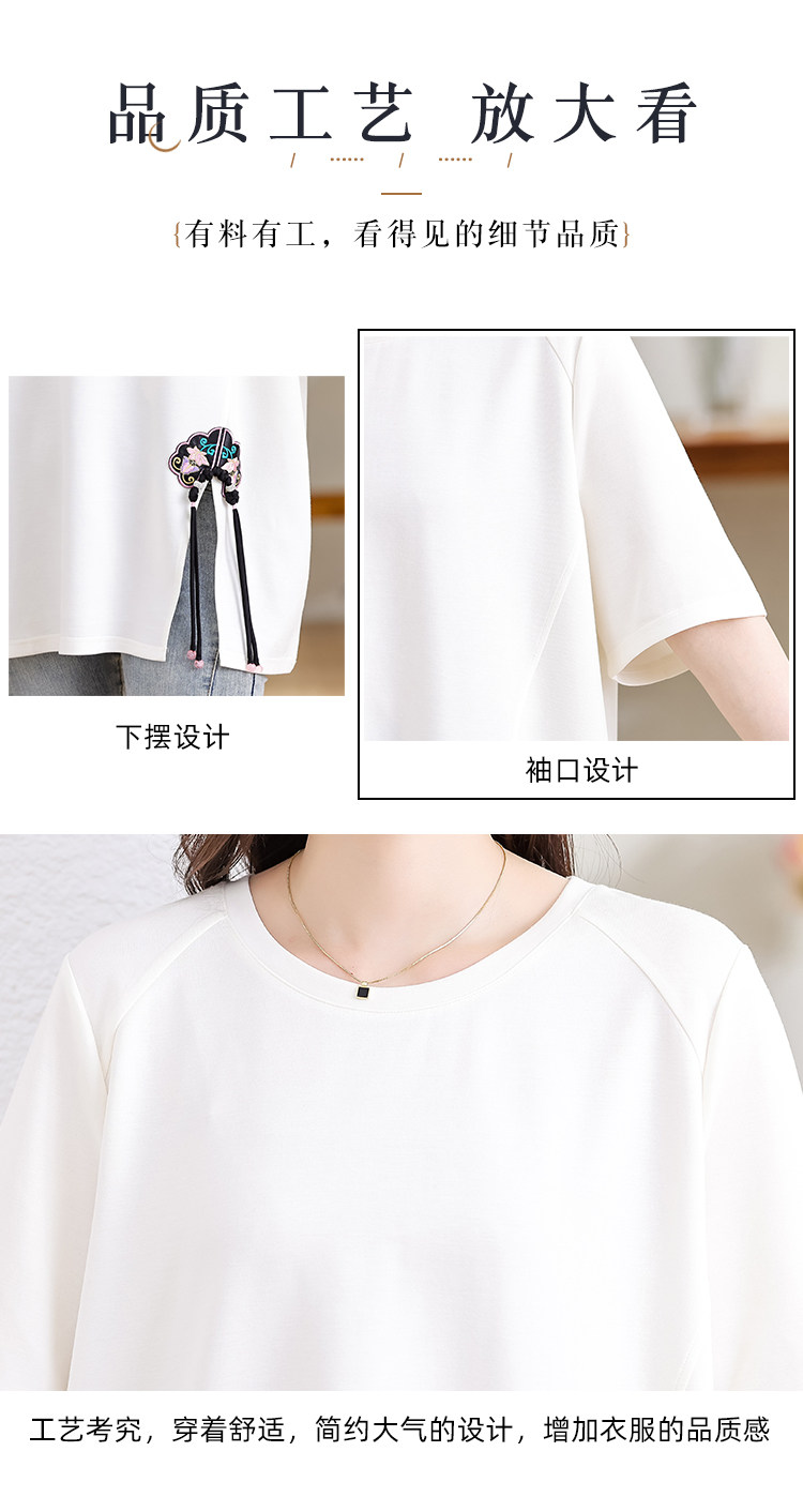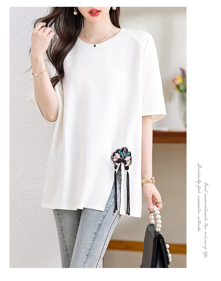 九月陌墨盤釦開叉短袖T恤女夏季國風寬鬆上衣2024新款大碼女裝潮