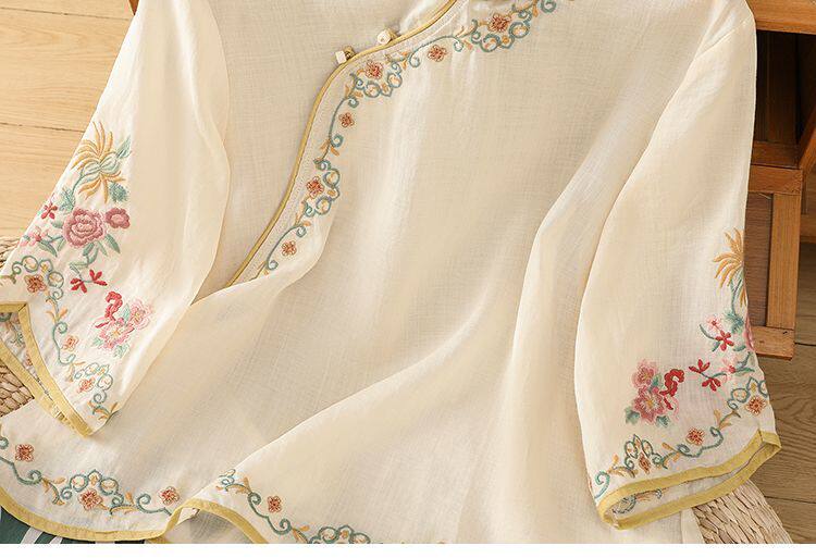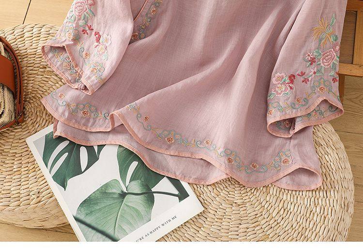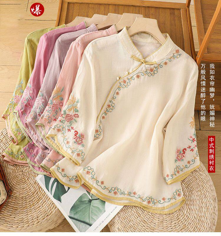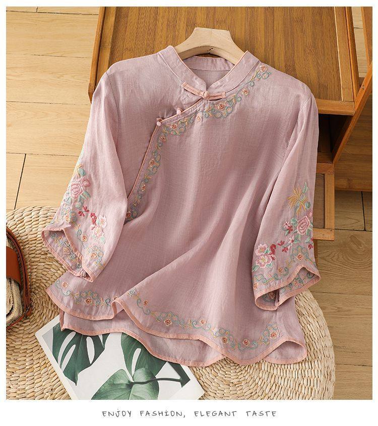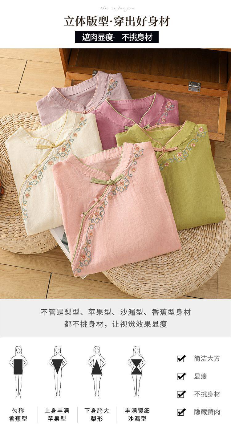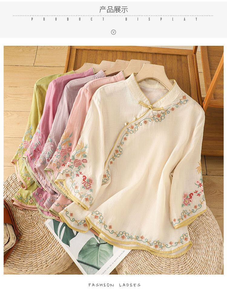 民國風文藝斜襟刺綉棉麻媽媽上衣女春夏季盤釦拼色顯瘦減齡七分袖