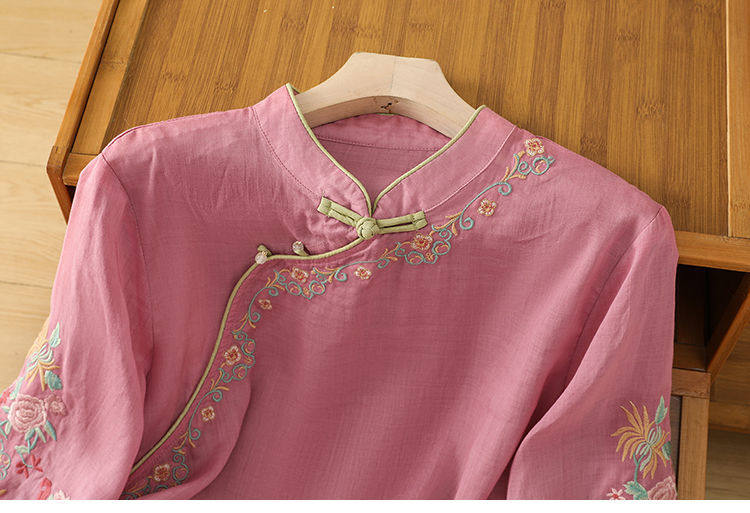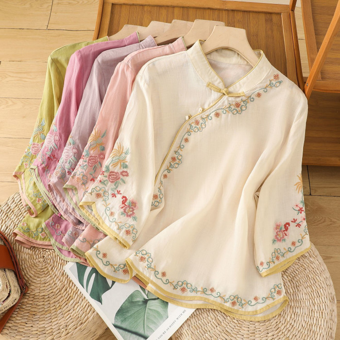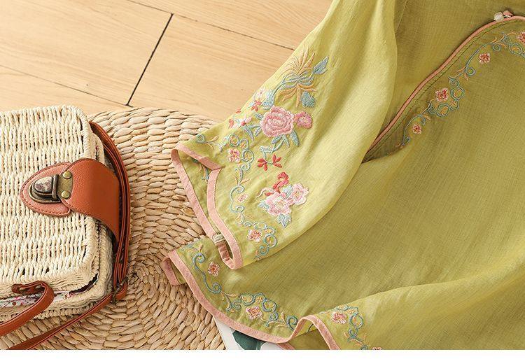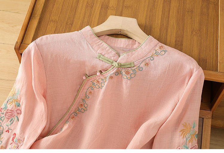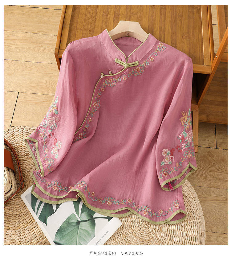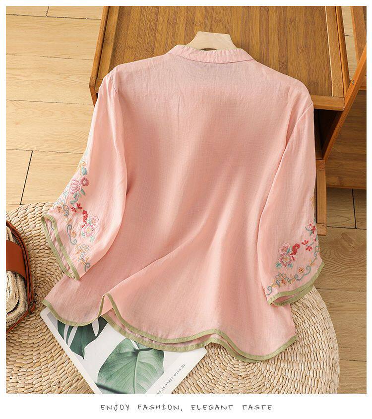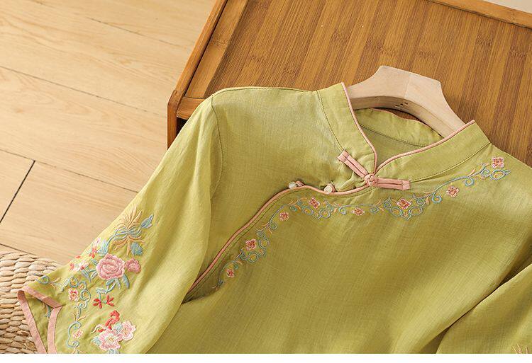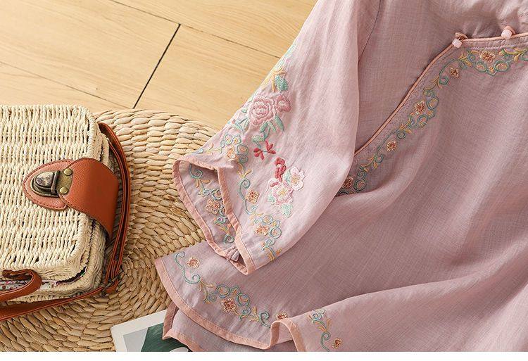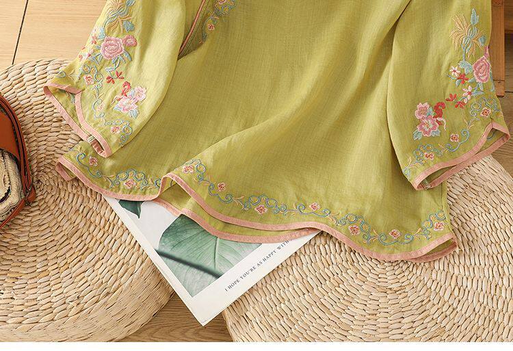 民國風文藝斜襟刺綉棉麻媽媽上衣女春夏季盤釦拼色顯瘦減齡七分袖