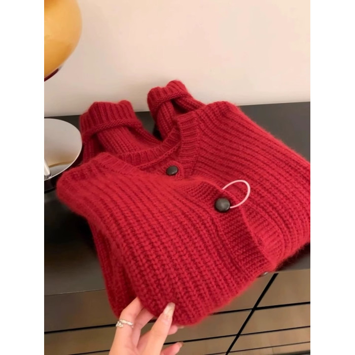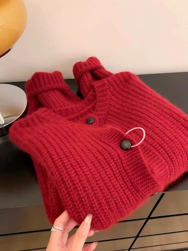 歐貨重工漂亮紅色針織羊毛開衫女秋冬新款軟糯超好看粗線毛衣外套