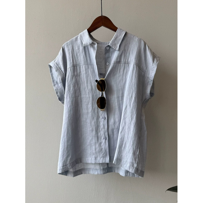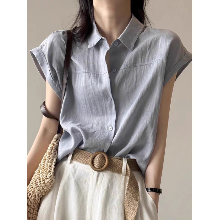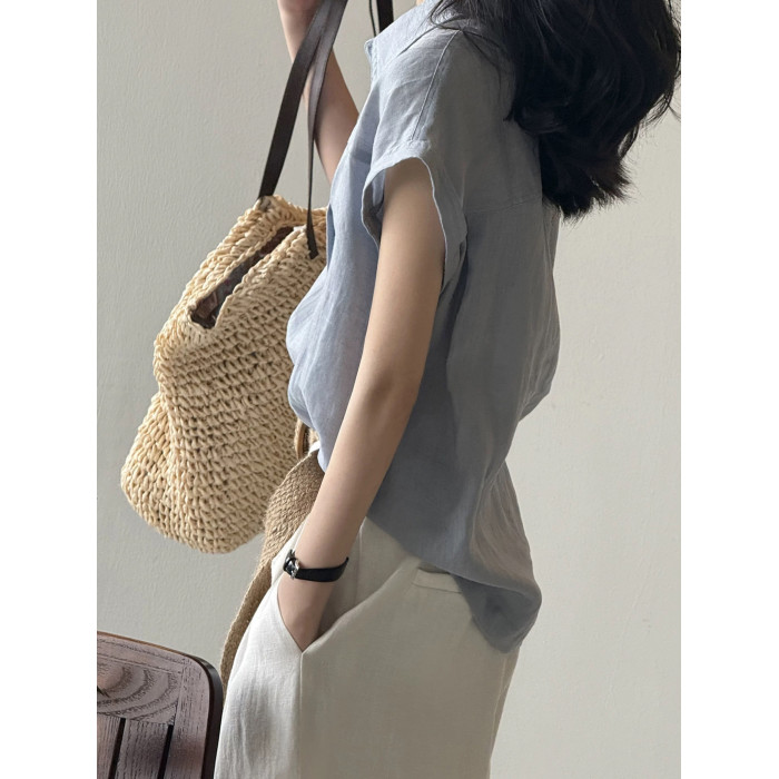 高級亞麻藍色短袖襯衫女夏通勤穿搭襯衣小飛袖無袖棉麻上衣高級感