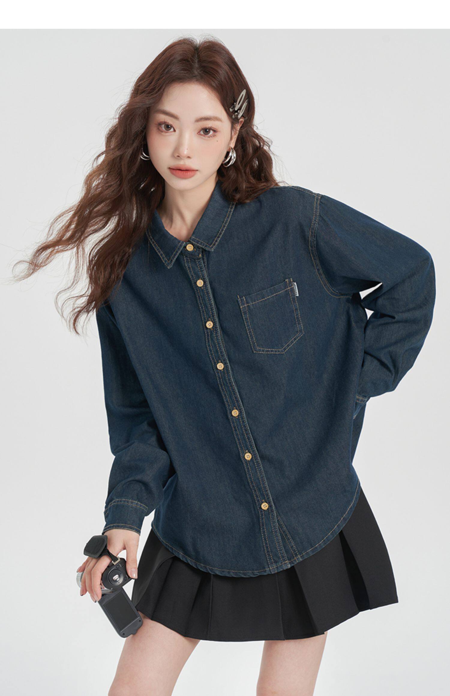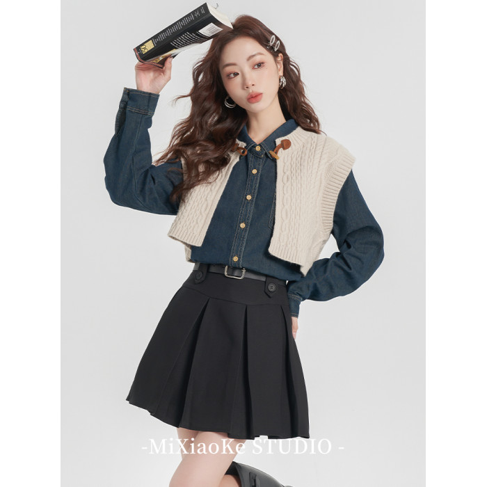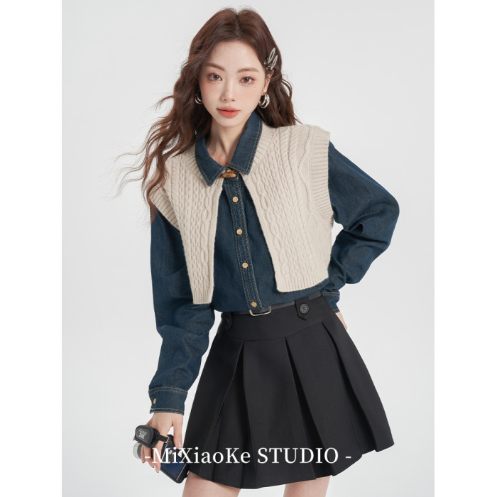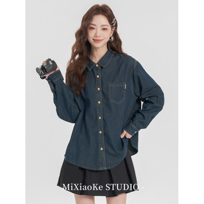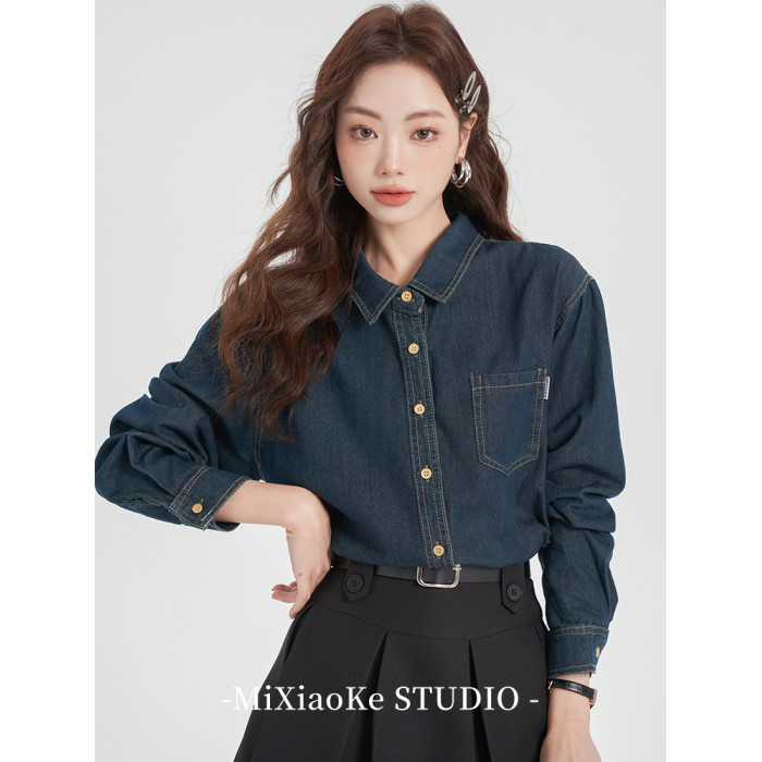 羋小可學院風套裝長袖牛仔襯衫女早秋襯衣內搭洋氣減齡上衣小個子