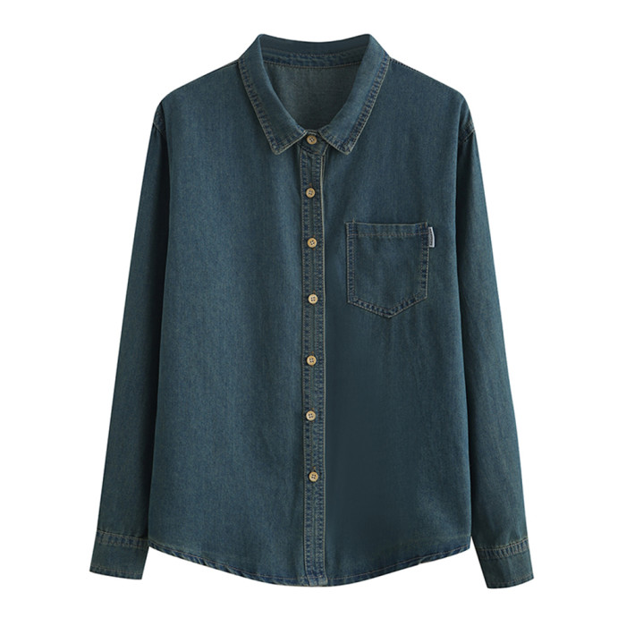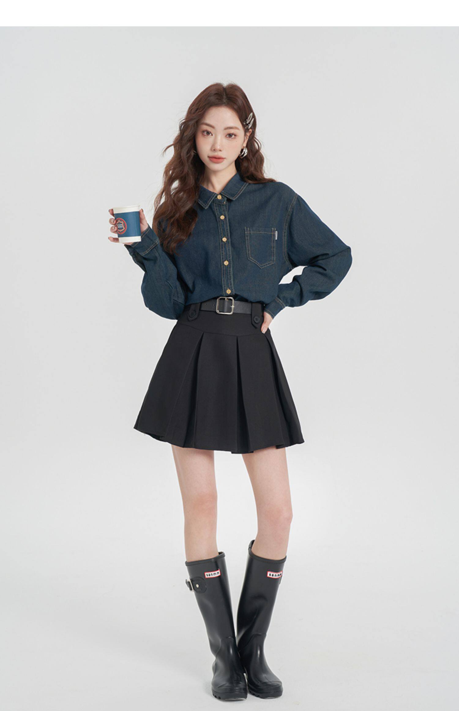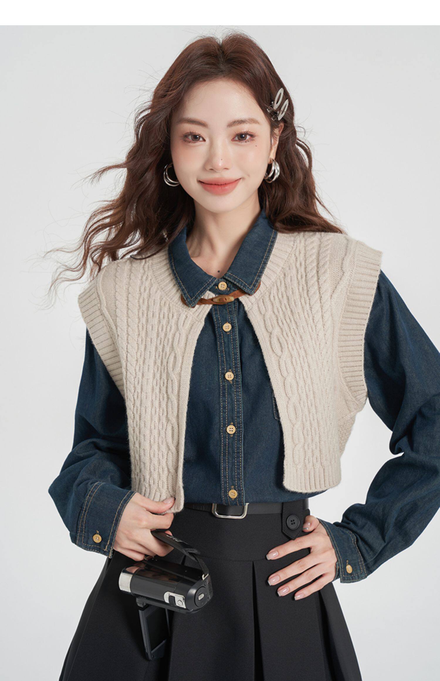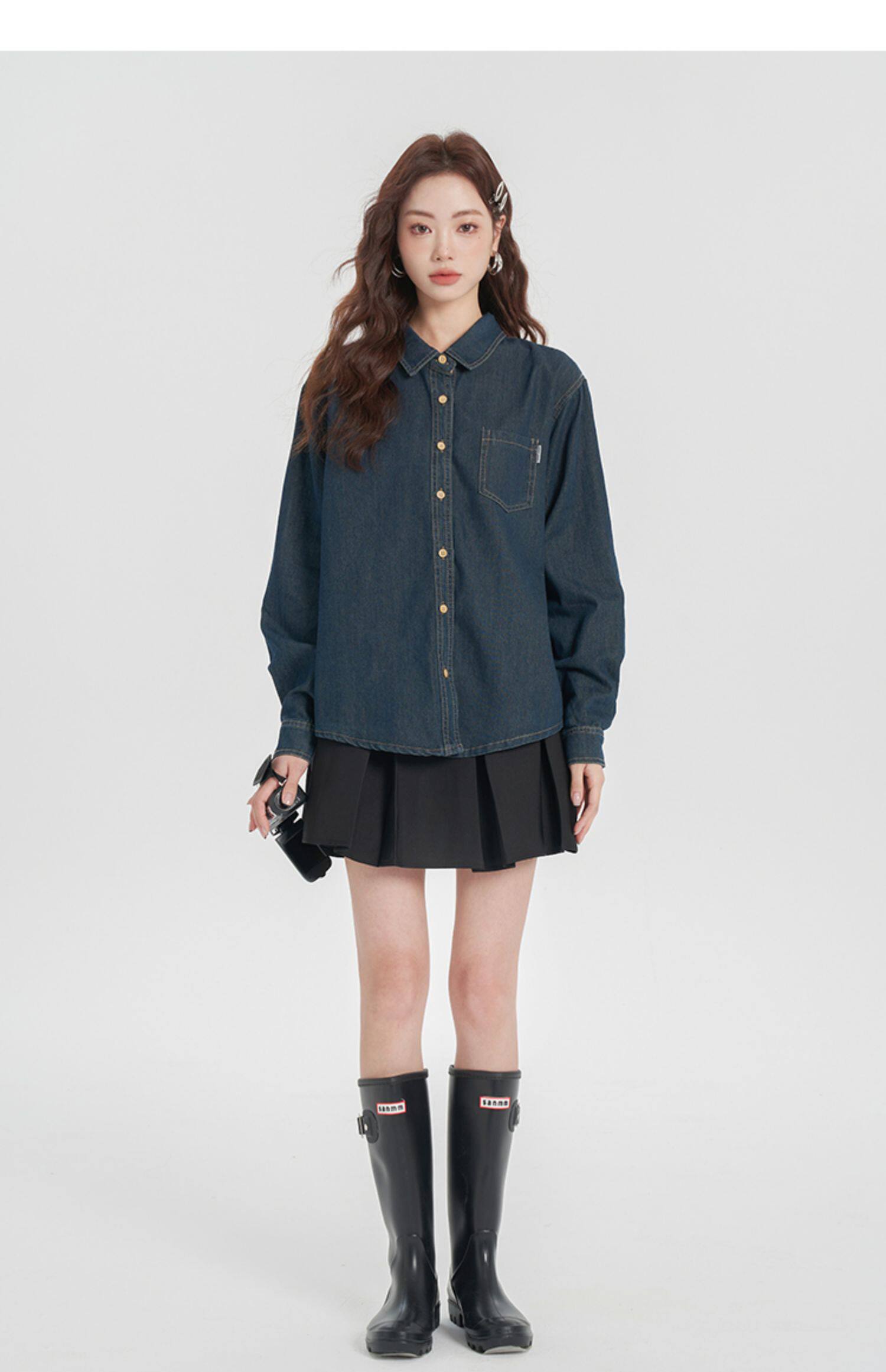 羋小可學院風套裝長袖牛仔襯衫女早秋襯衣內搭洋氣減齡上衣小個子