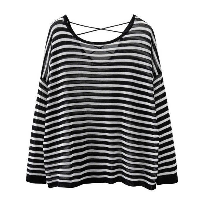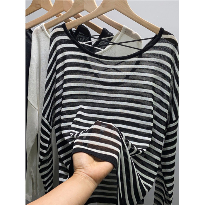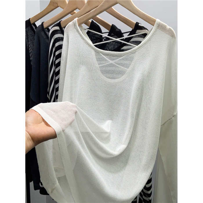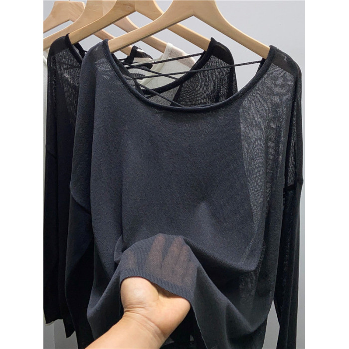 冰絲針織衫女寬鬆薄款別致設計感露背長袖上衣夏女防曬罩衫外搭潮