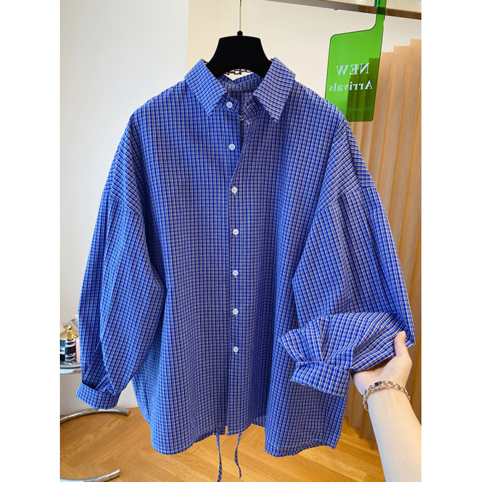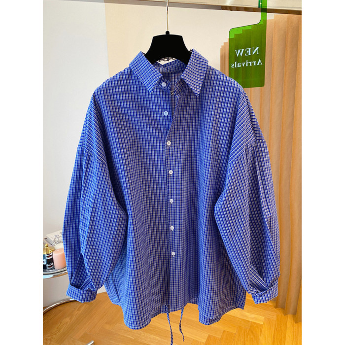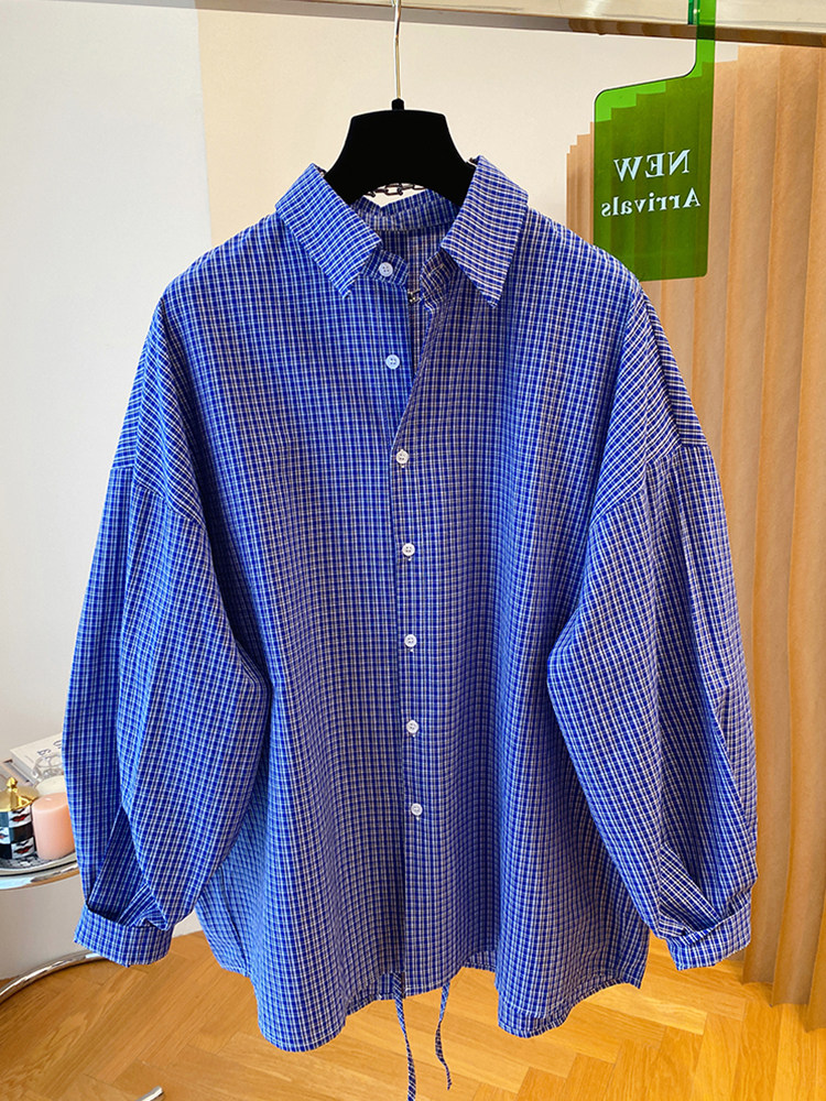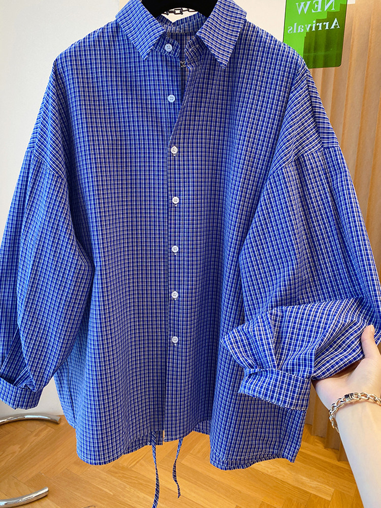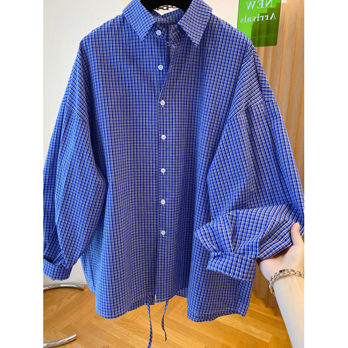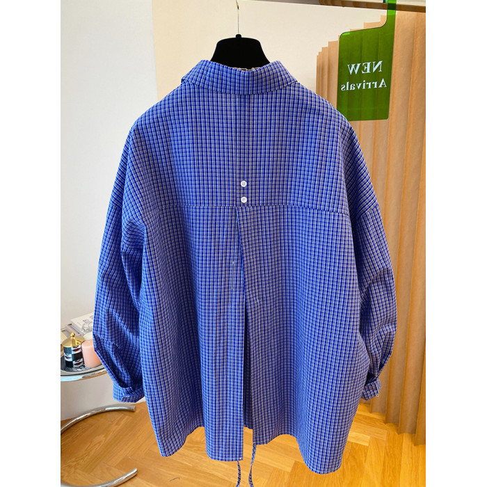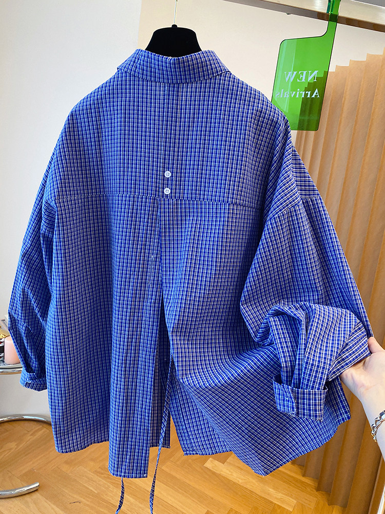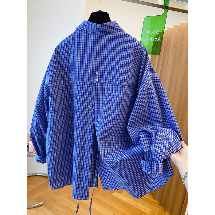 法式復古藍色格子長袖襯衫女春秋寬鬆顯瘦後背開叉休閒外套上衣潮