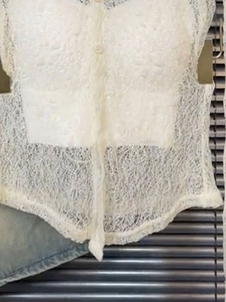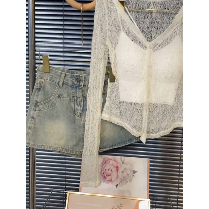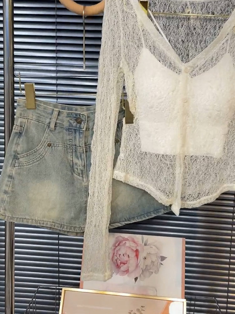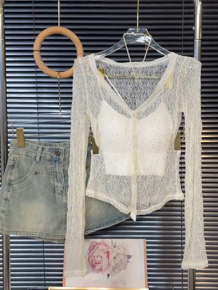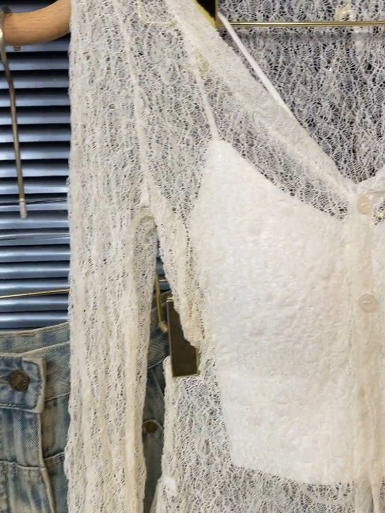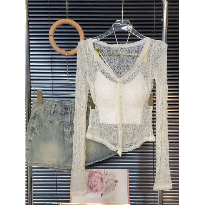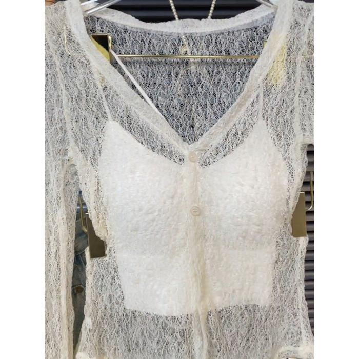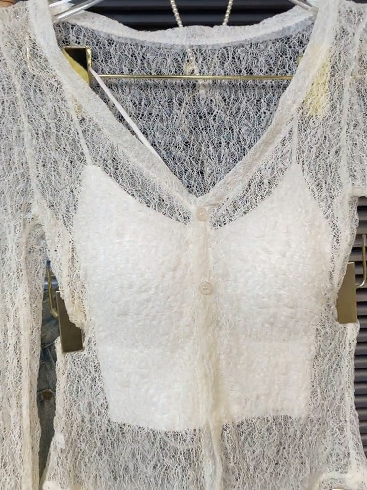 高級感性感鏤空蕾絲長袖上衣吊帶背心女氣質韓系辣妹寬鬆兩件套裝