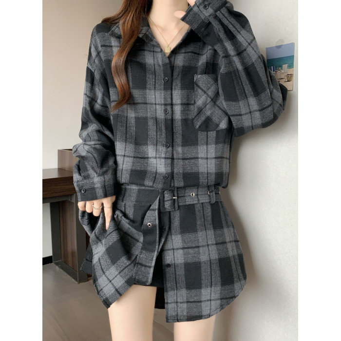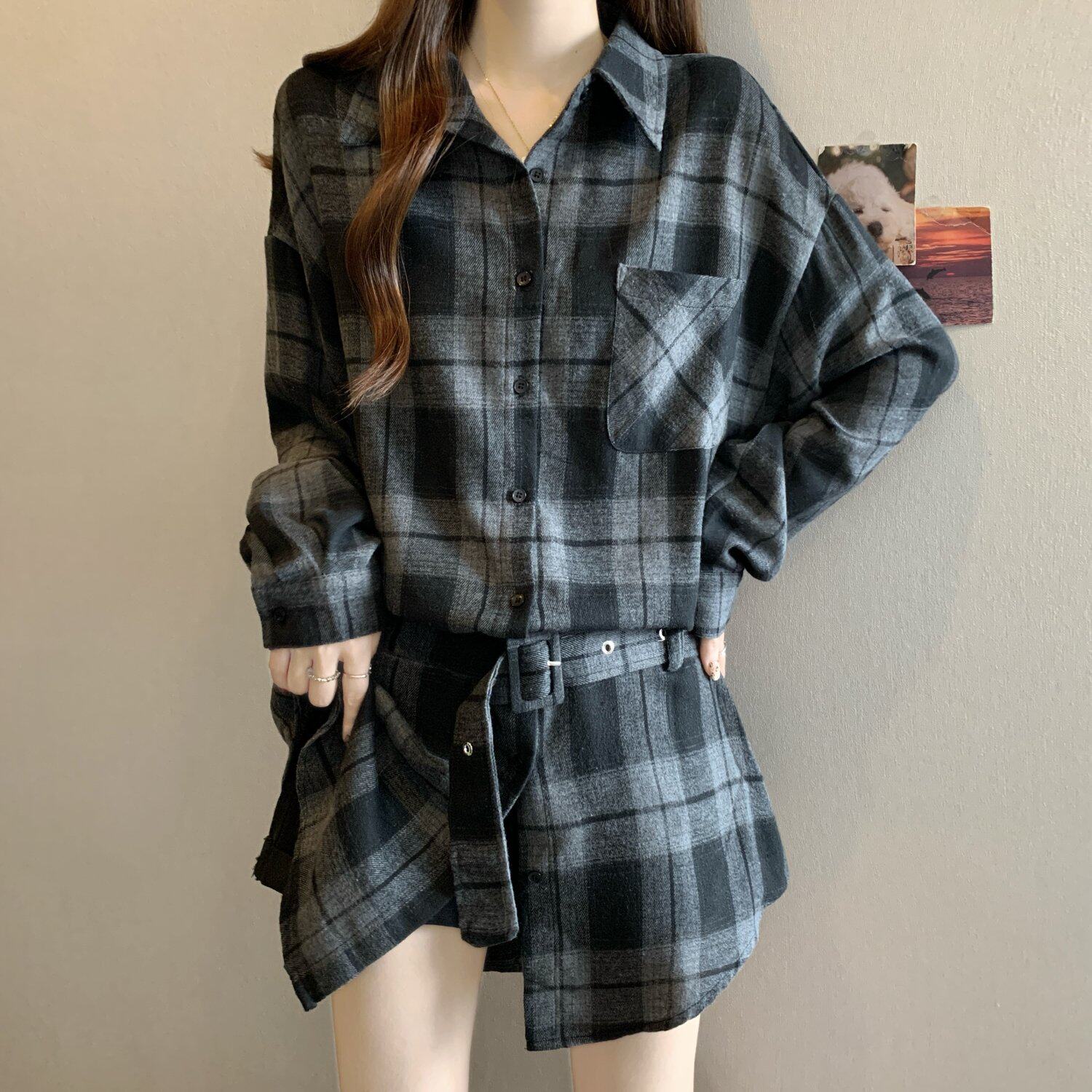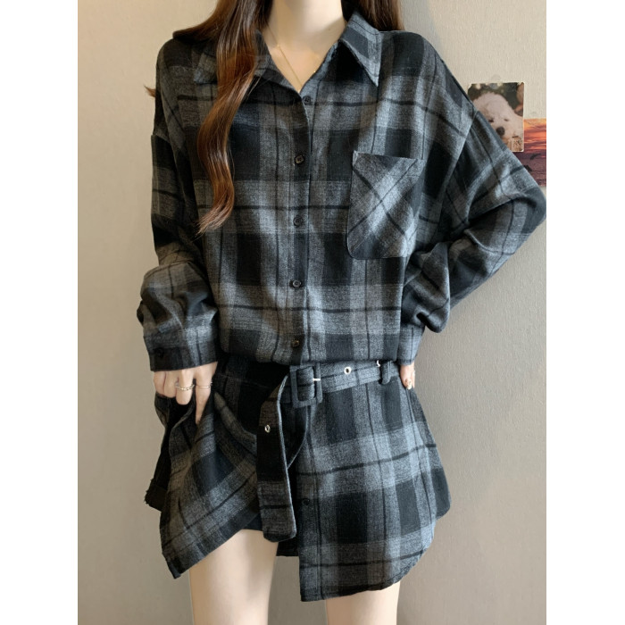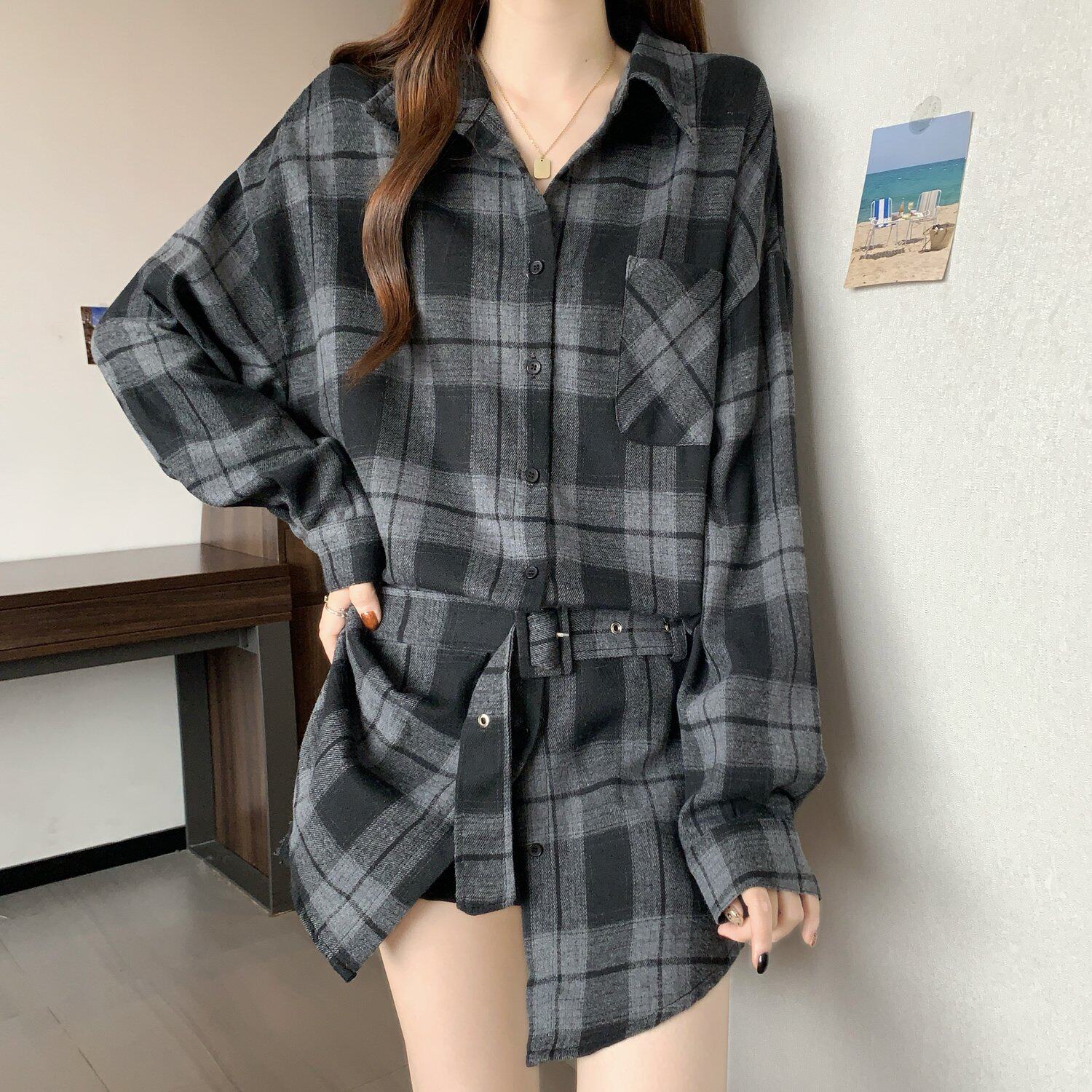 港風復古格子長袖襯衫女春秋2025大碼胖mm顯瘦中長款系帶收腰上衣