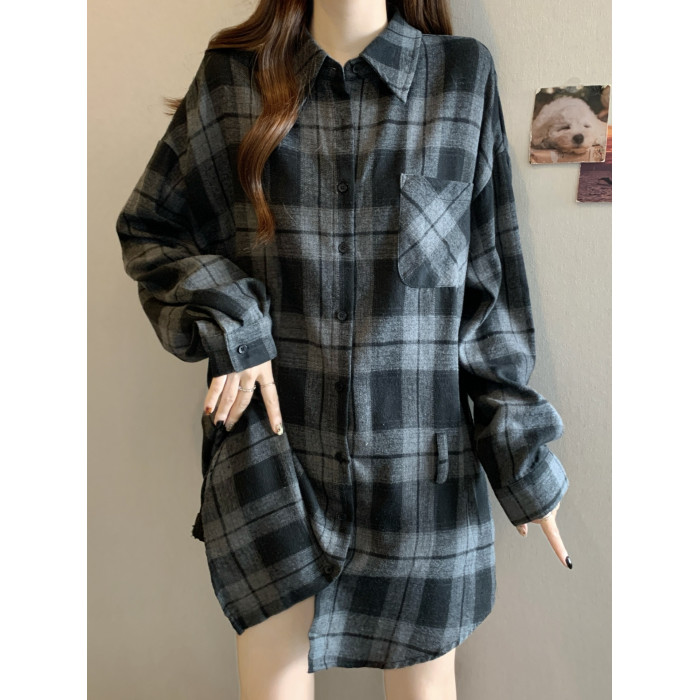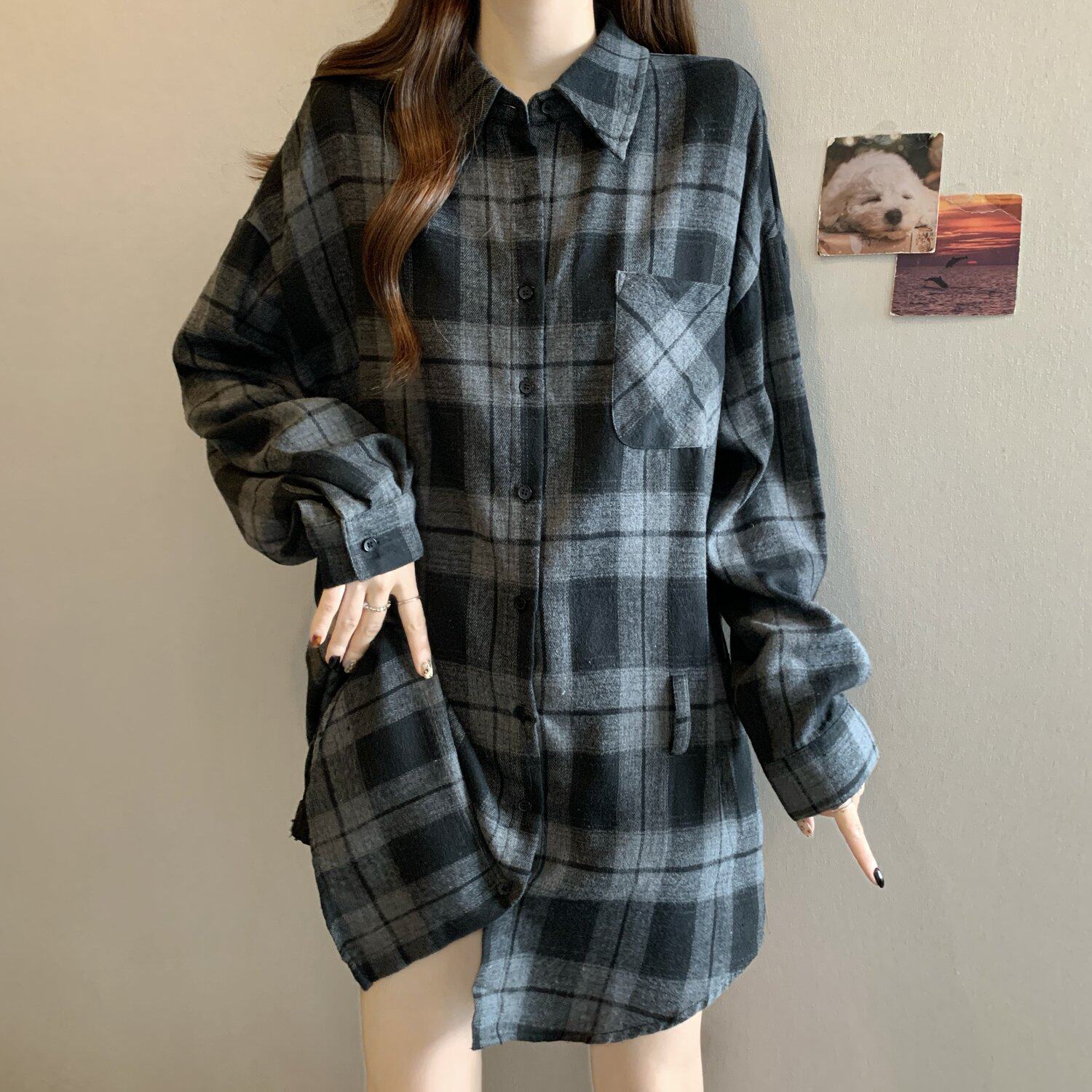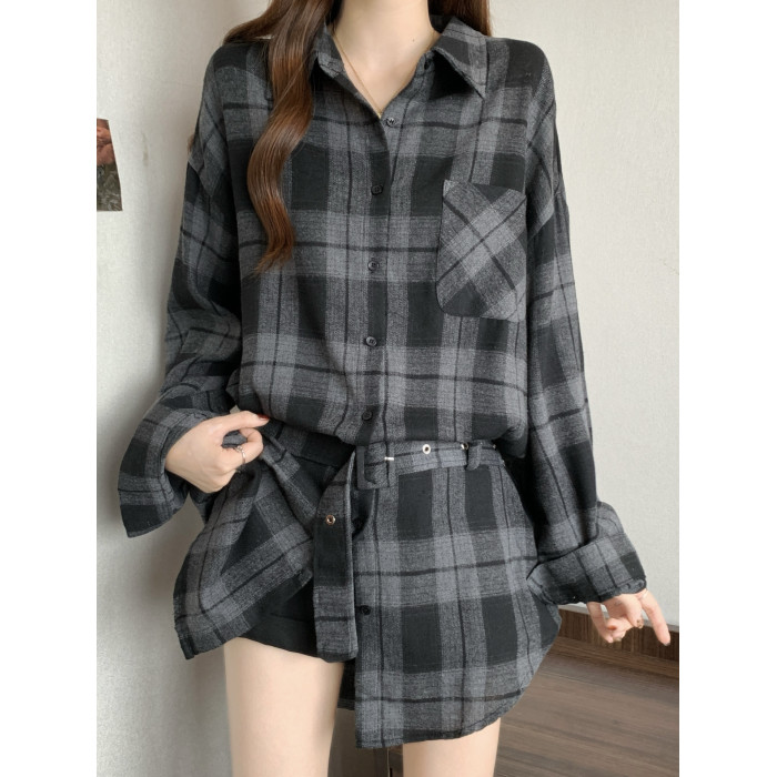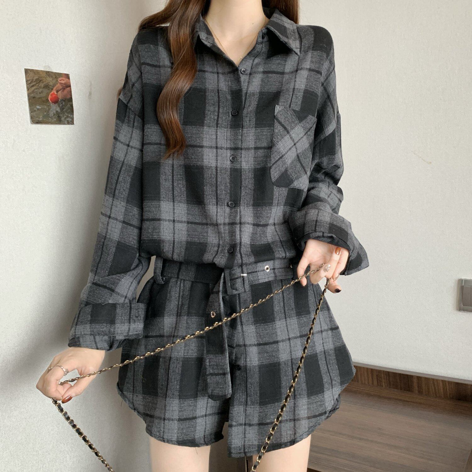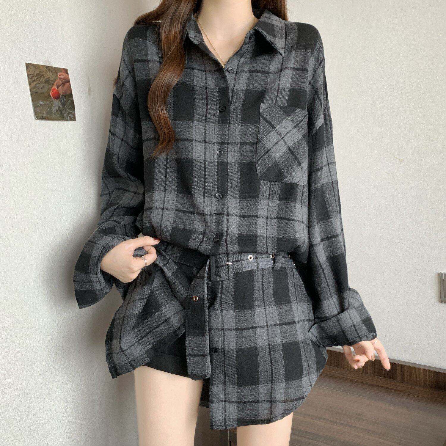 港風復古格子長袖襯衫女春秋2025大碼胖mm顯瘦中長款系帶收腰上衣