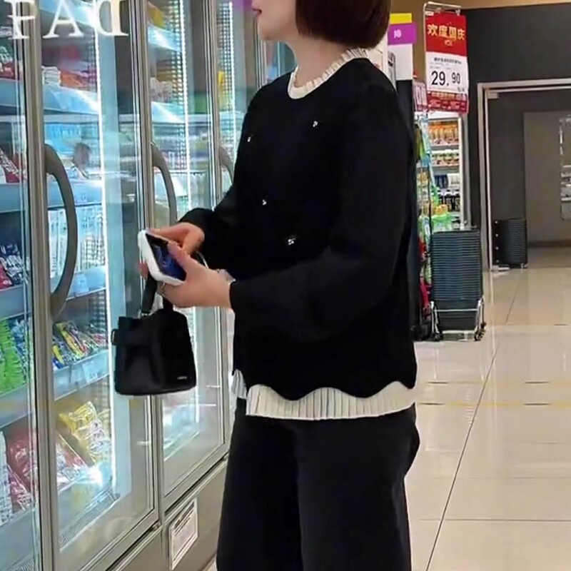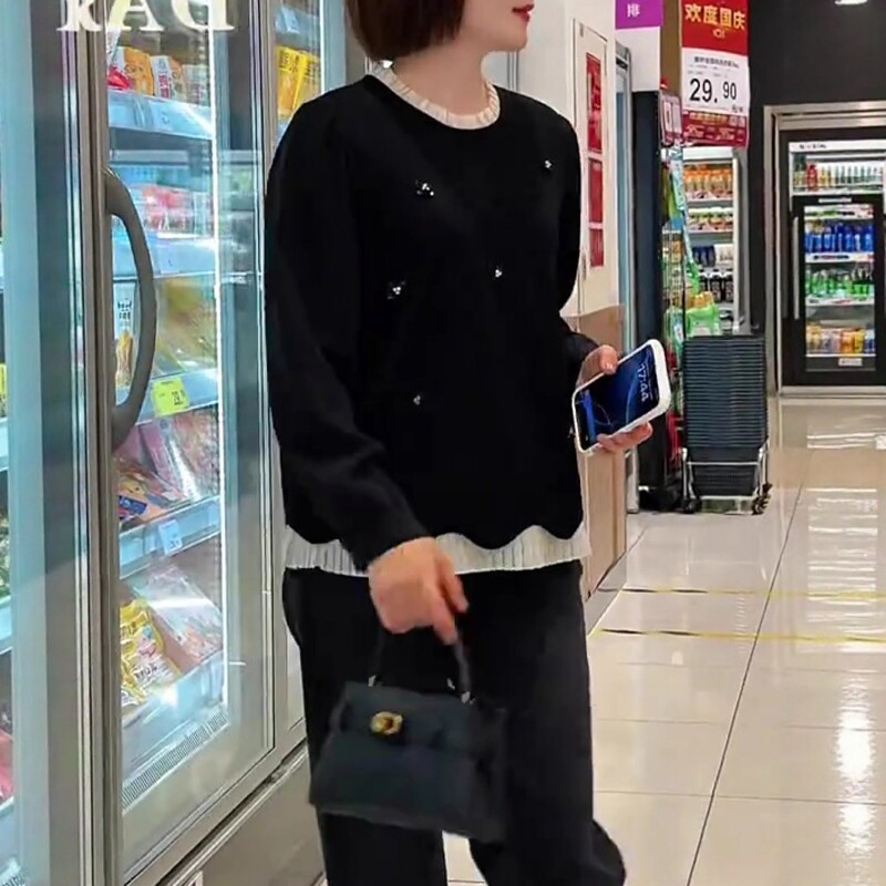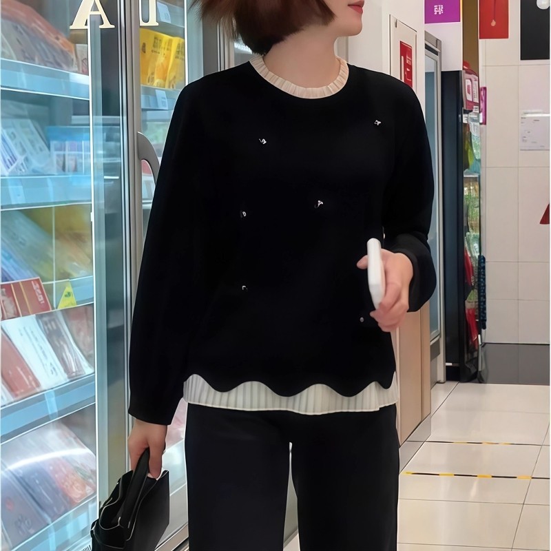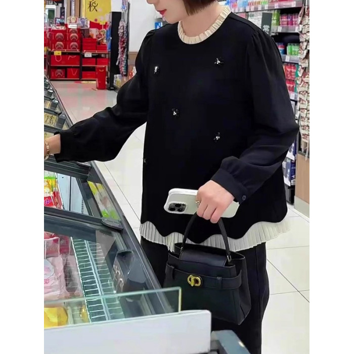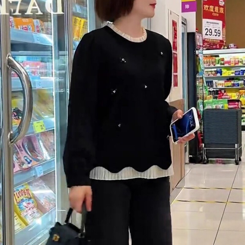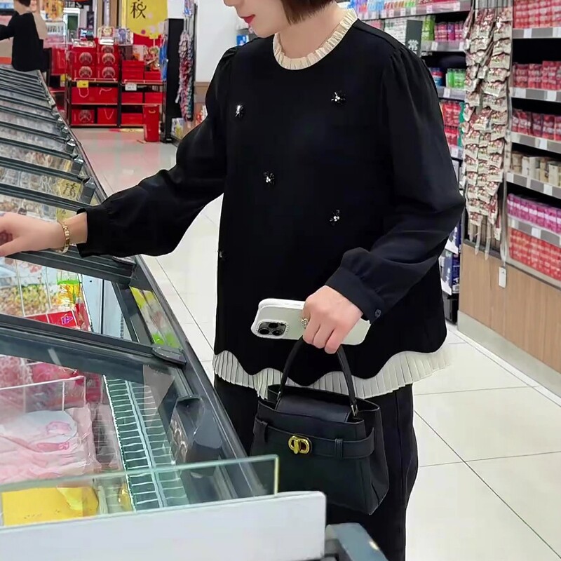 黑色假兩件釘珠襯衫女2026春季新款大碼胖MM寬鬆顯瘦長袖百搭上衣