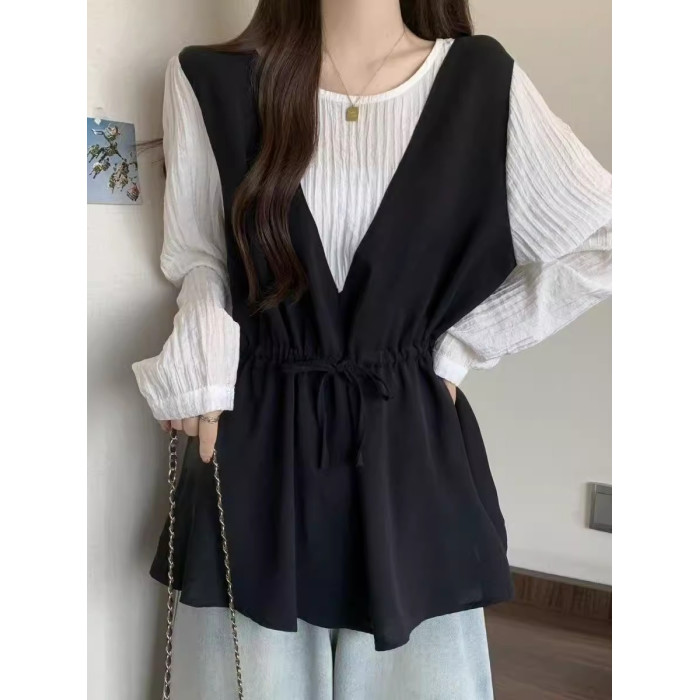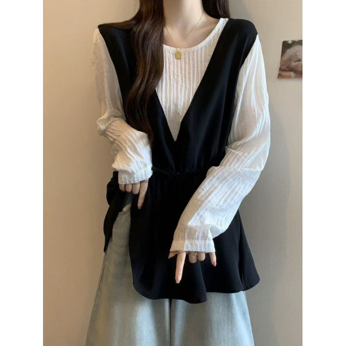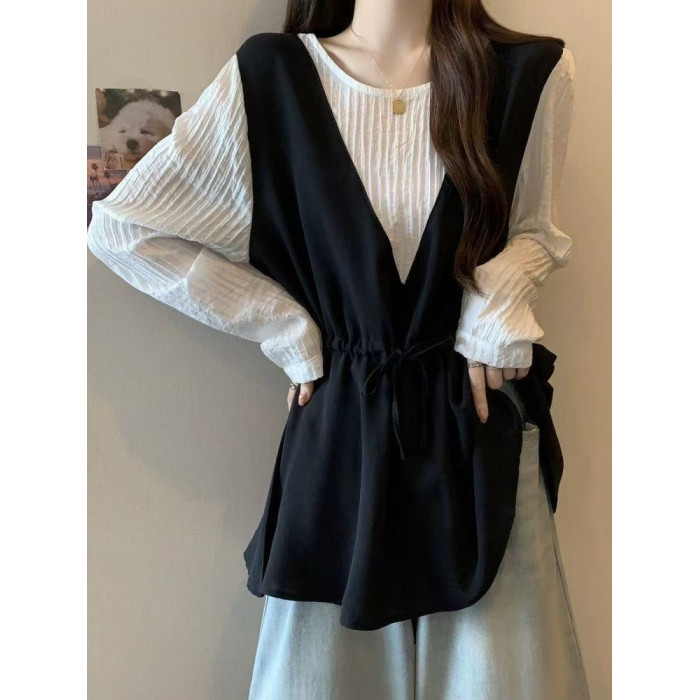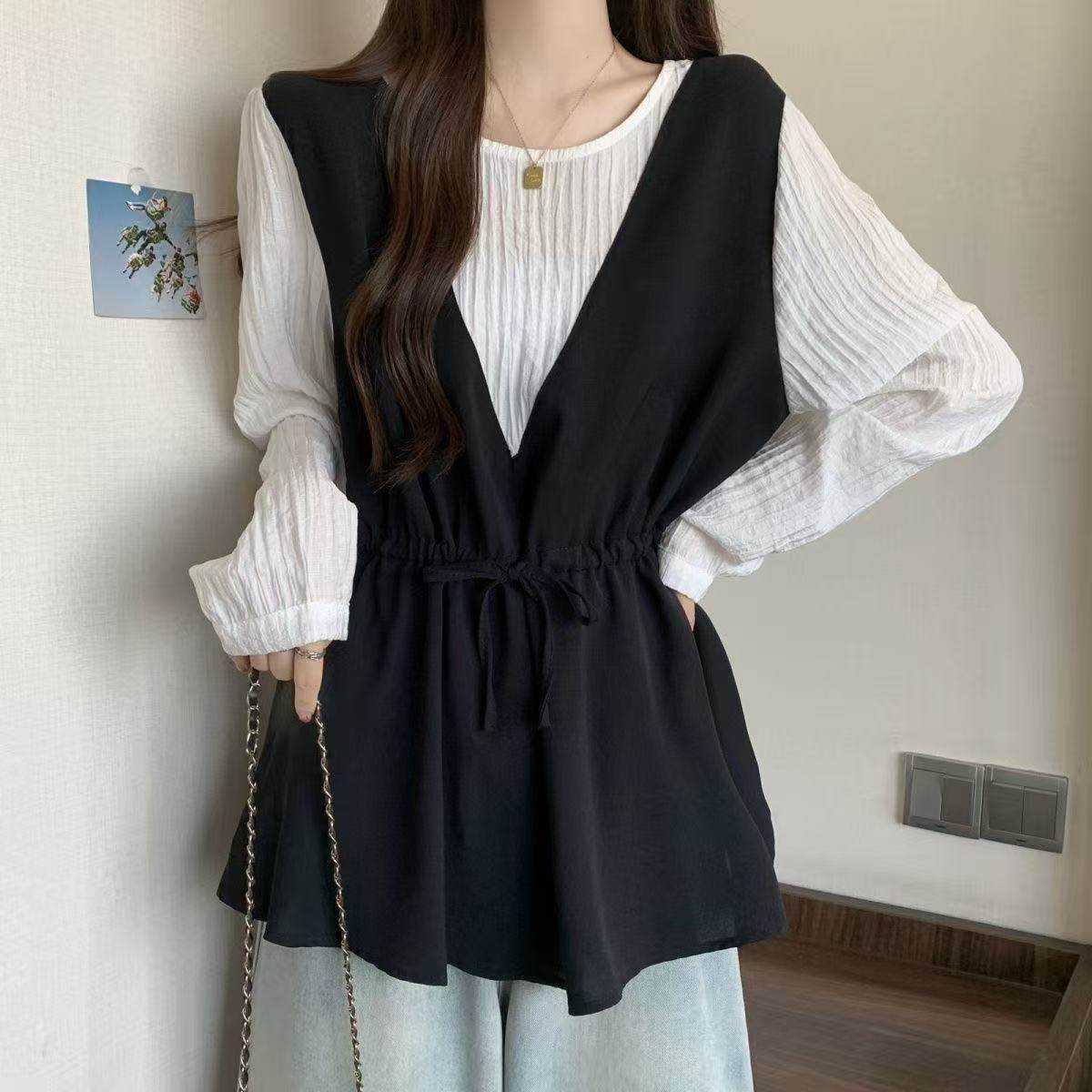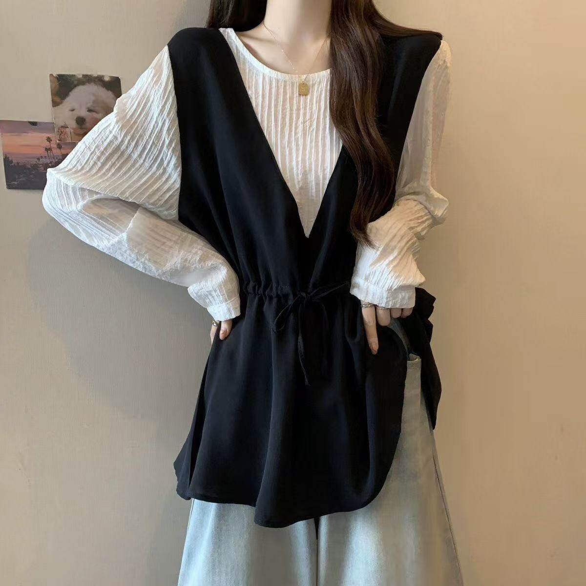 減齡洋氣襯衫女寬鬆遮肉慵懶風撞色假兩件長袖女裝2025年秋季新款