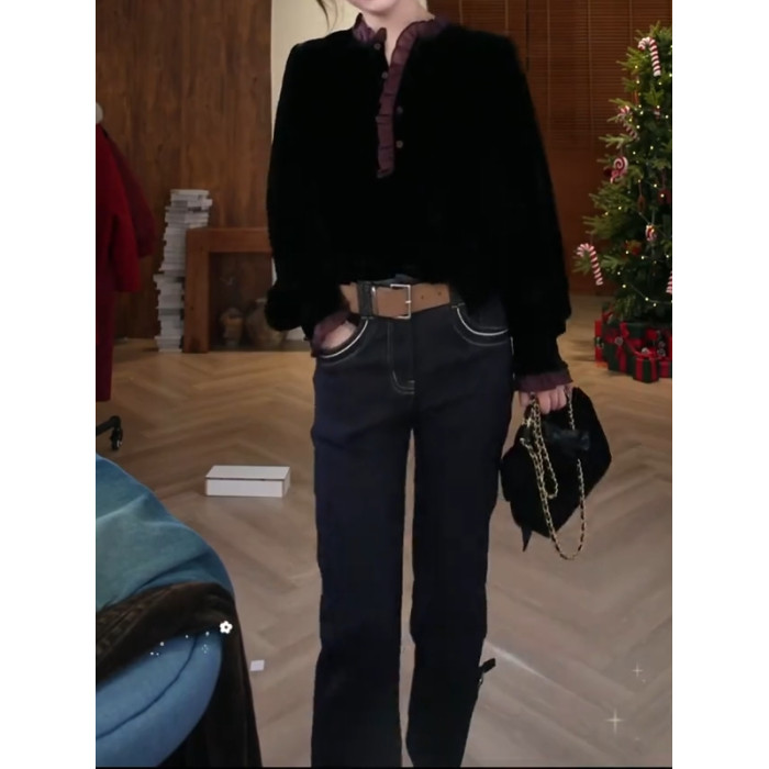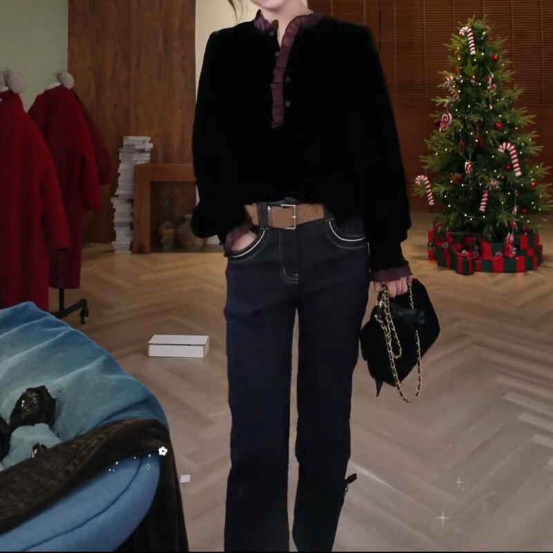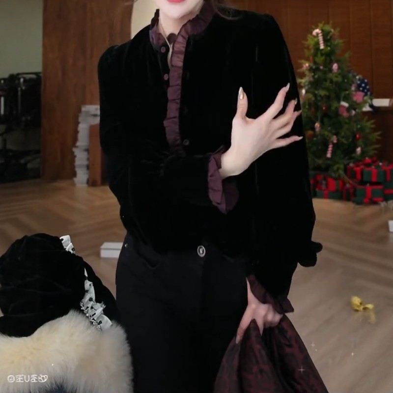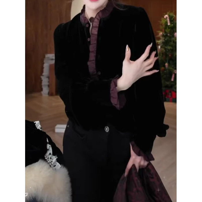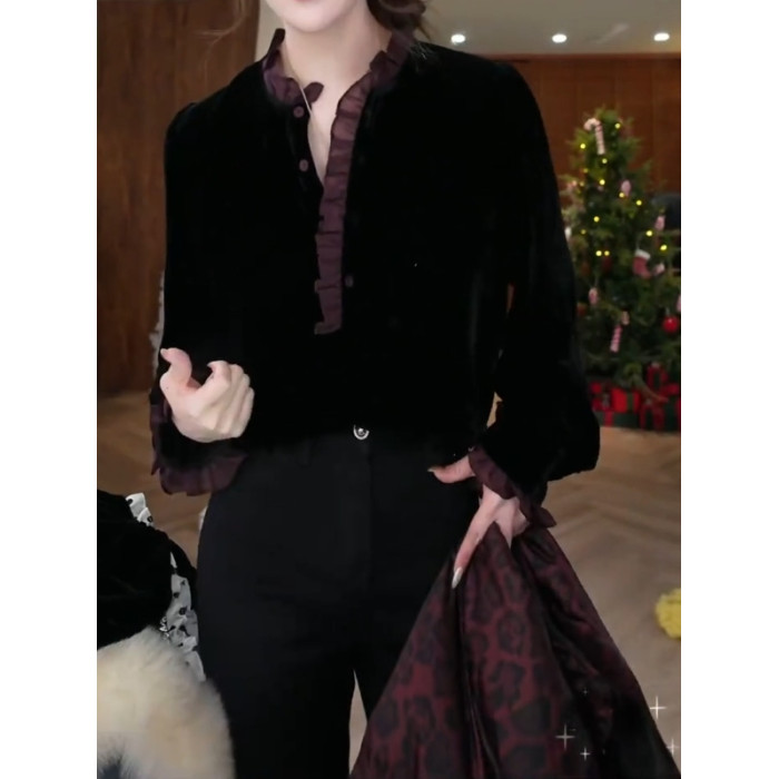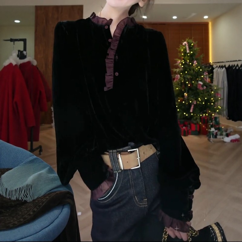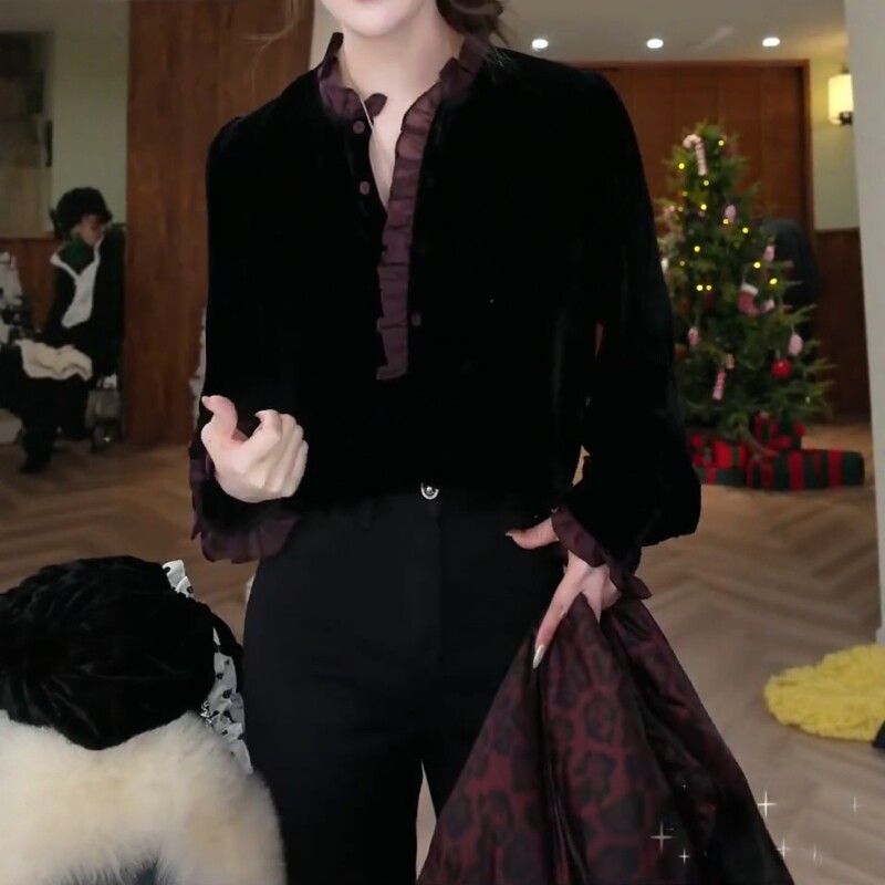 輕奢絲絨拼接蕾絲襯衫長袖2026秋冬新款大碼胖mm顯瘦寬鬆高級上衣