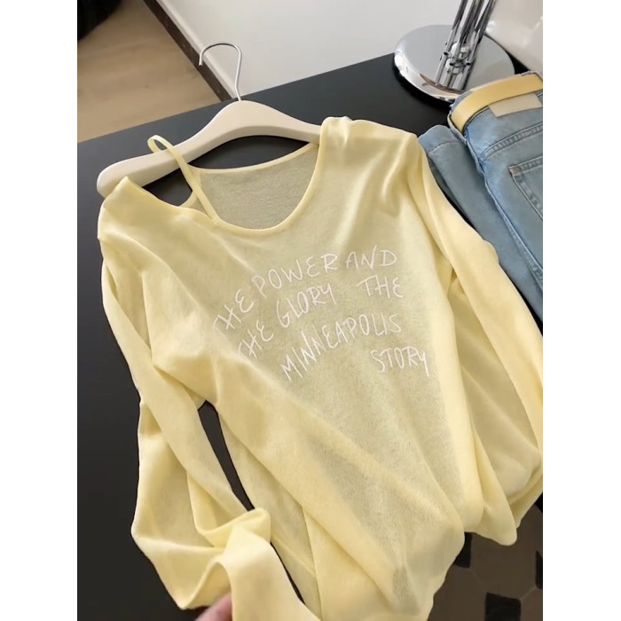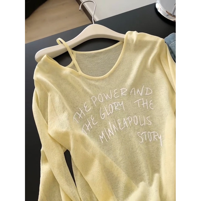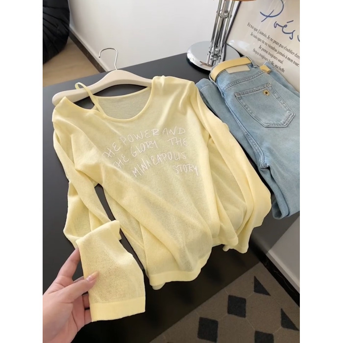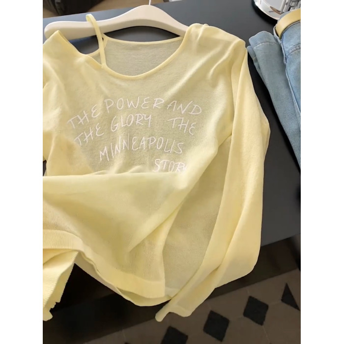 黃色休閒薄款V領長袖防曬罩衫女夏季新款慵懶風寬鬆顯瘦微透上衣