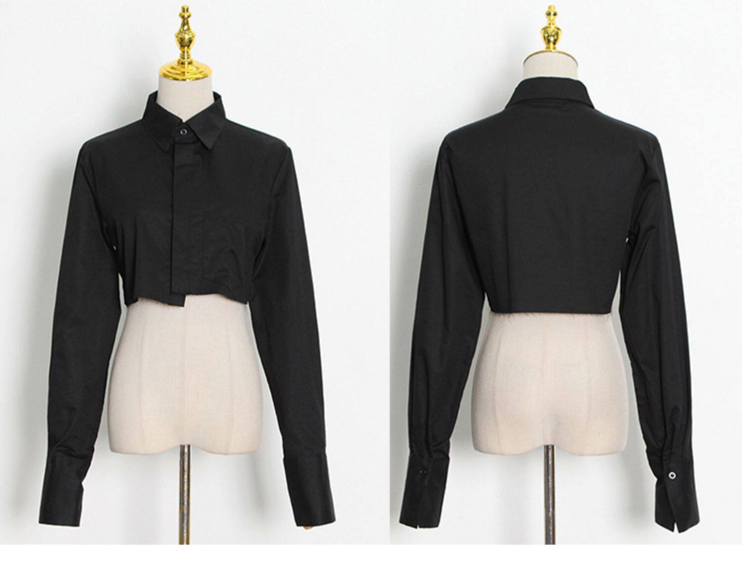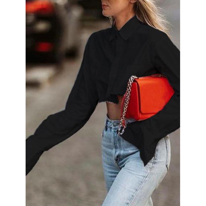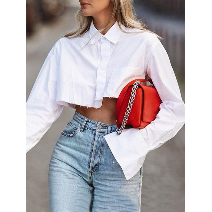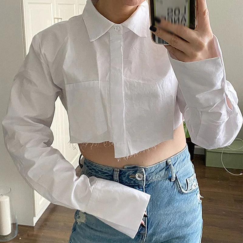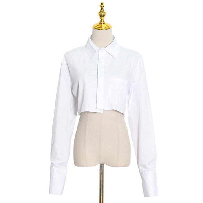 TWOTWINSTYLE歐美磨毛邊露腰短款白色襯衫女式襯衣不規則長袖上衣