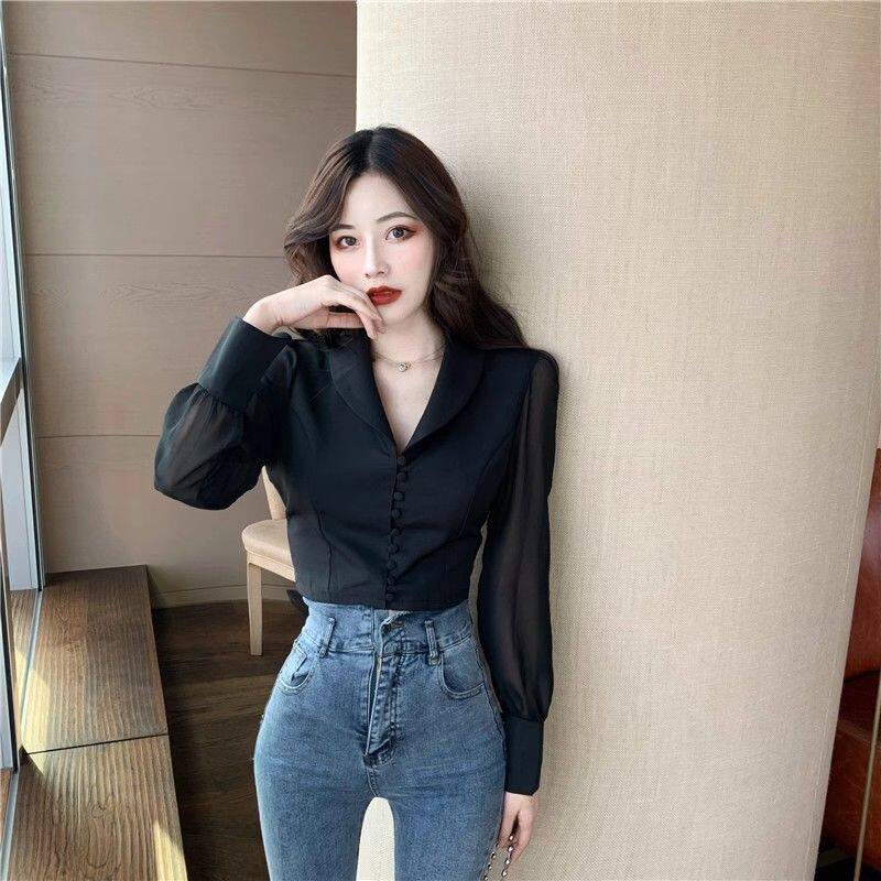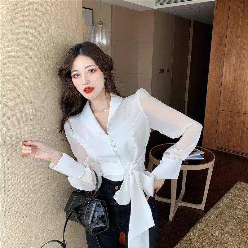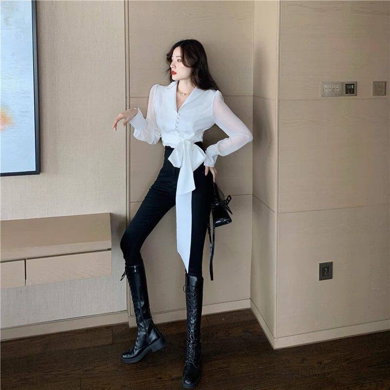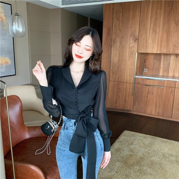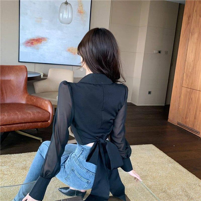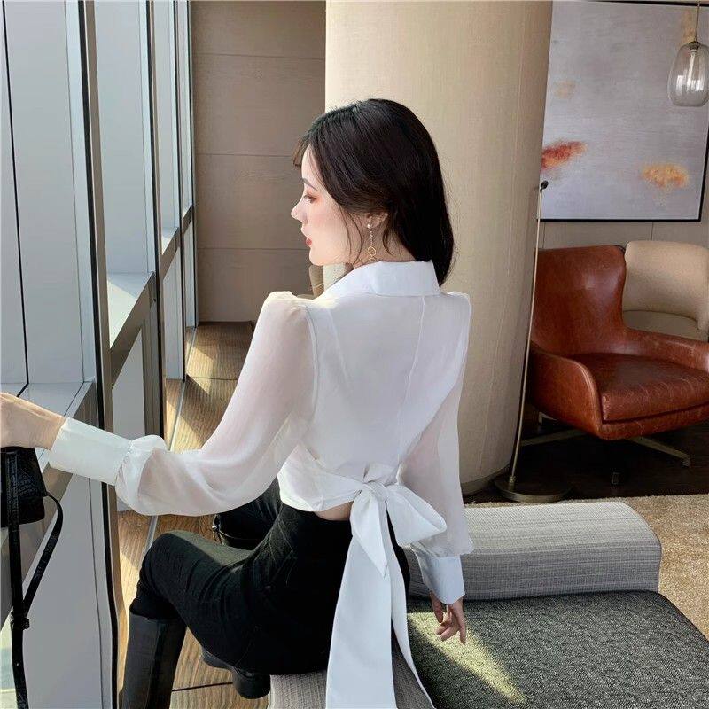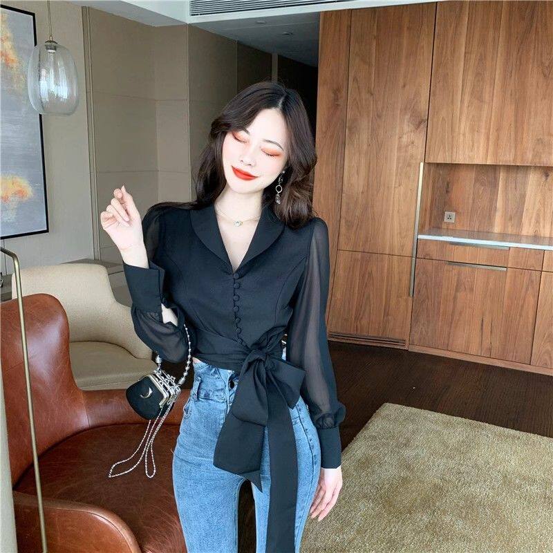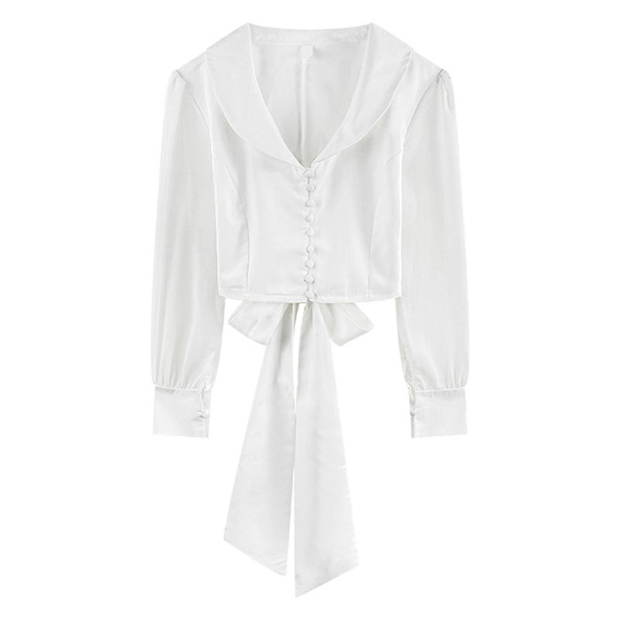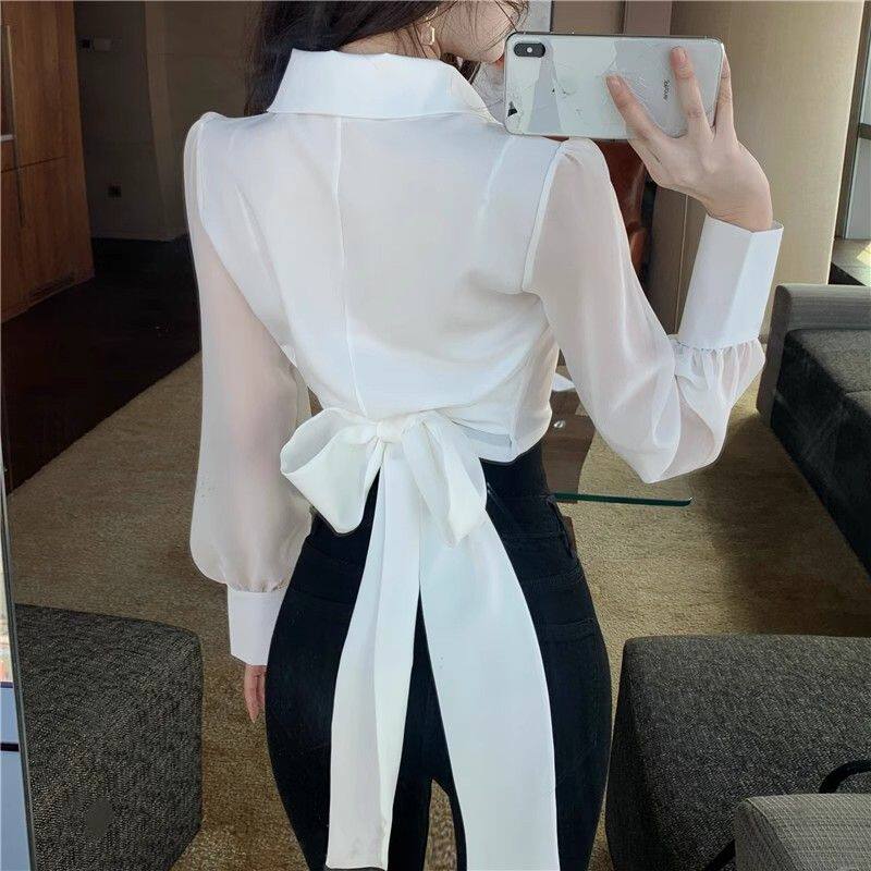 小香風高腰顯瘦超仙美蝴蝶結襯衫春秋法式新款泡泡袖氣質短款上衣