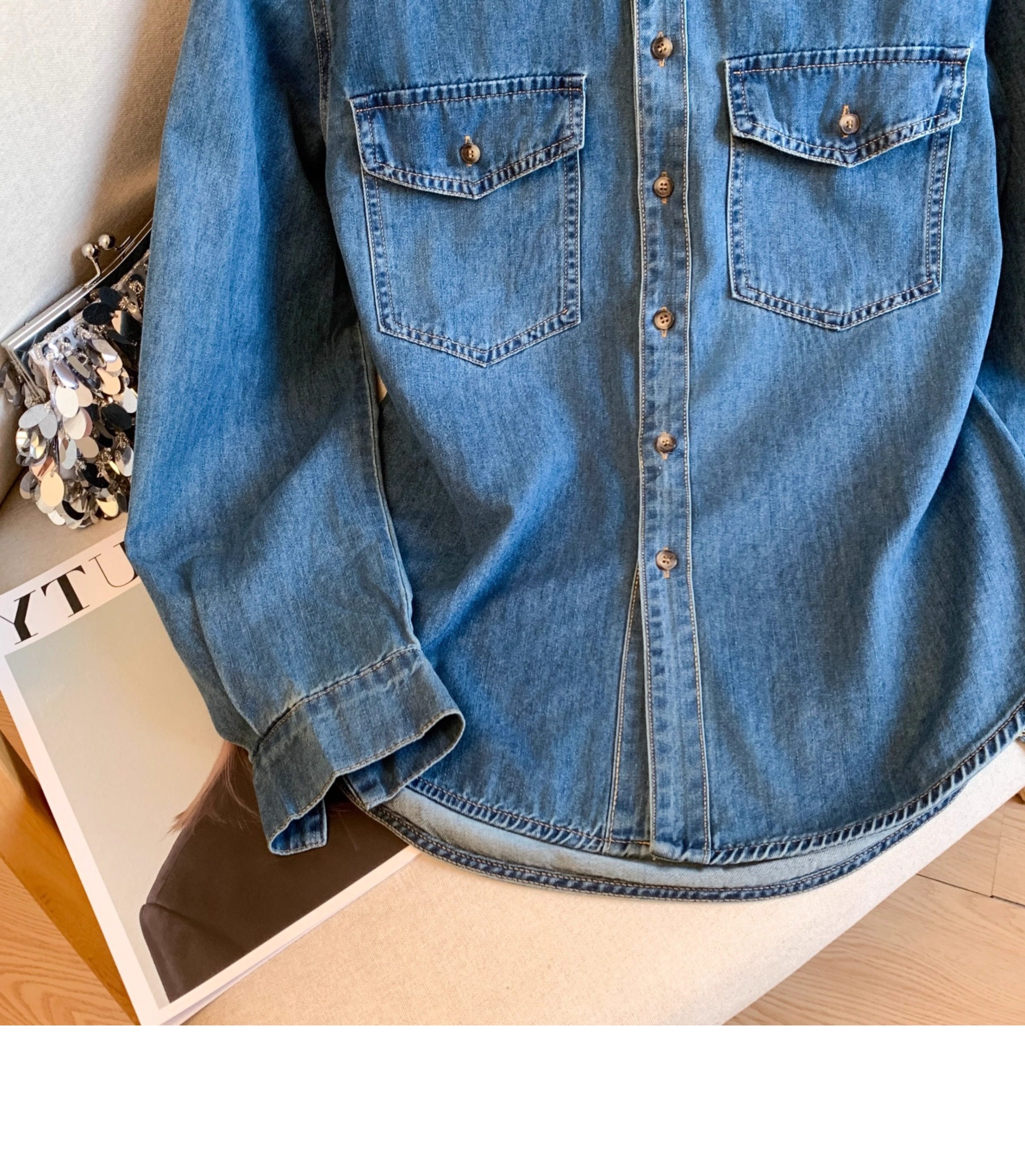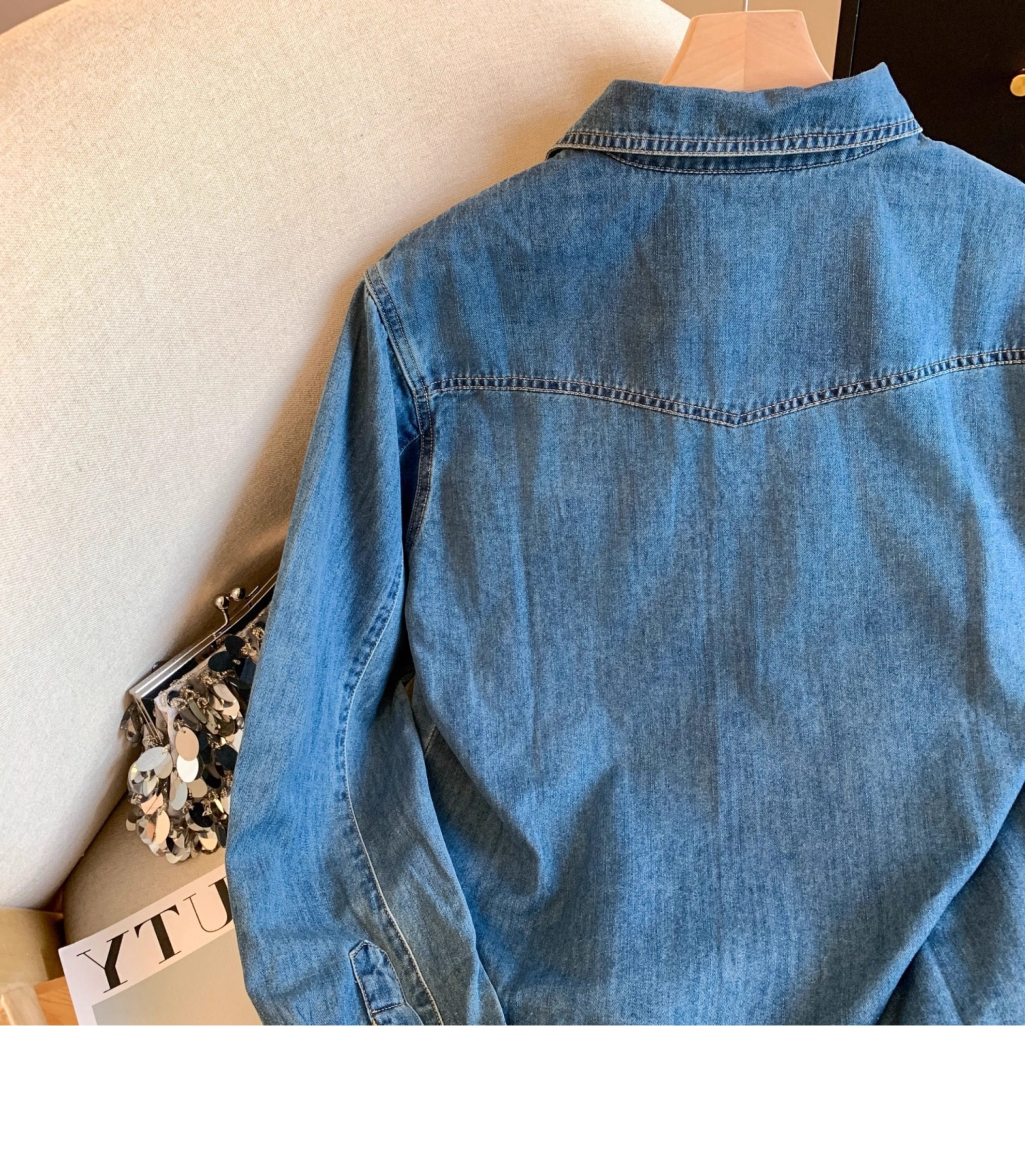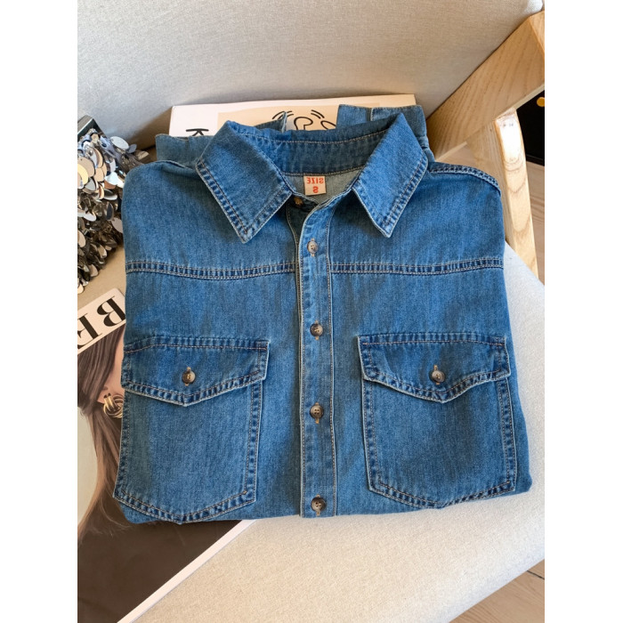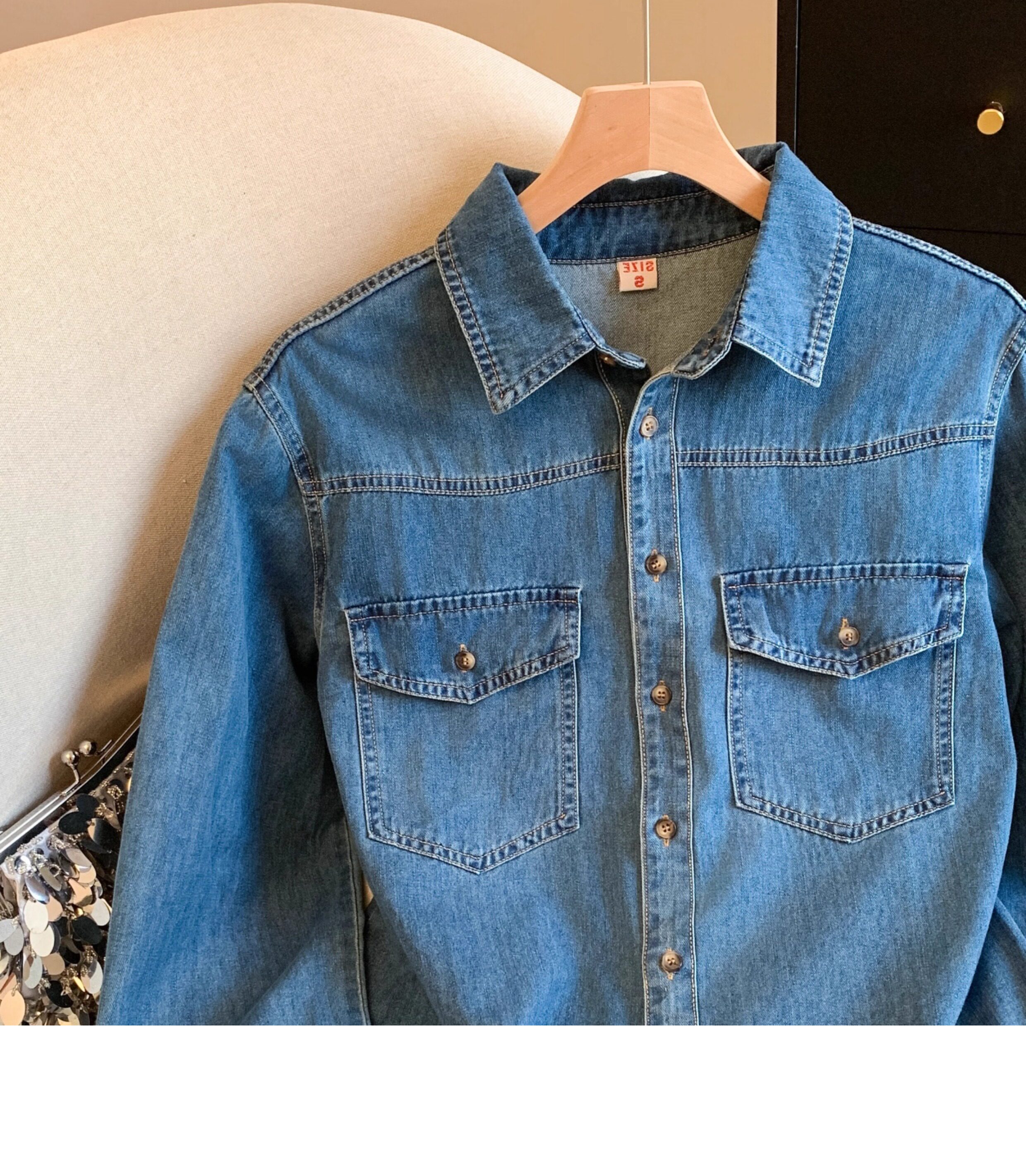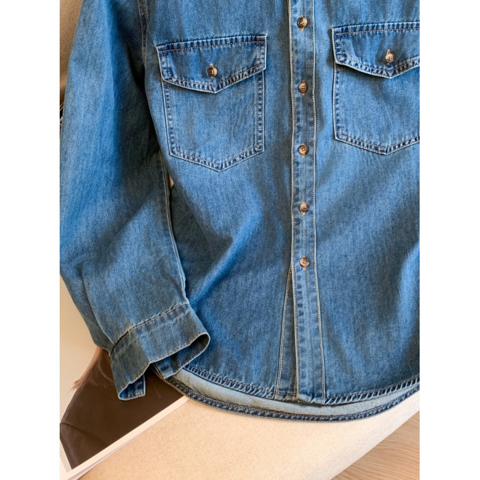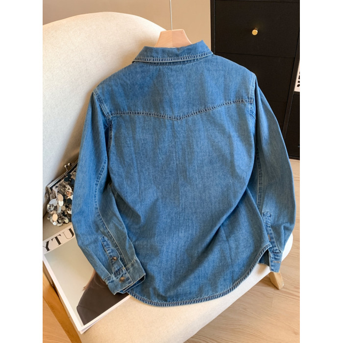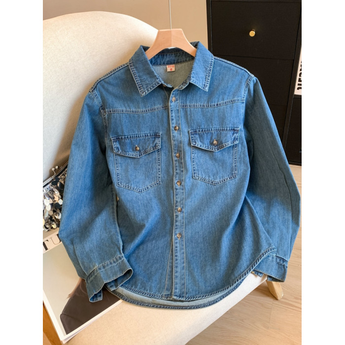 廣州十三行高貨爆款~復古繙領正肩水洗軟牛仔襯衫女長袖秋季曡穿