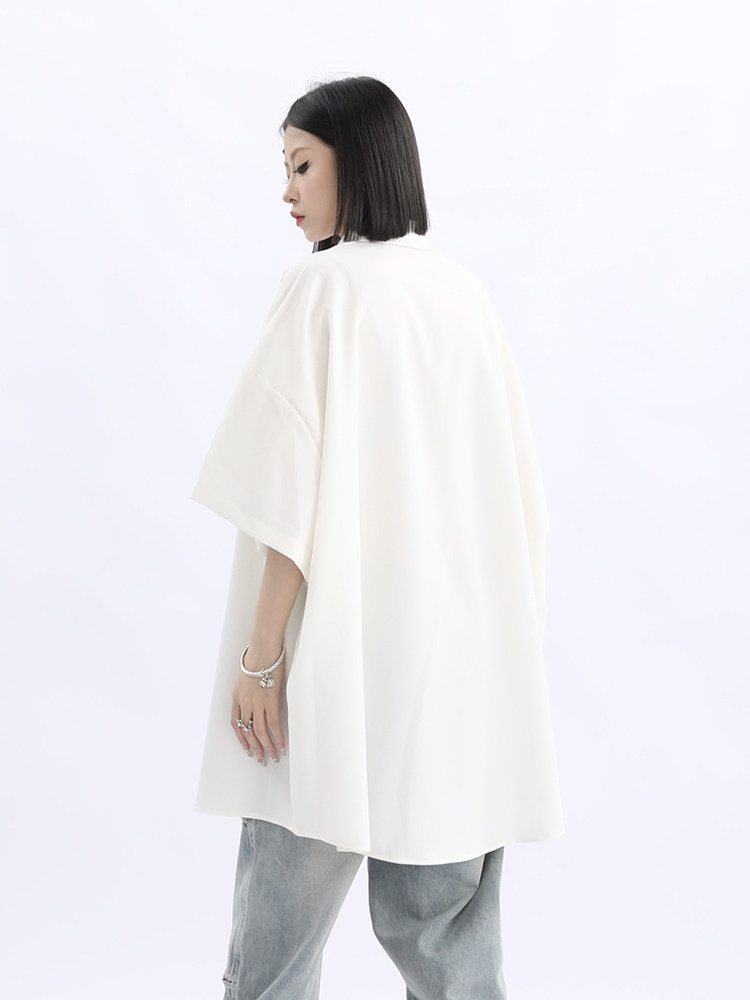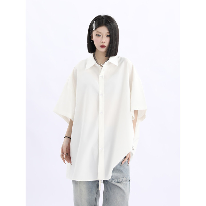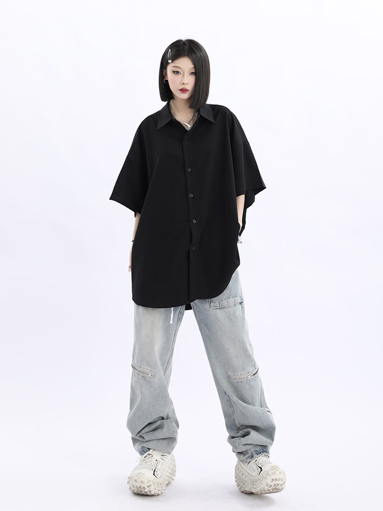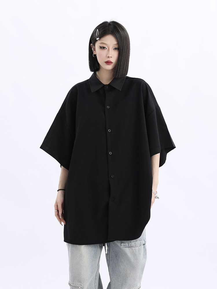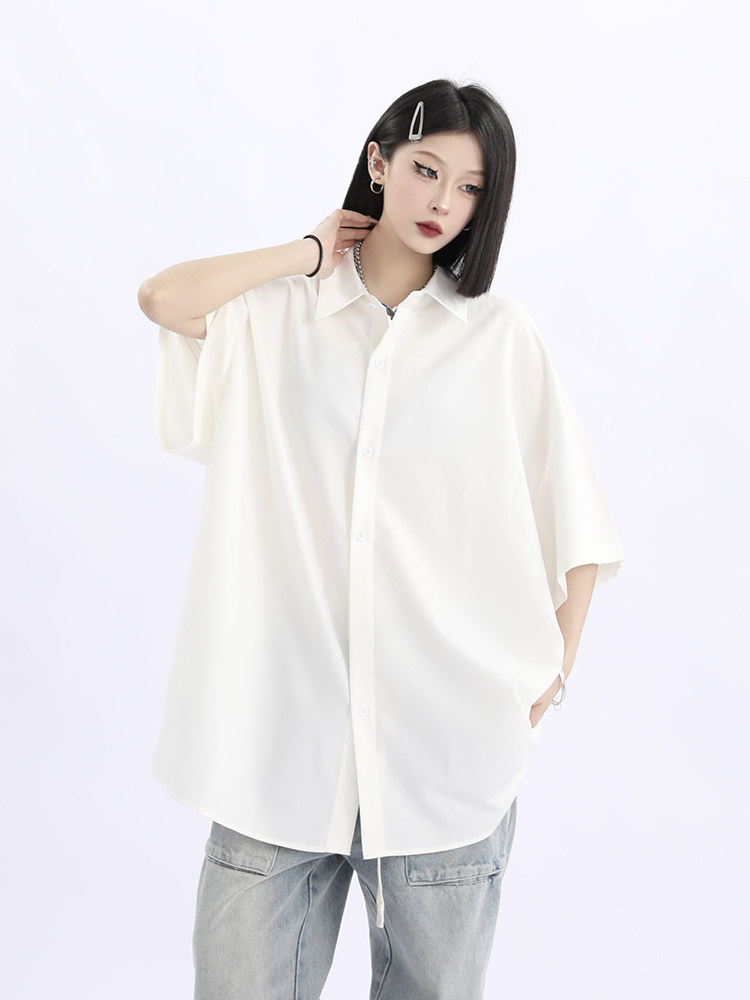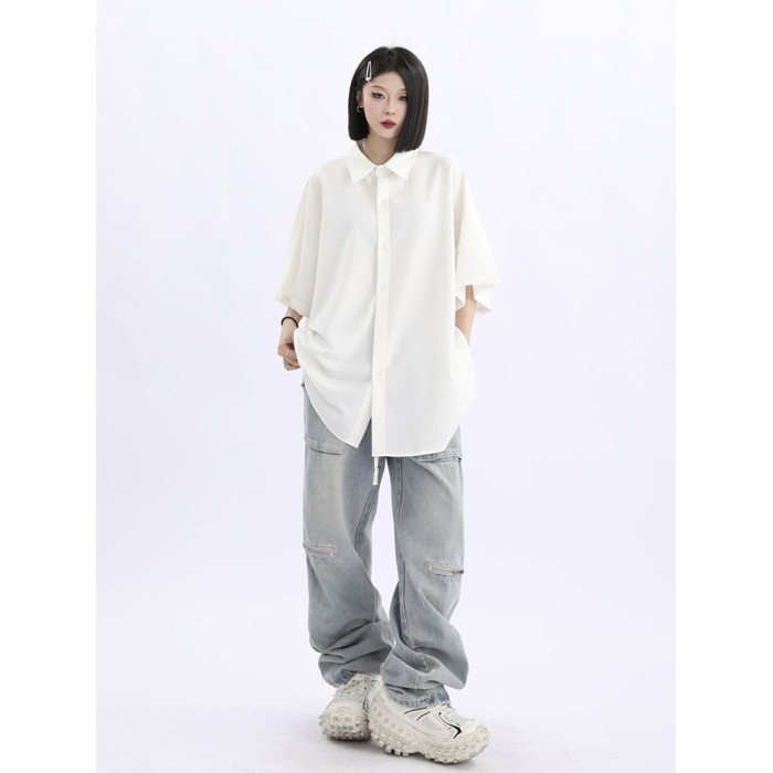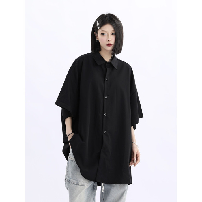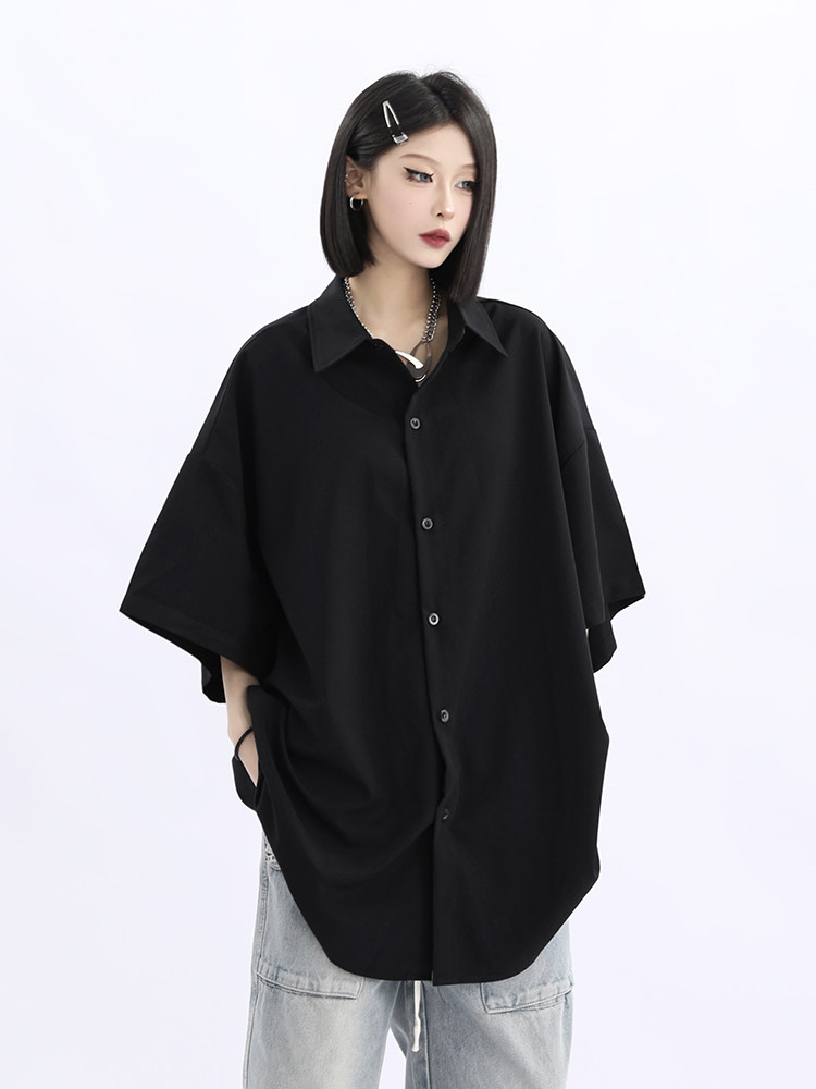 野生阿子美式街頭純色短袖襯衫女復古風寬鬆垂墜感百搭情侶襯衣