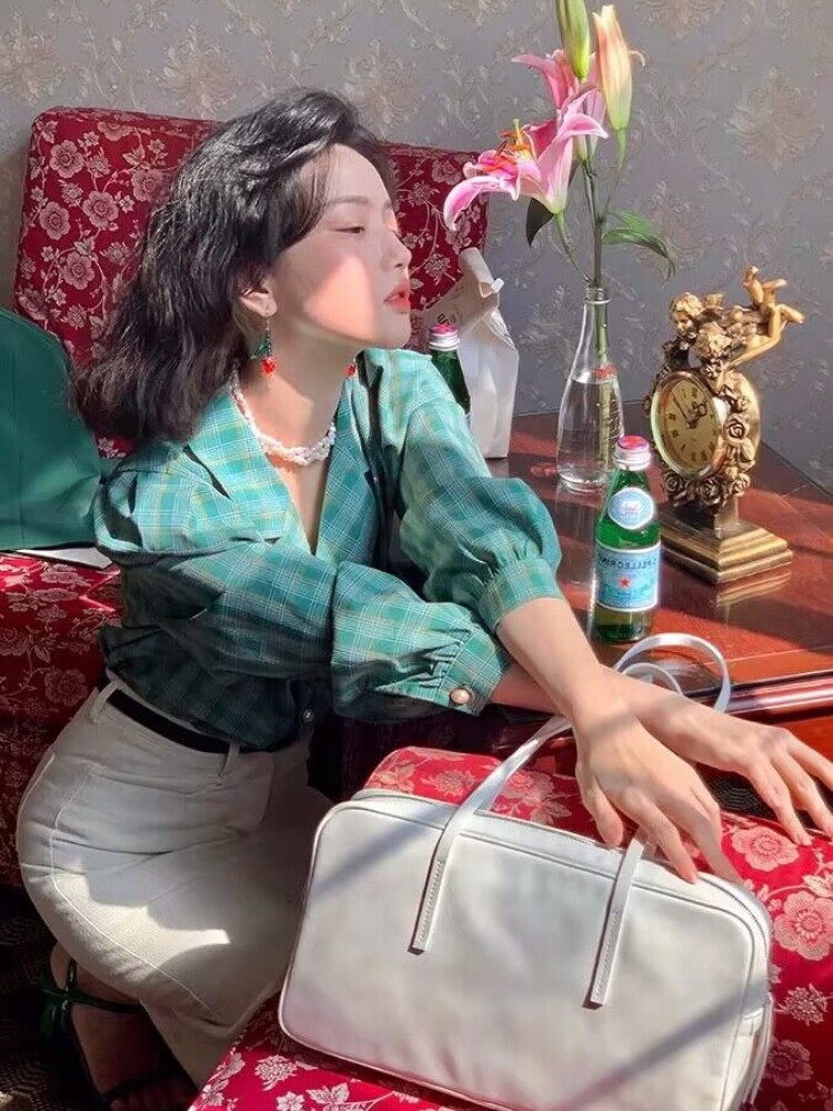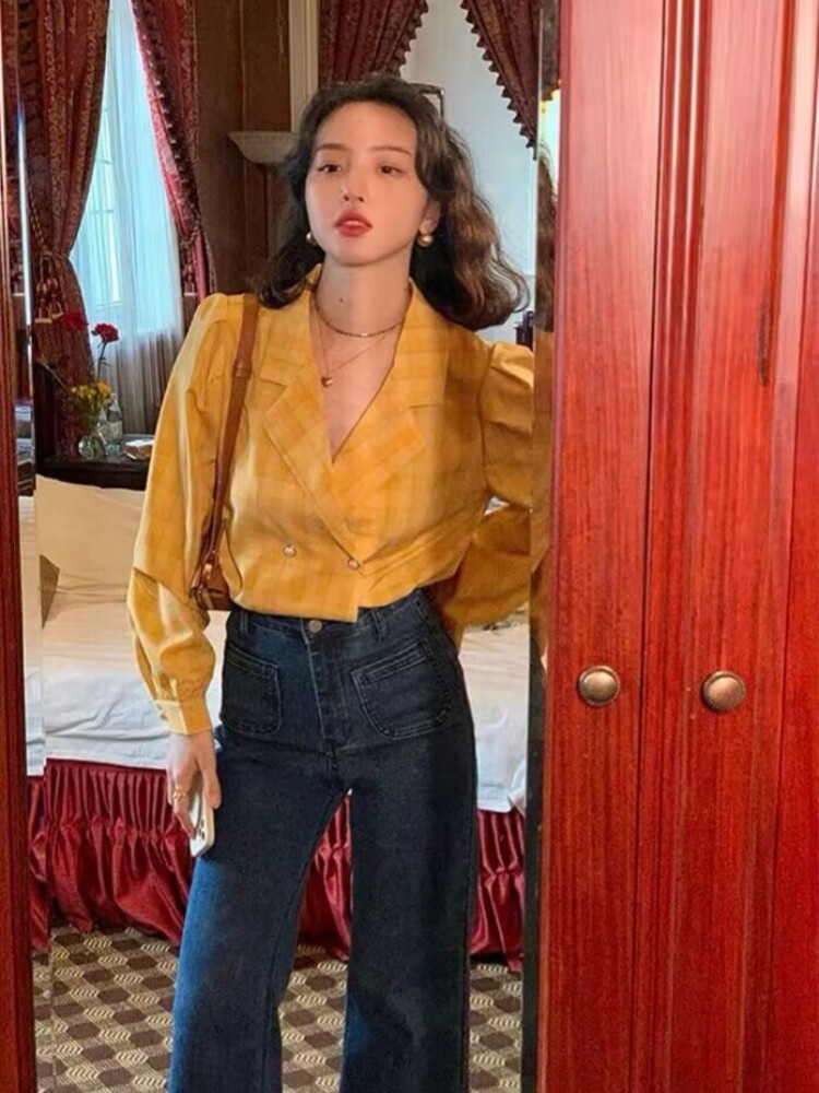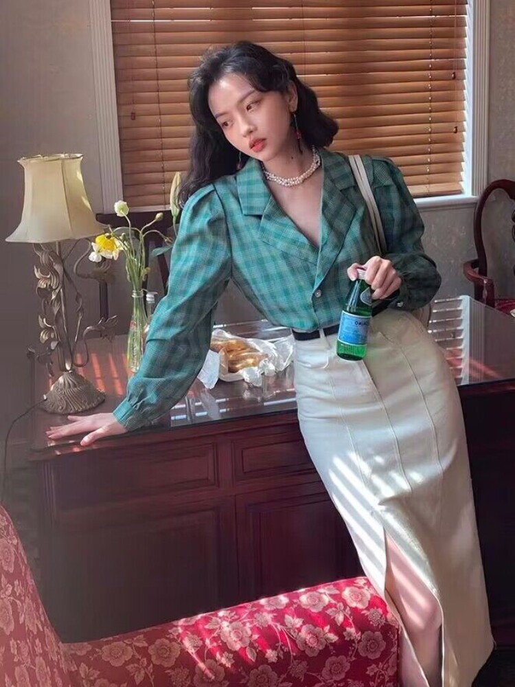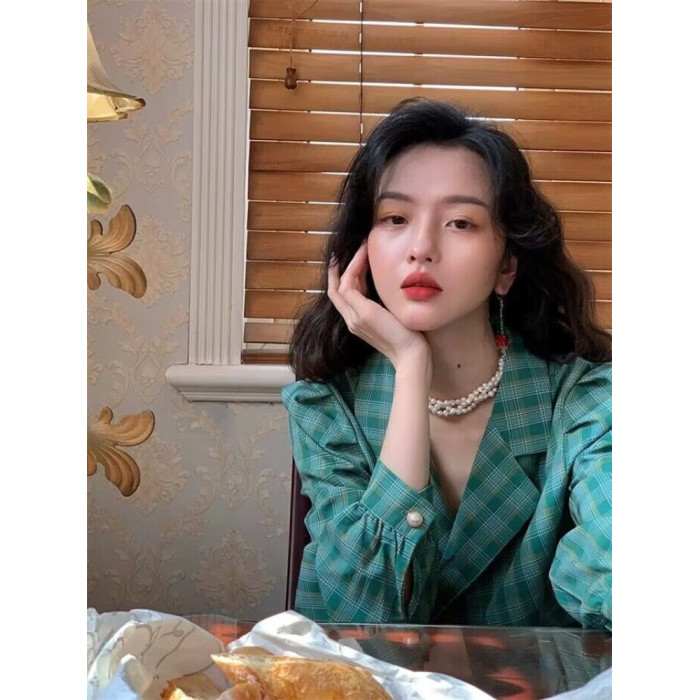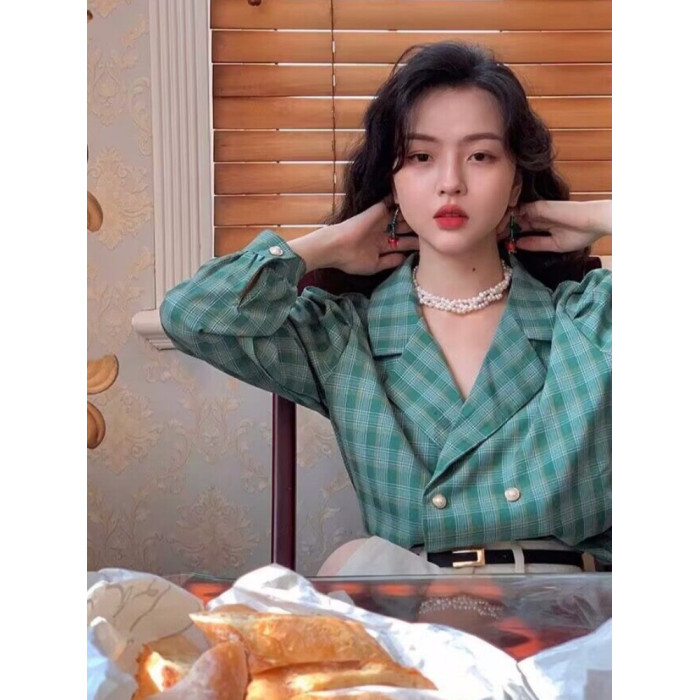 港風復古綠色泡泡袖格紋襯衫女2025年春季新款修身西裝領長袖上衣