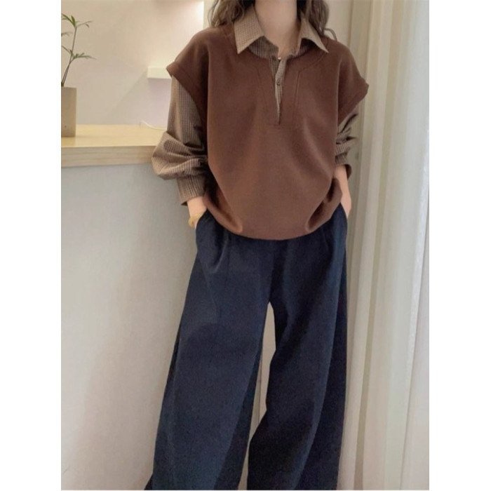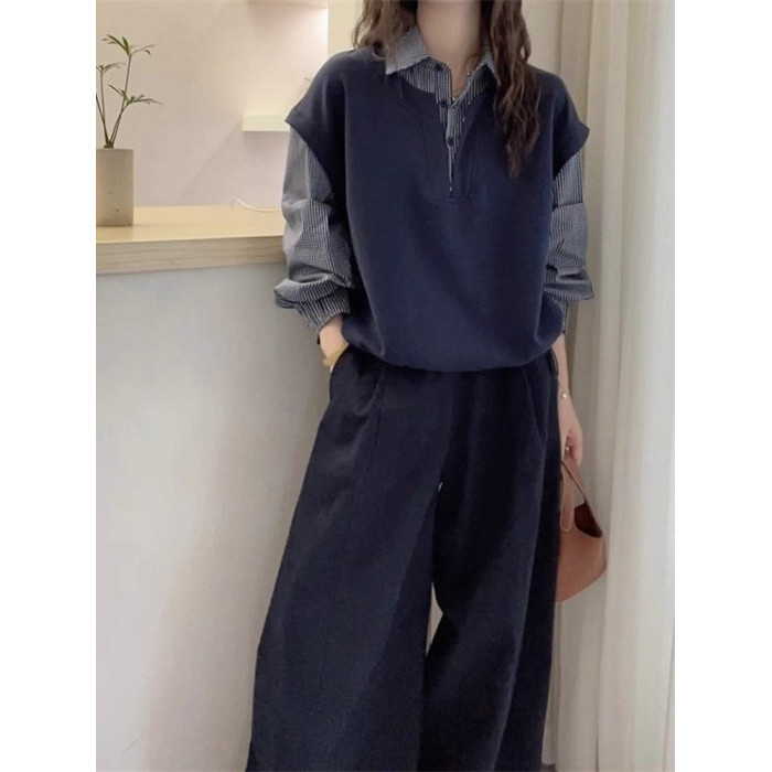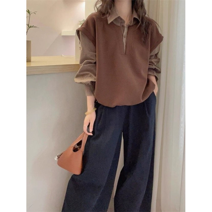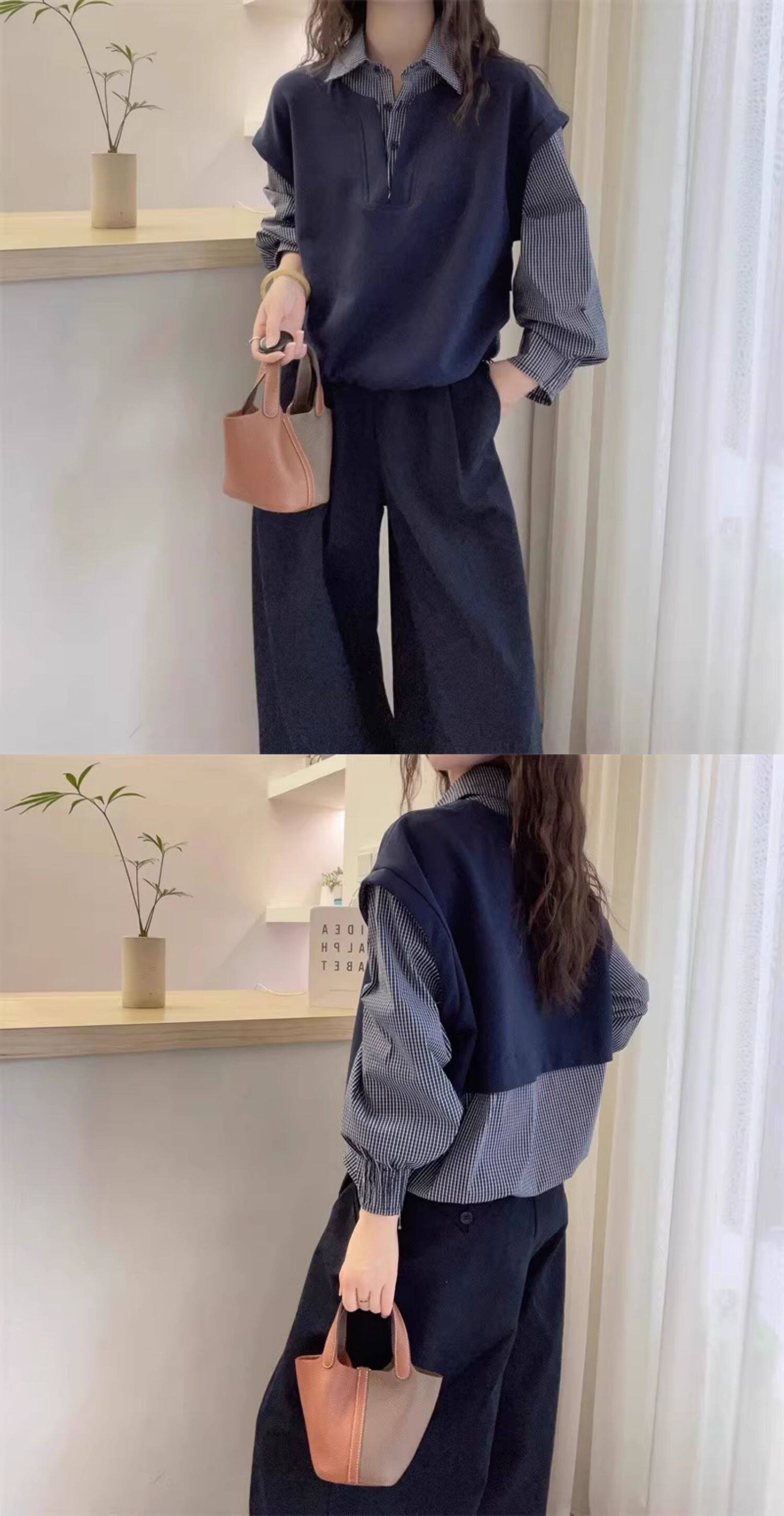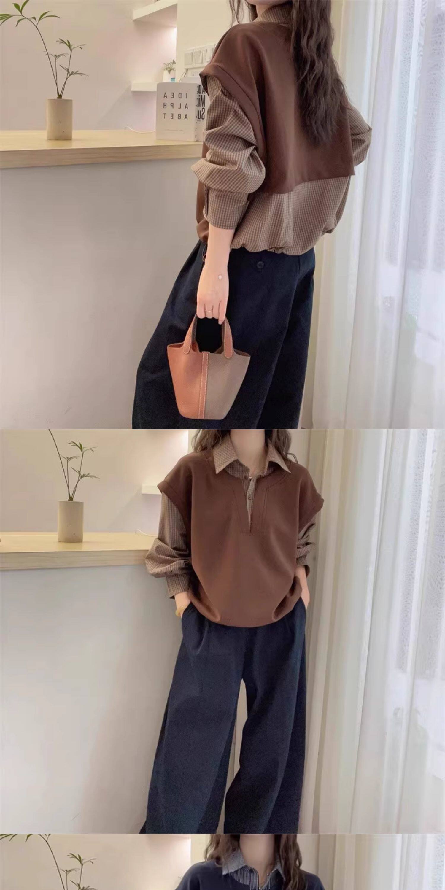 文藝復古格子襯衫女長袖春秋女裝2026設計感假兩件內搭打底衫上衣