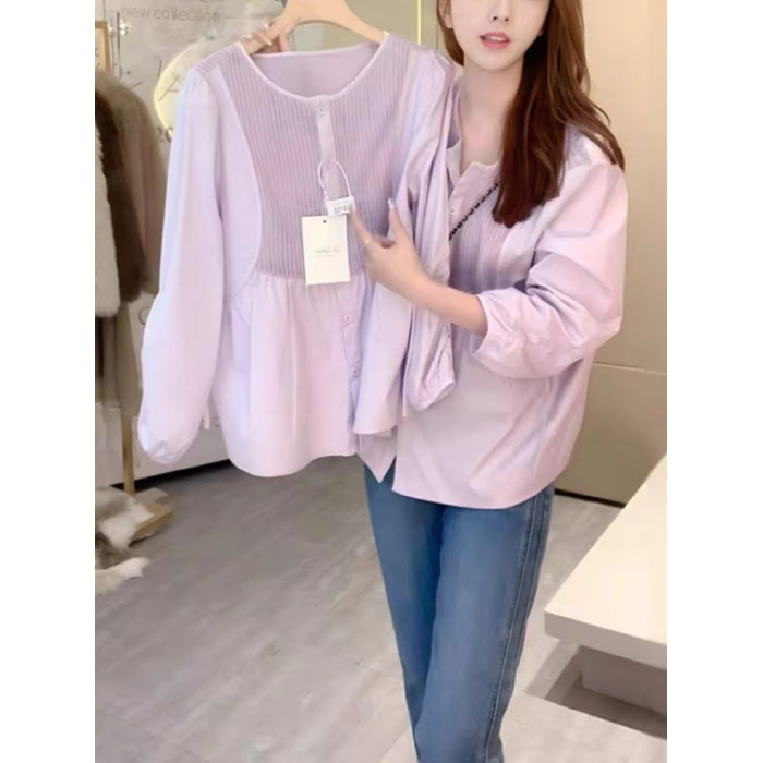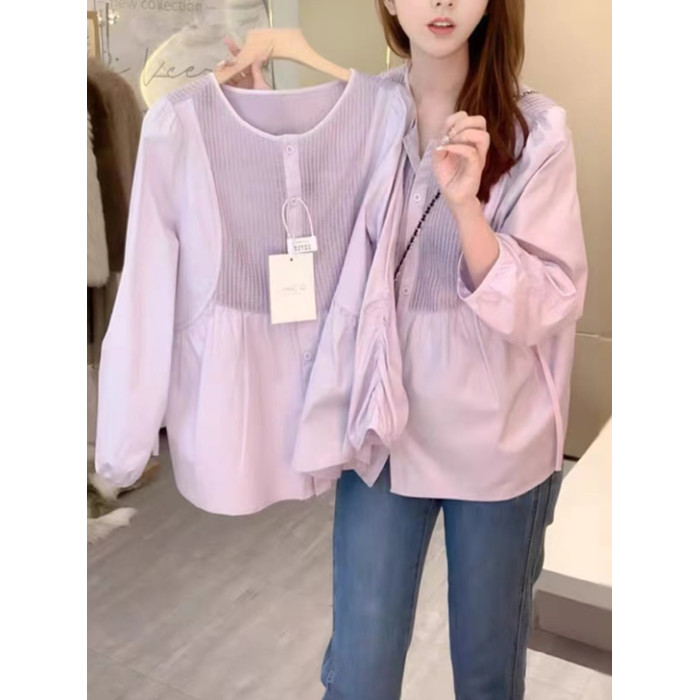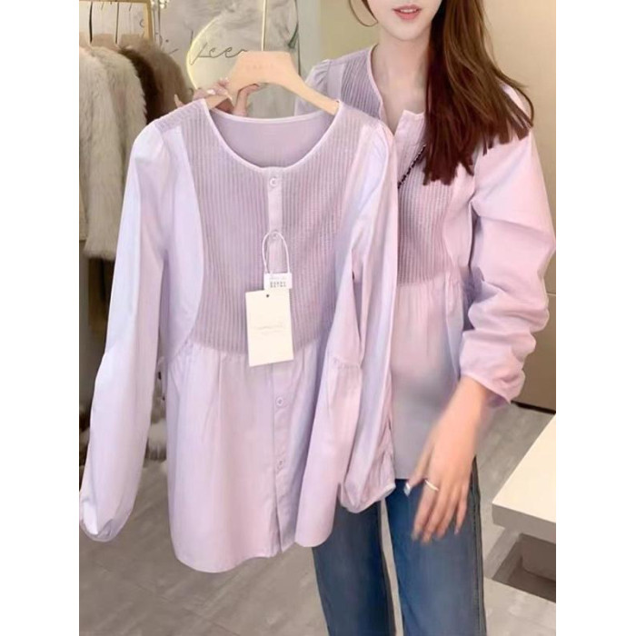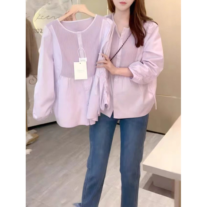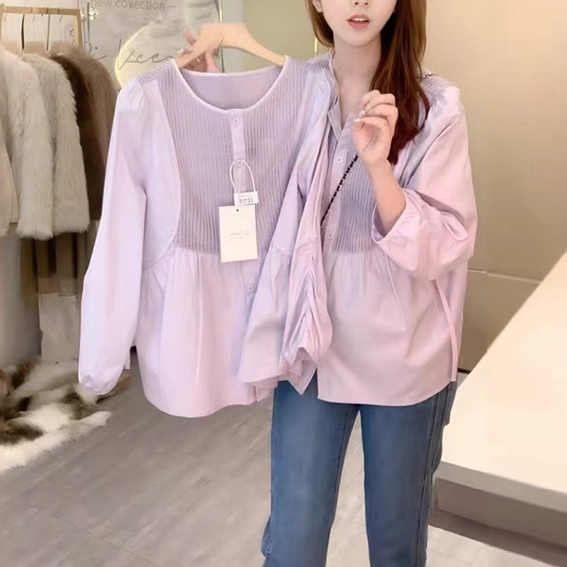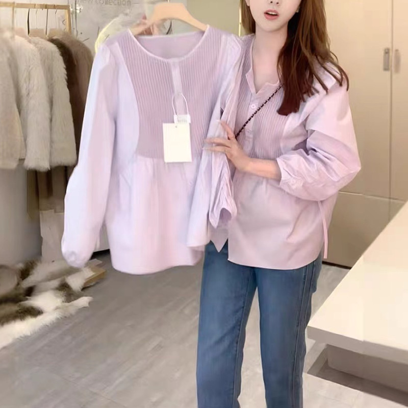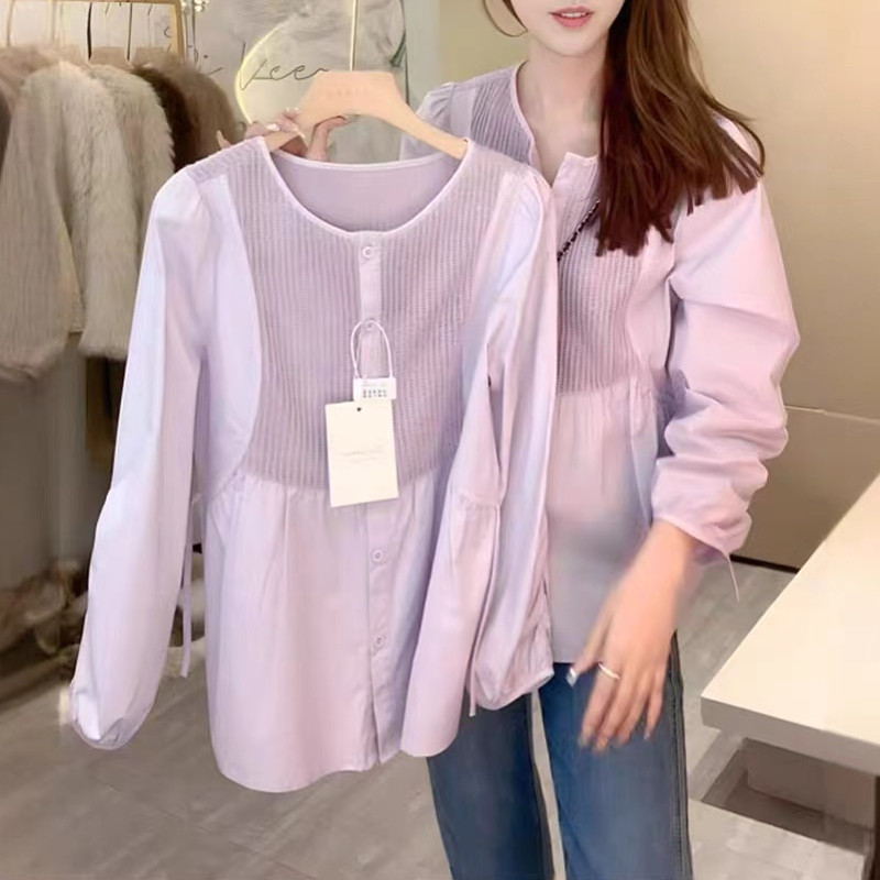 大碼紫色顯白設計感長袖襯衫女春季胖mm寬鬆遮肚顯瘦外穿小衫上衣