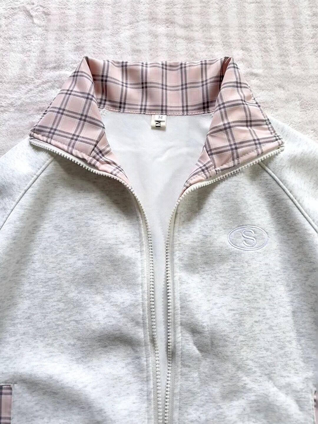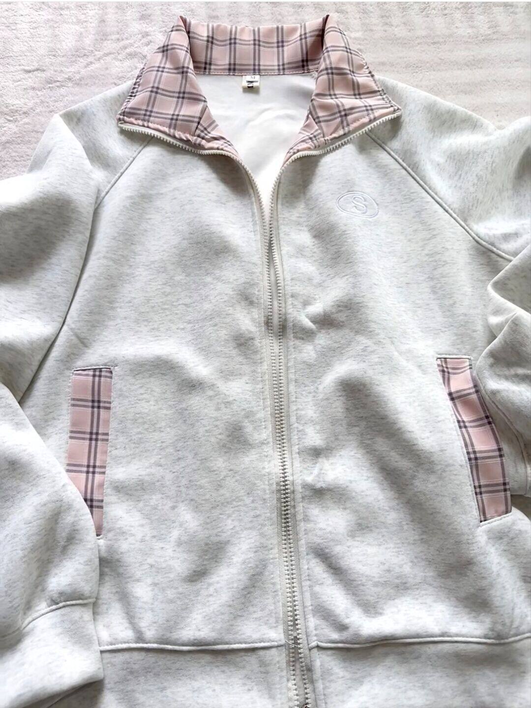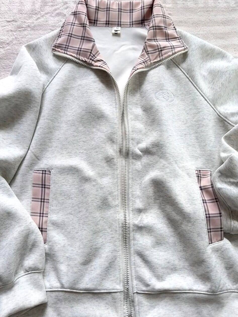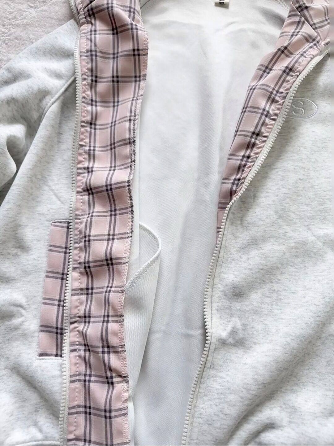 美式復古格子拼接連帽衛衣女春秋加絨寬鬆慵懶風oversize開衫外套
