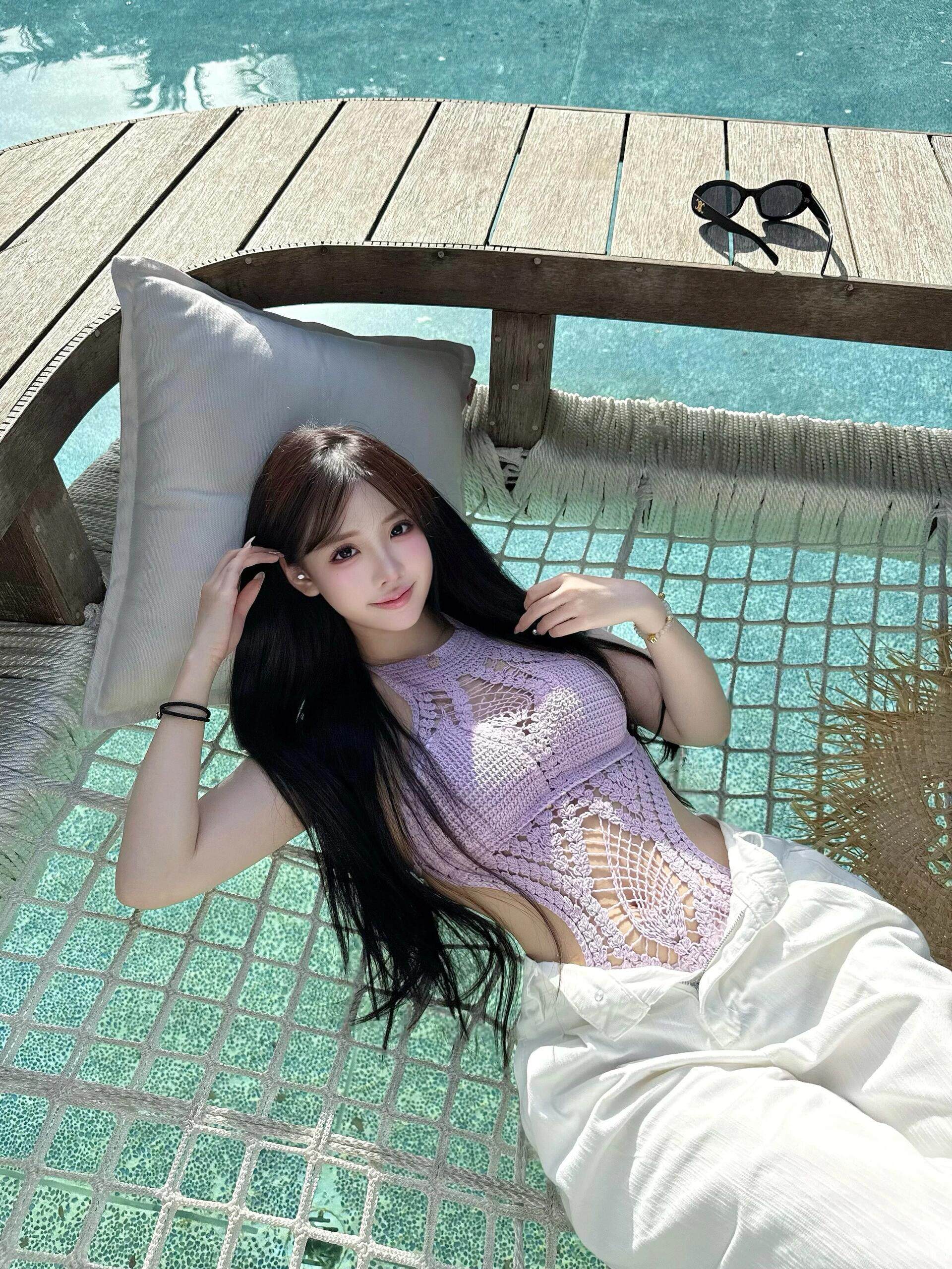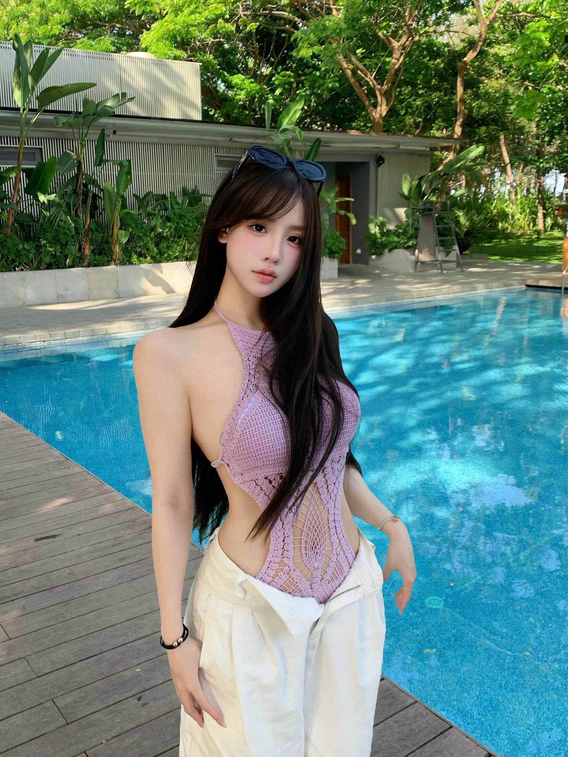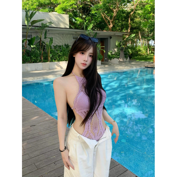 OUTFlT 歐美辣妹風性感鏤空針織掛脖連體泳衣女2025新款修身顯瘦