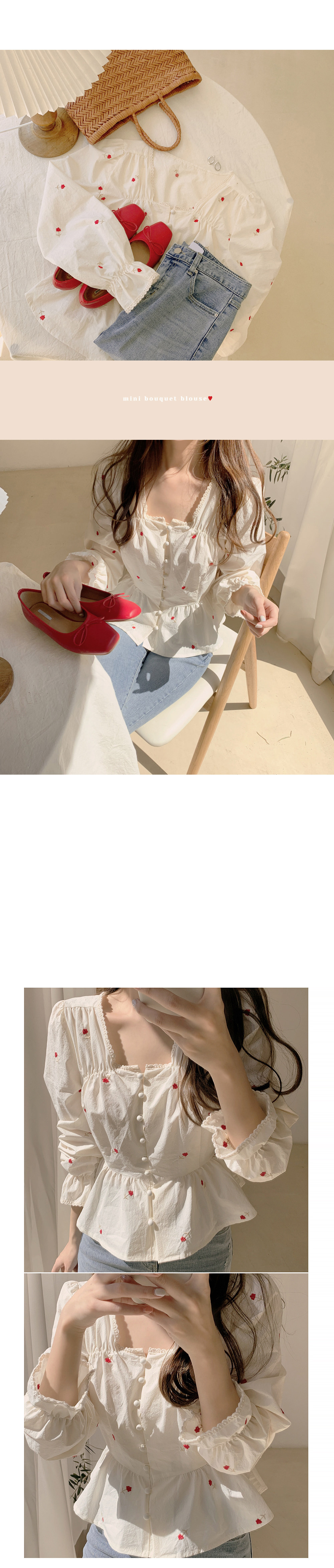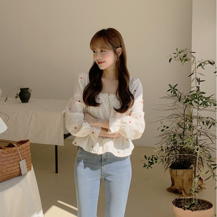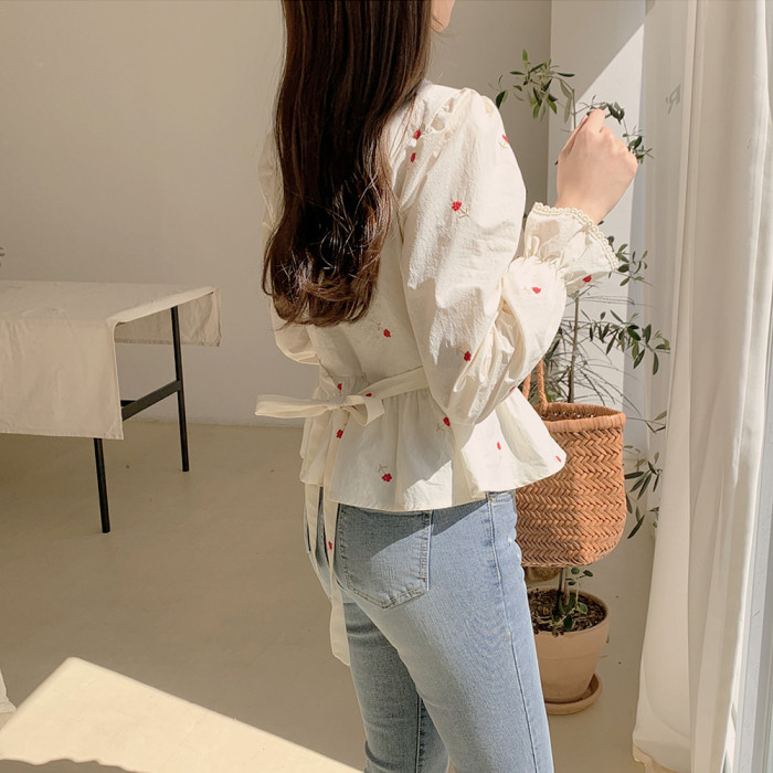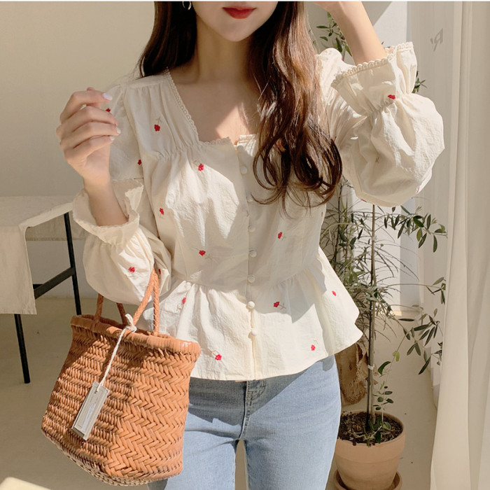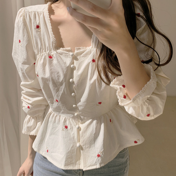 別致法式設計感小碎花襯衫女早春氣質收腰短款方領長袖上衣泡泡袖
