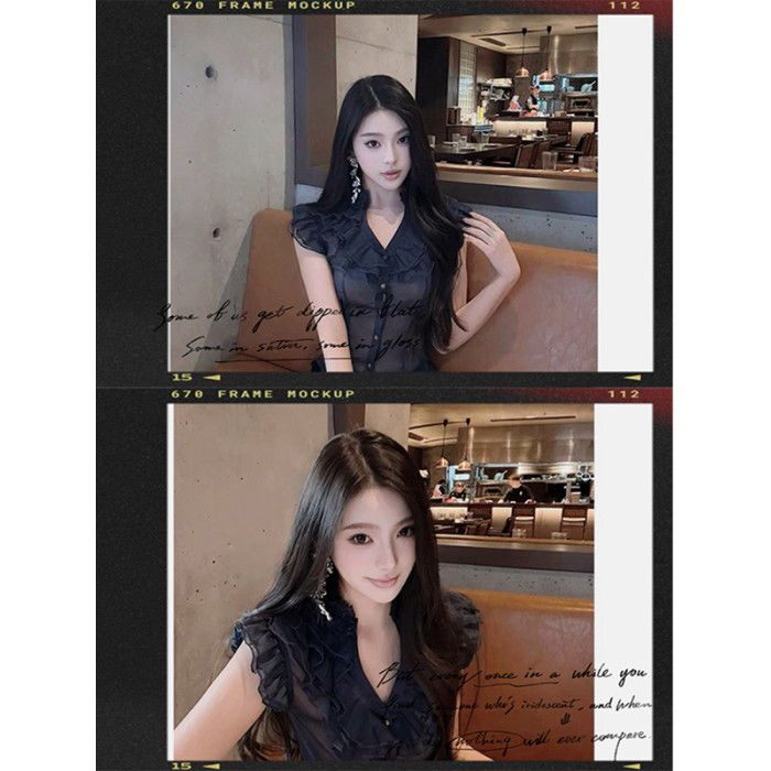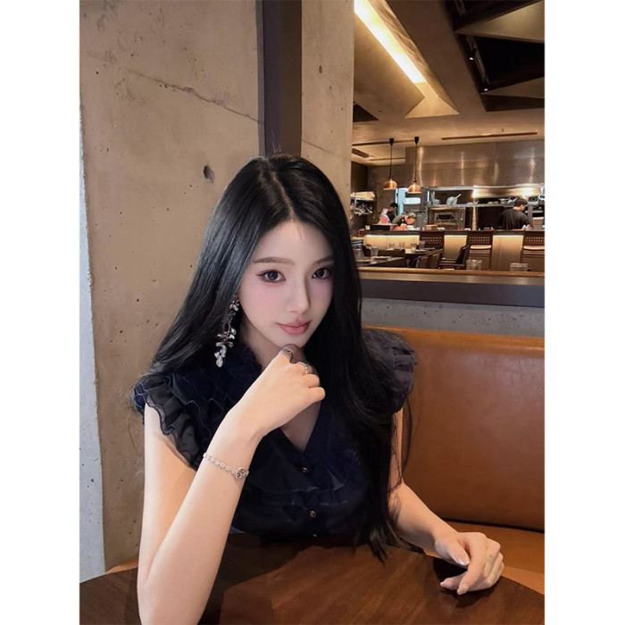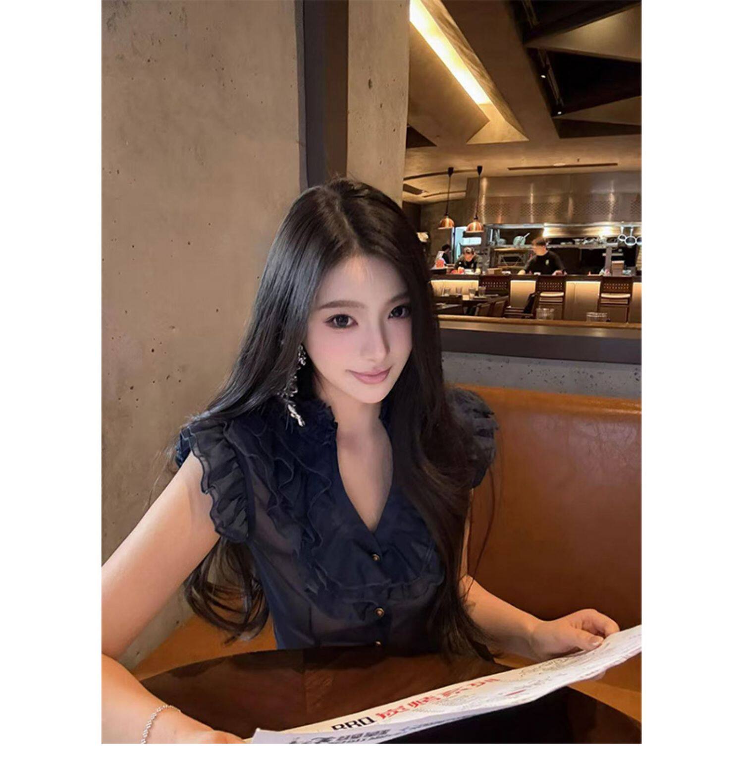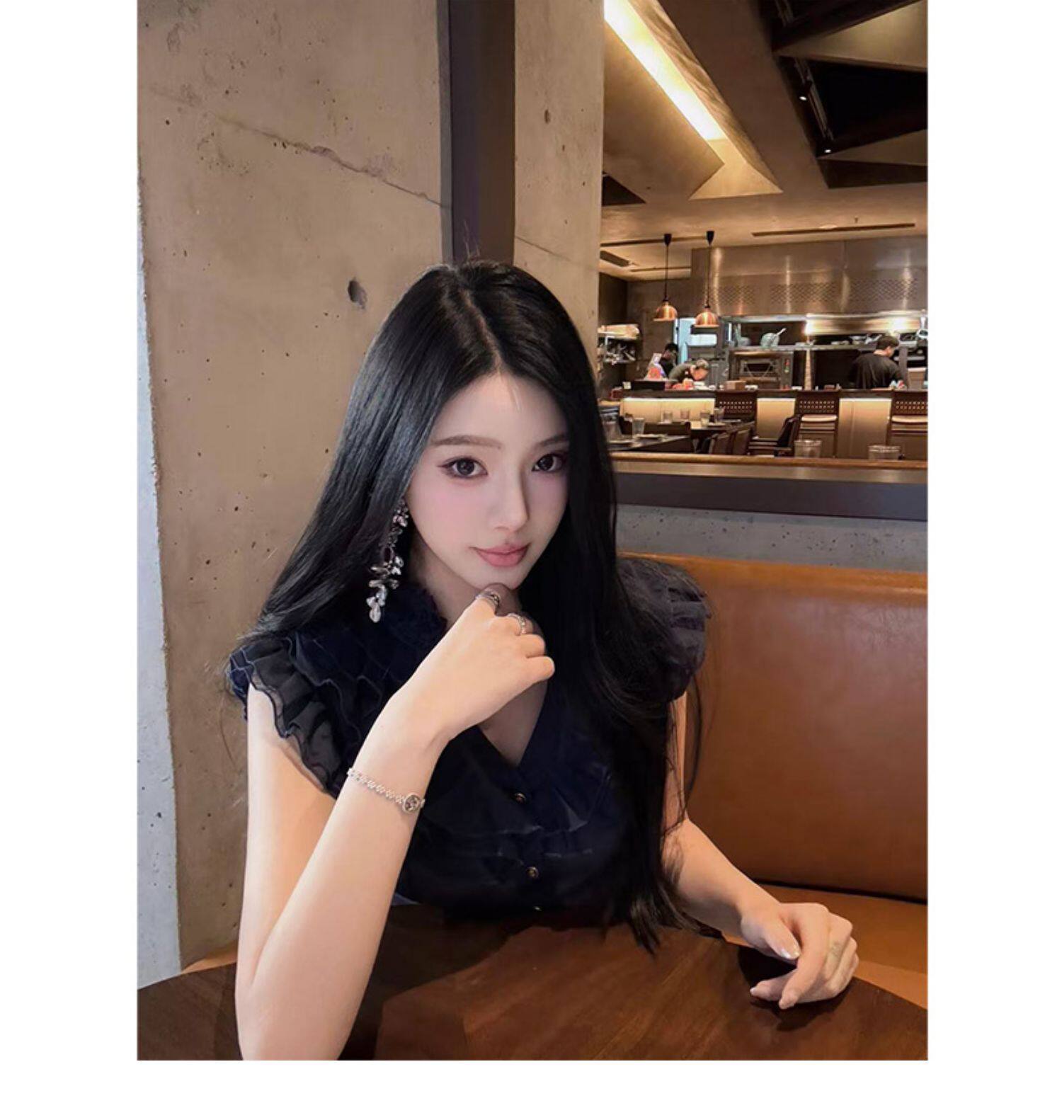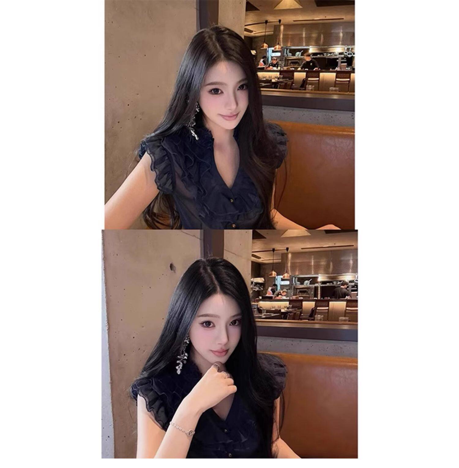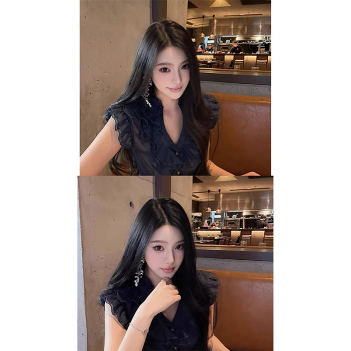 Turn right/陳大腿 法式氣質性感多層次襯衫女黑色木耳邊設計上衣