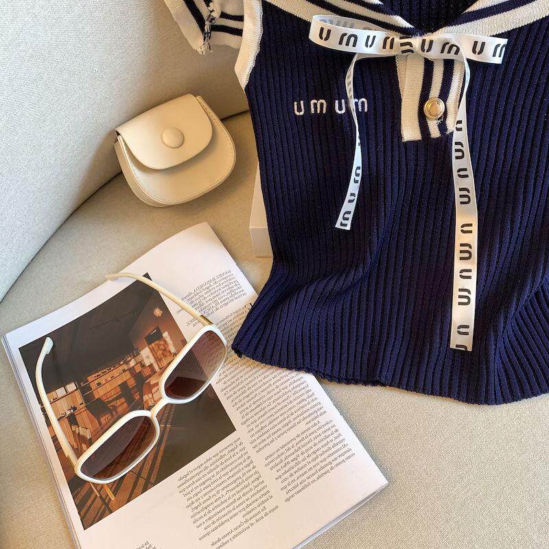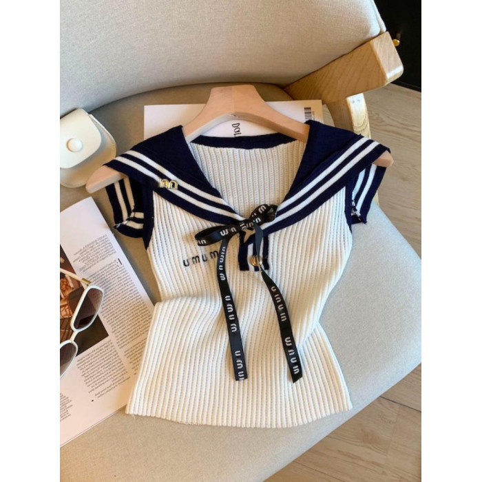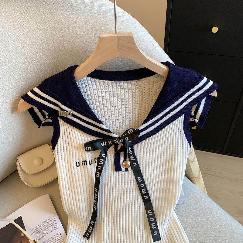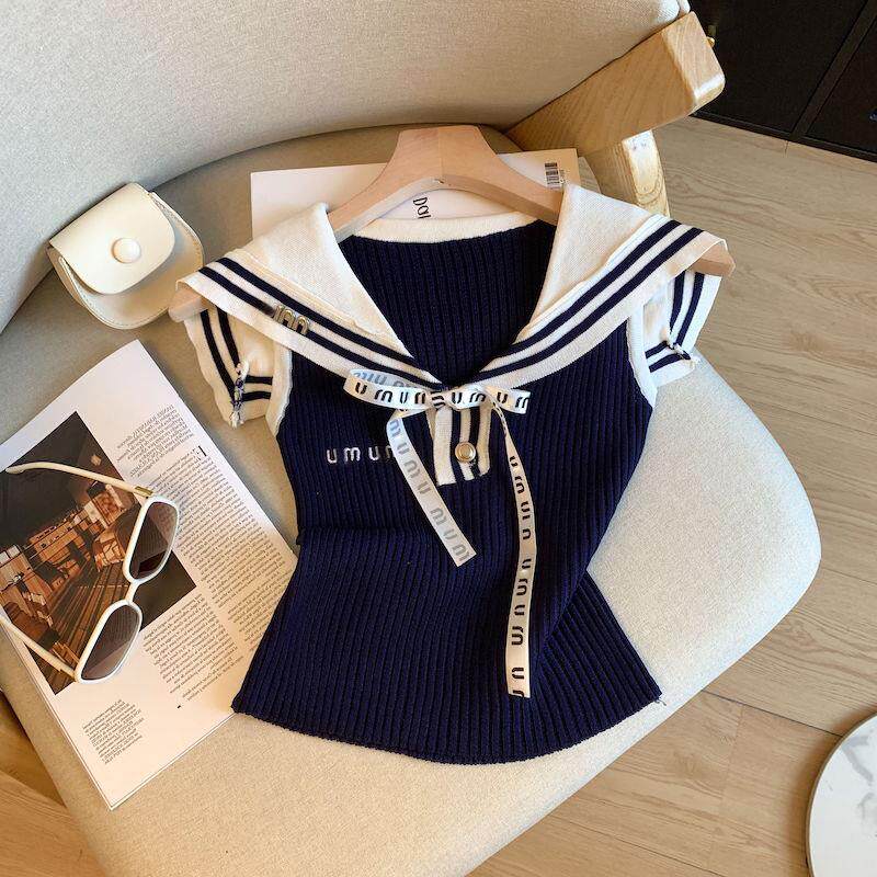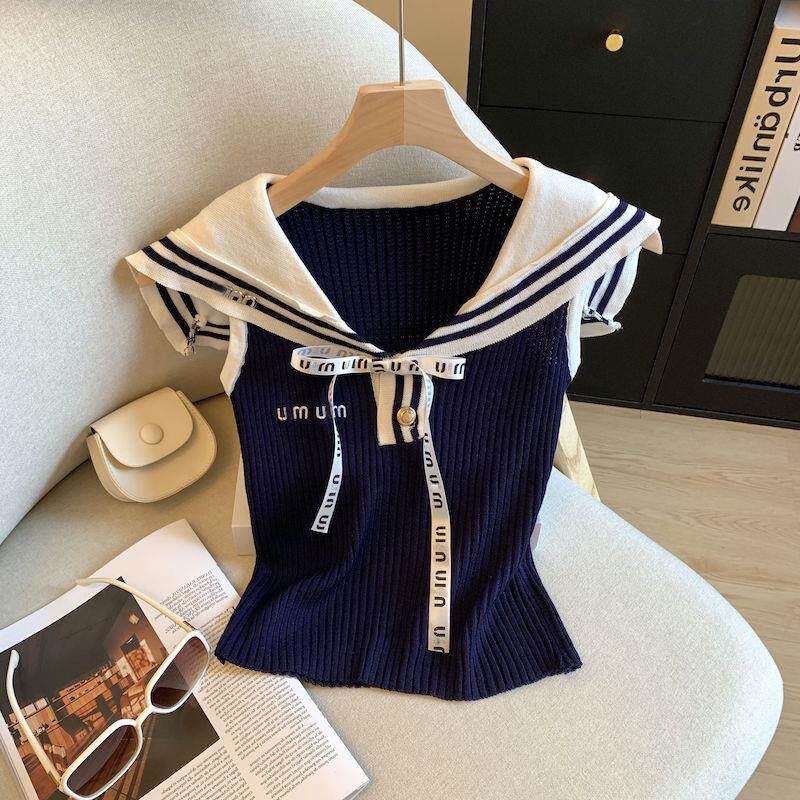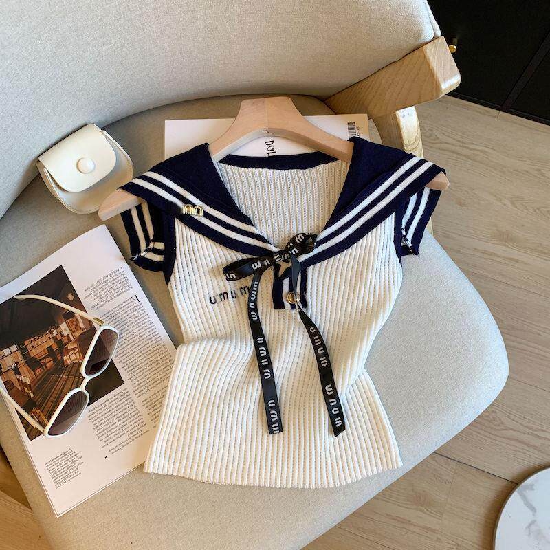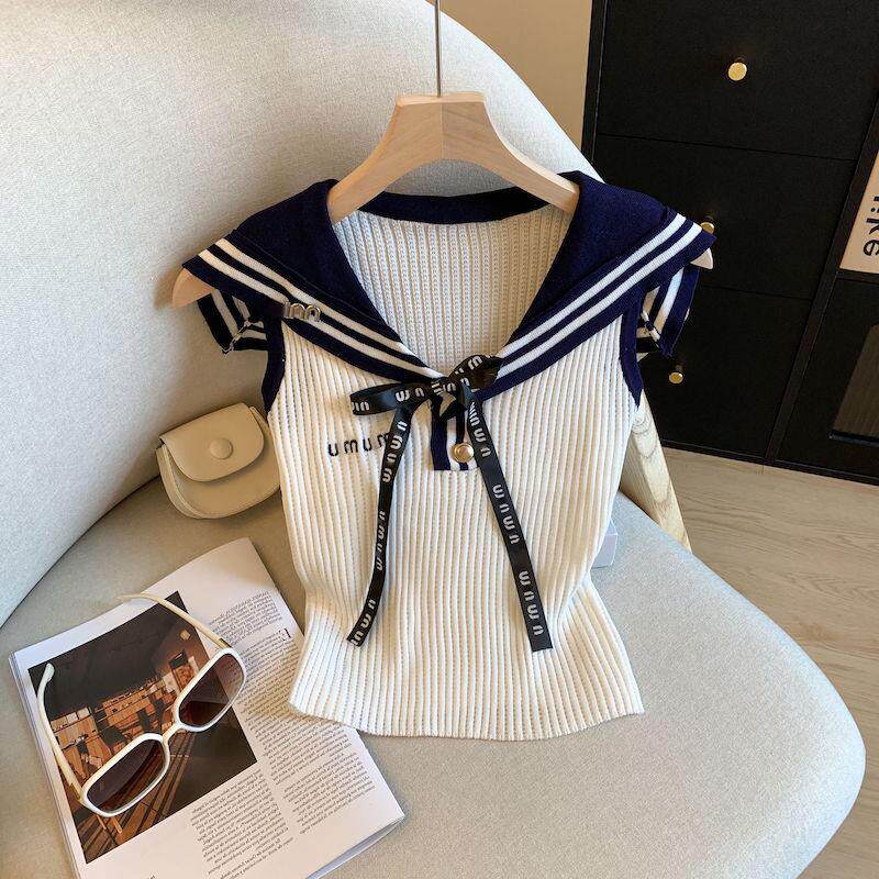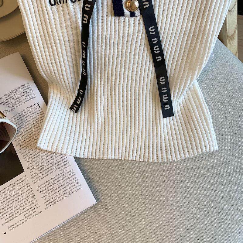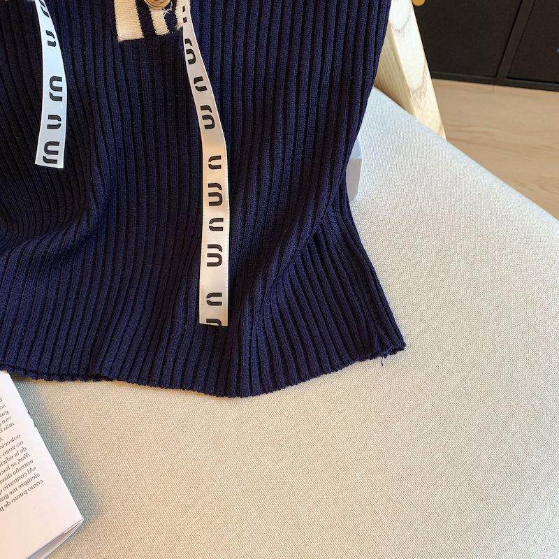 專櫃撤廻剪標字母刺綉針織背心女夏季新款蝴蝶結系帶披肩短款上衣