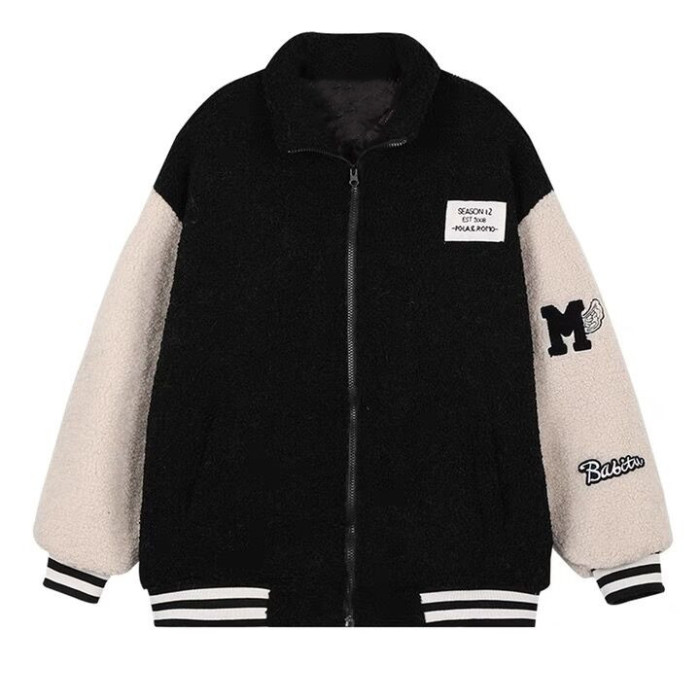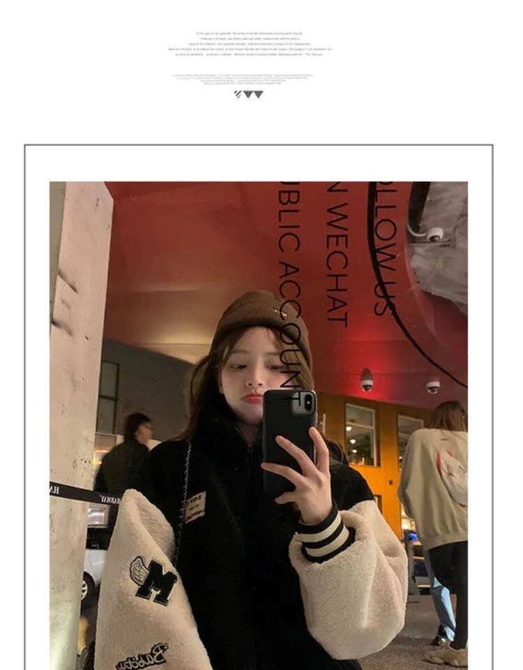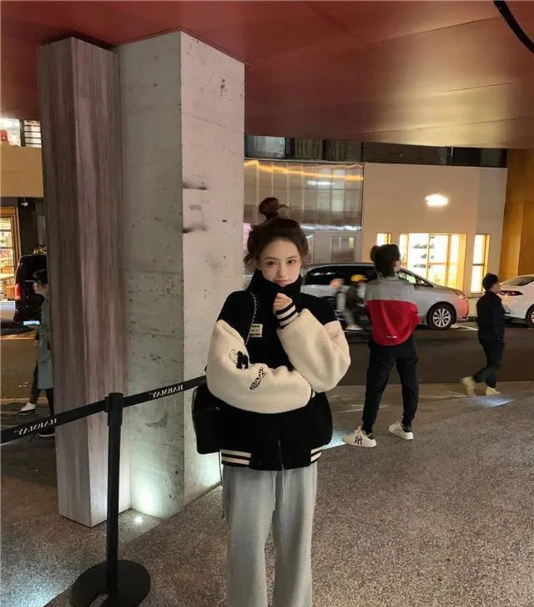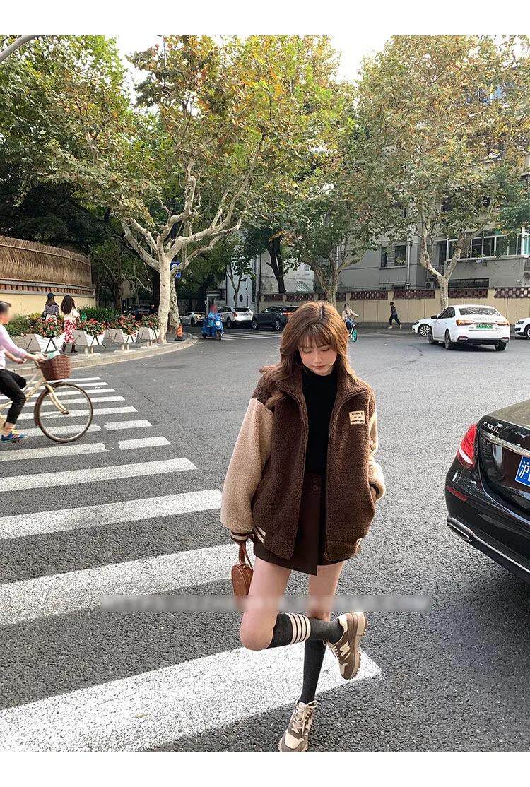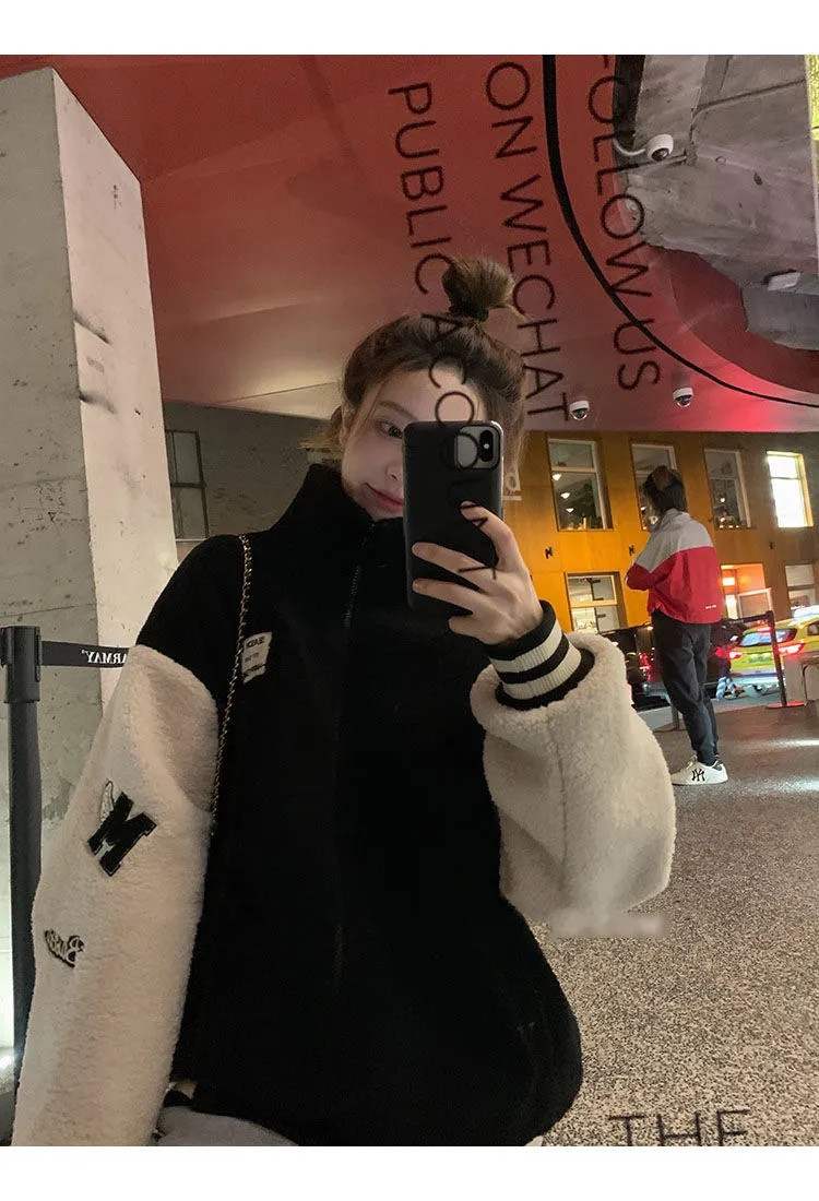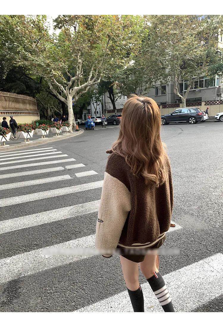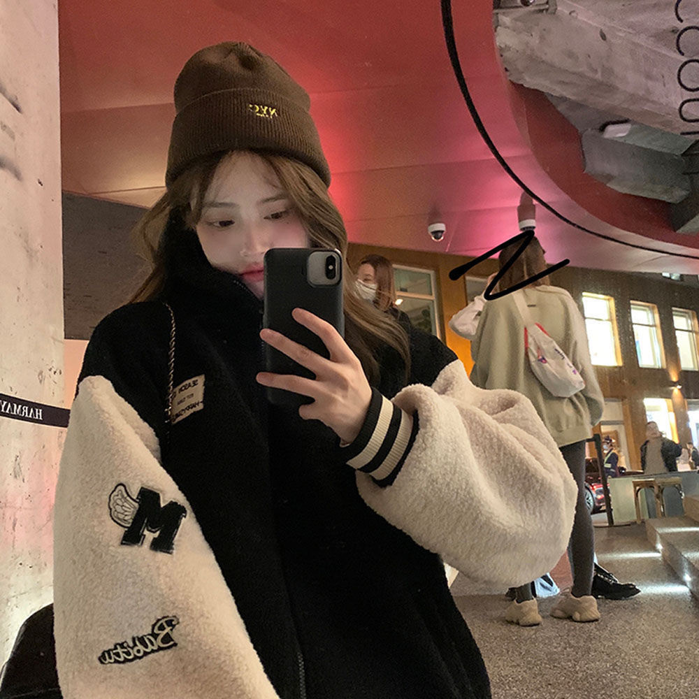 秋冬季小個子休閒棒球服外套女羊羔毛加絨加厚慵懶風寬鬆百搭棉衣