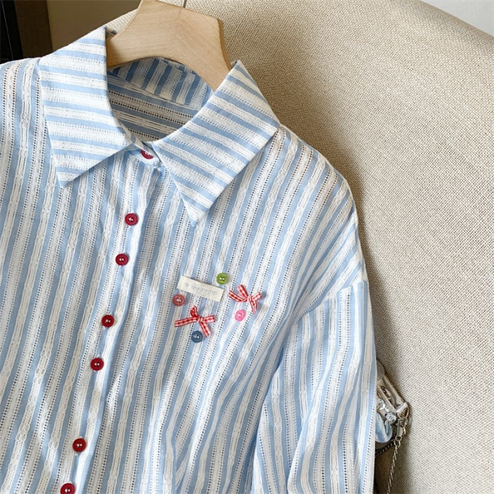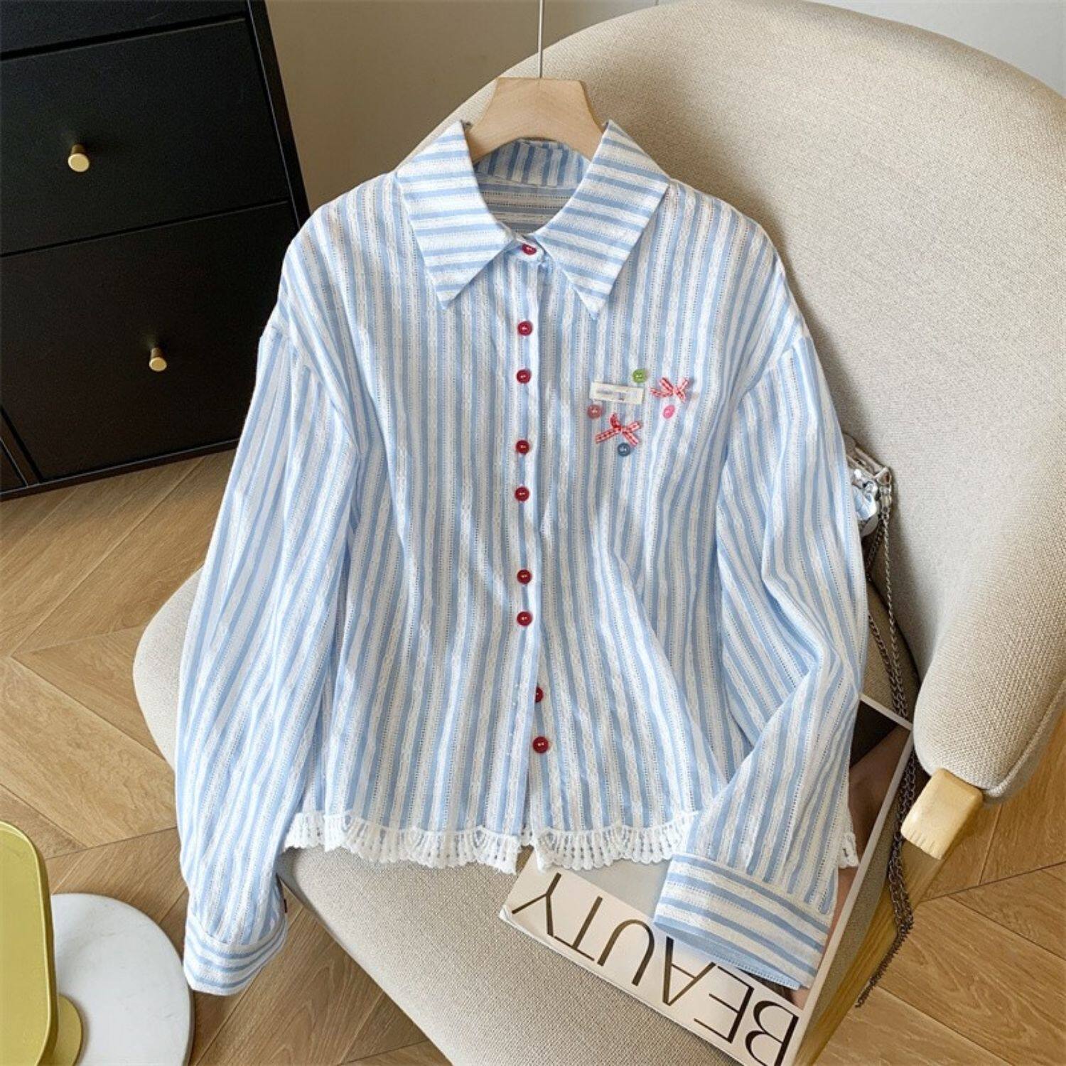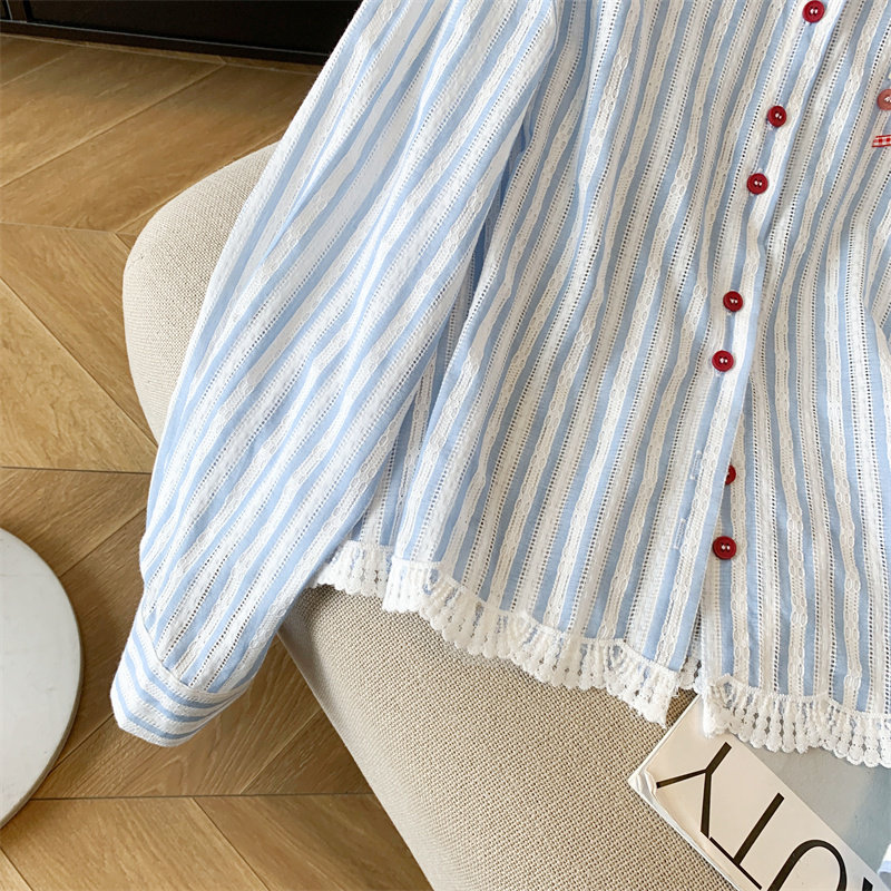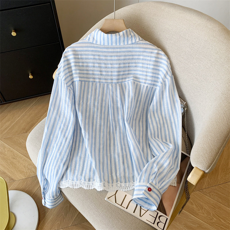 專櫃撤廻剪標韓系POLO領藍色條紋襯衫女春季新款洋氣百搭休閒上衣