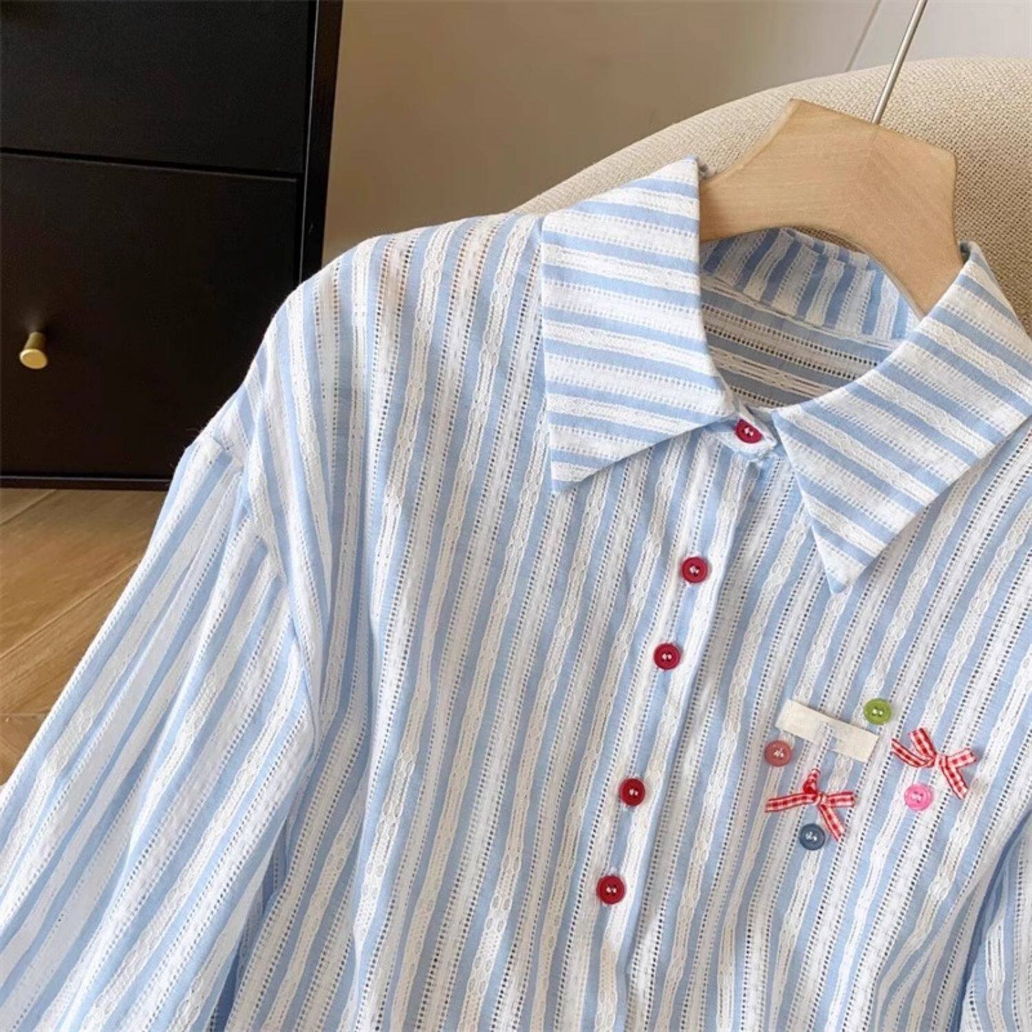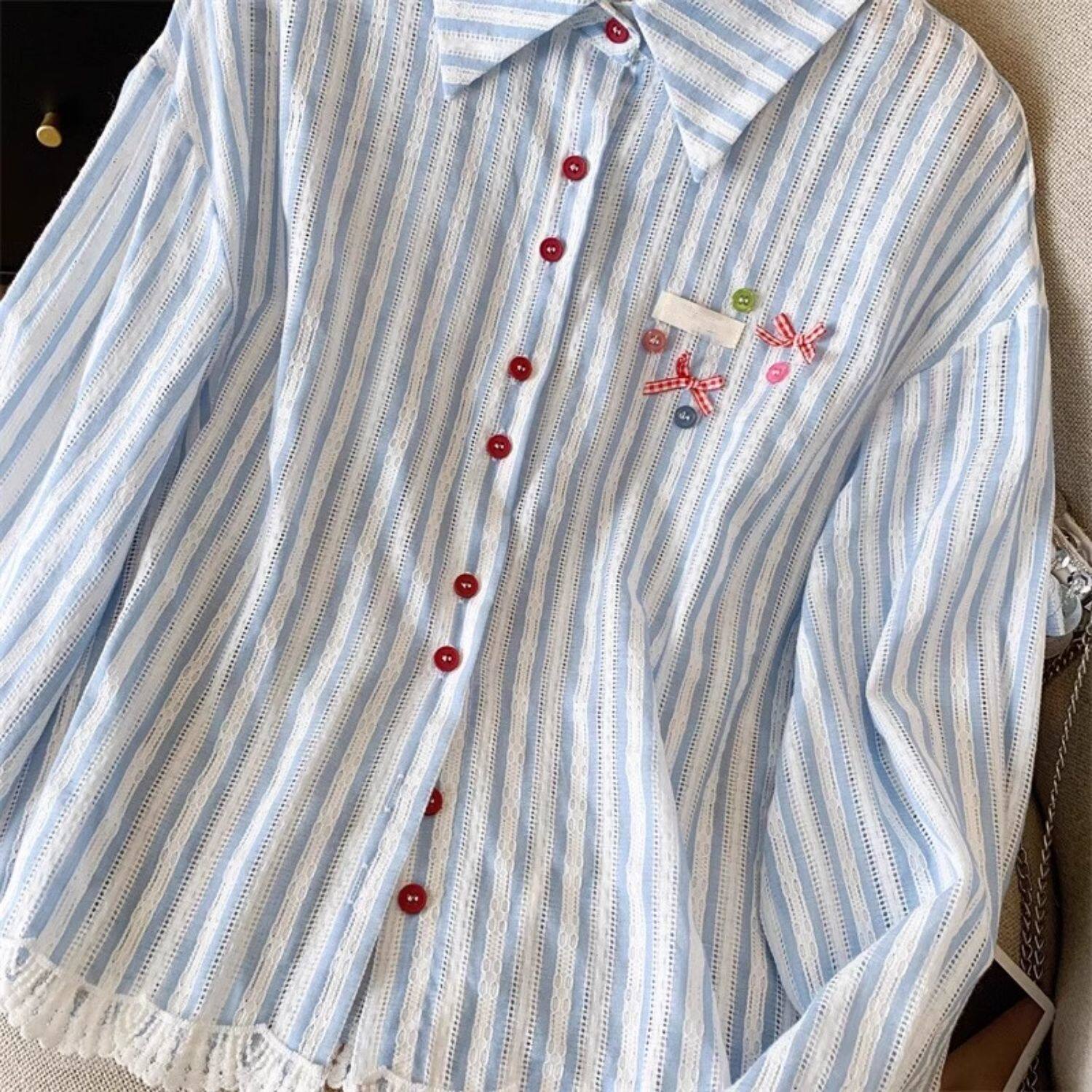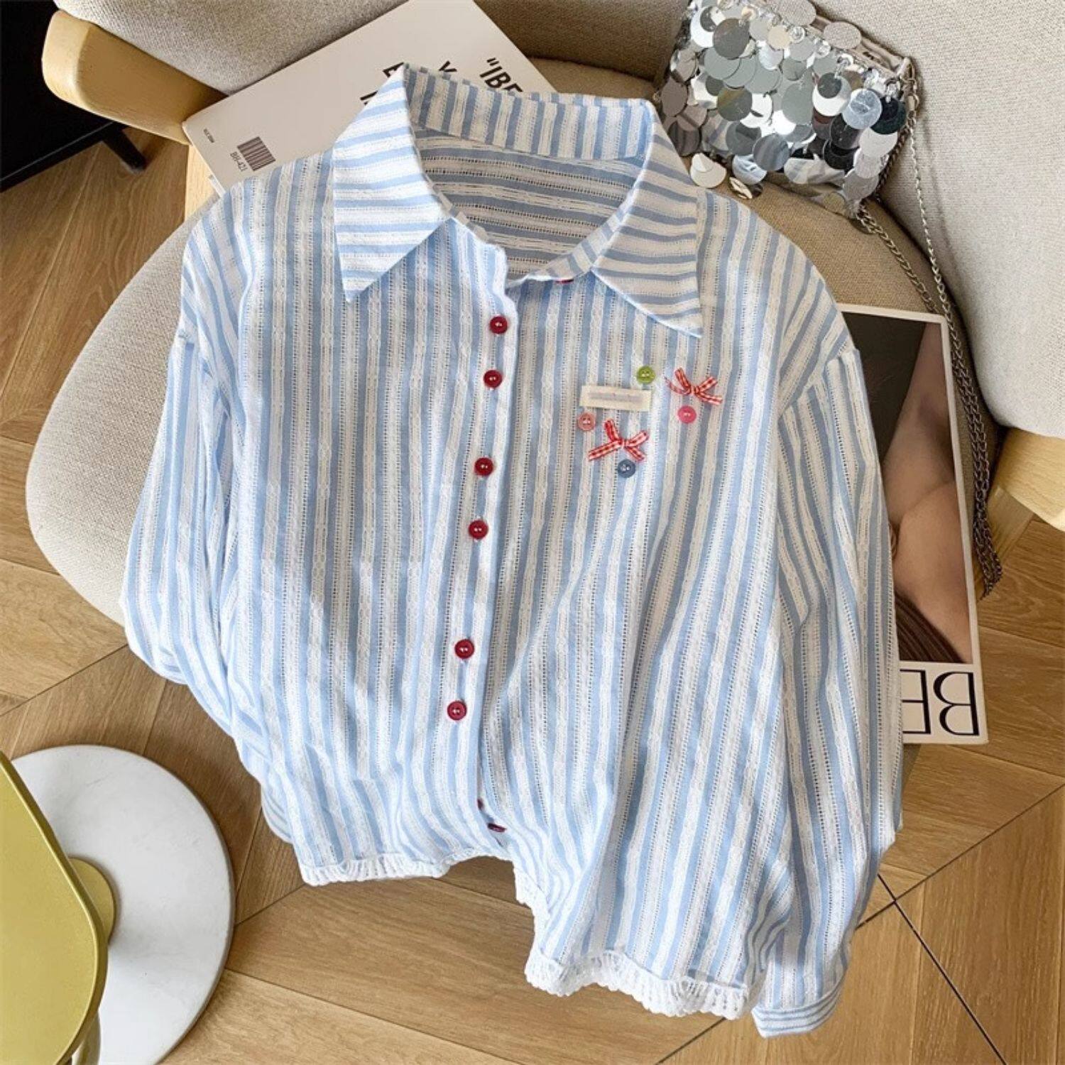 專櫃撤廻剪標韓系POLO領藍色條紋襯衫女春季新款洋氣百搭休閒上衣