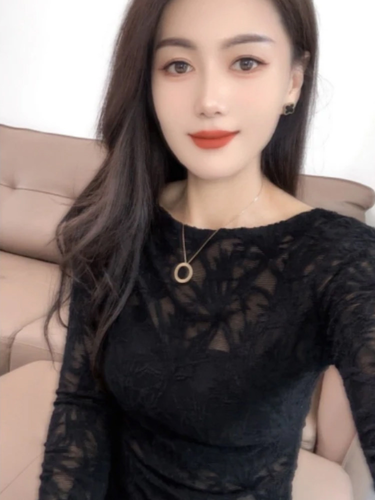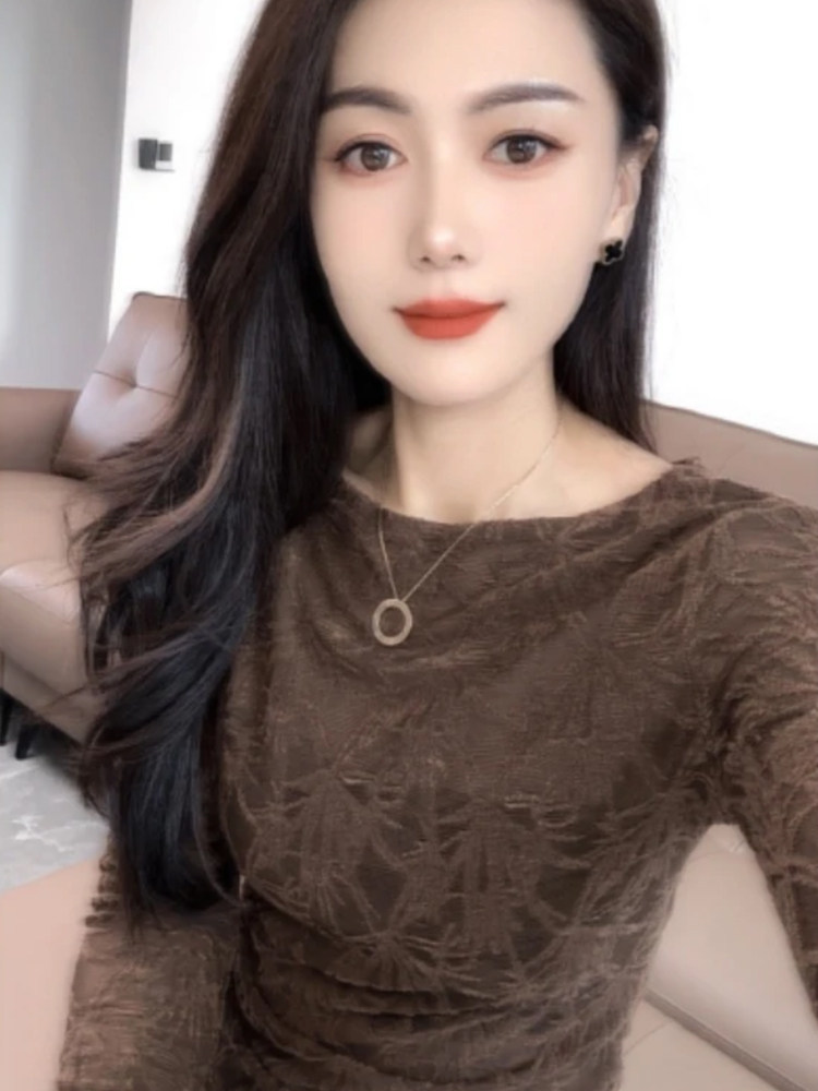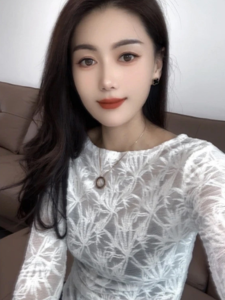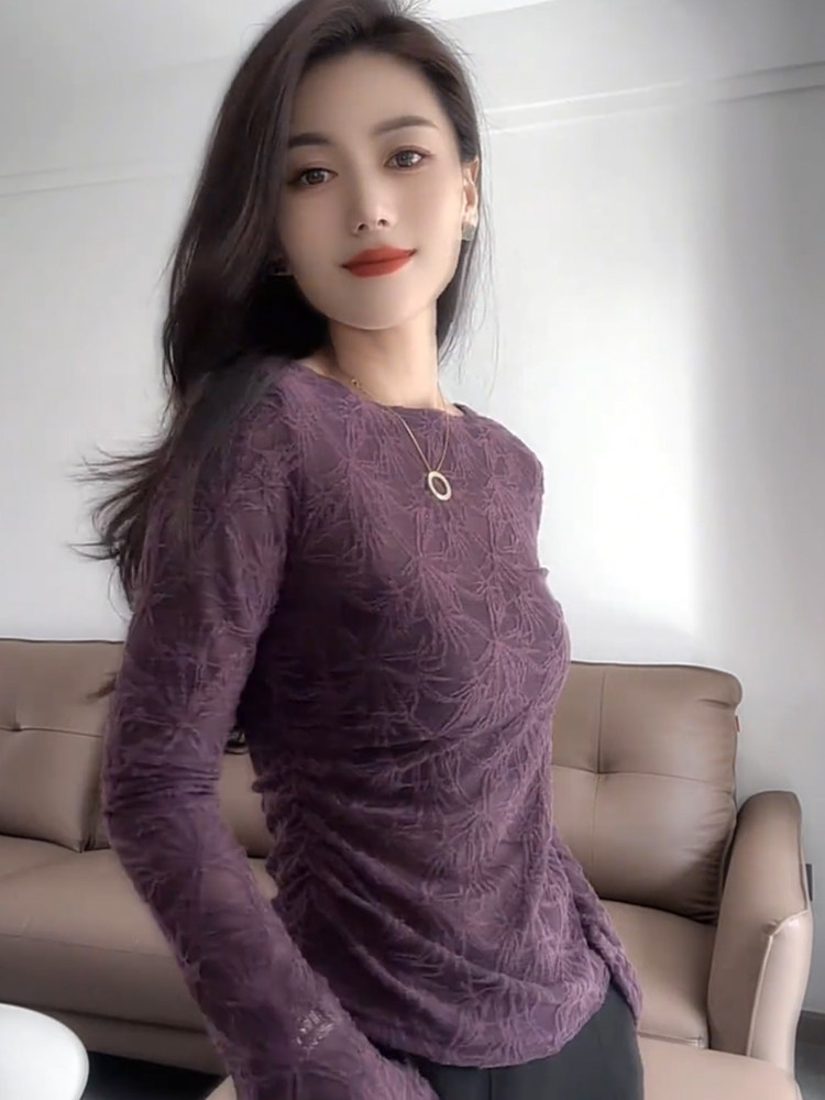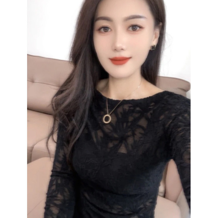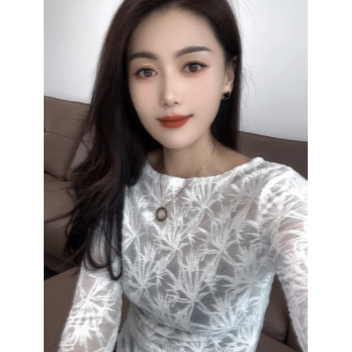 法式圓領微透刺綉提花長袖T恤女秋季2025新款性感修身顯瘦打底衫