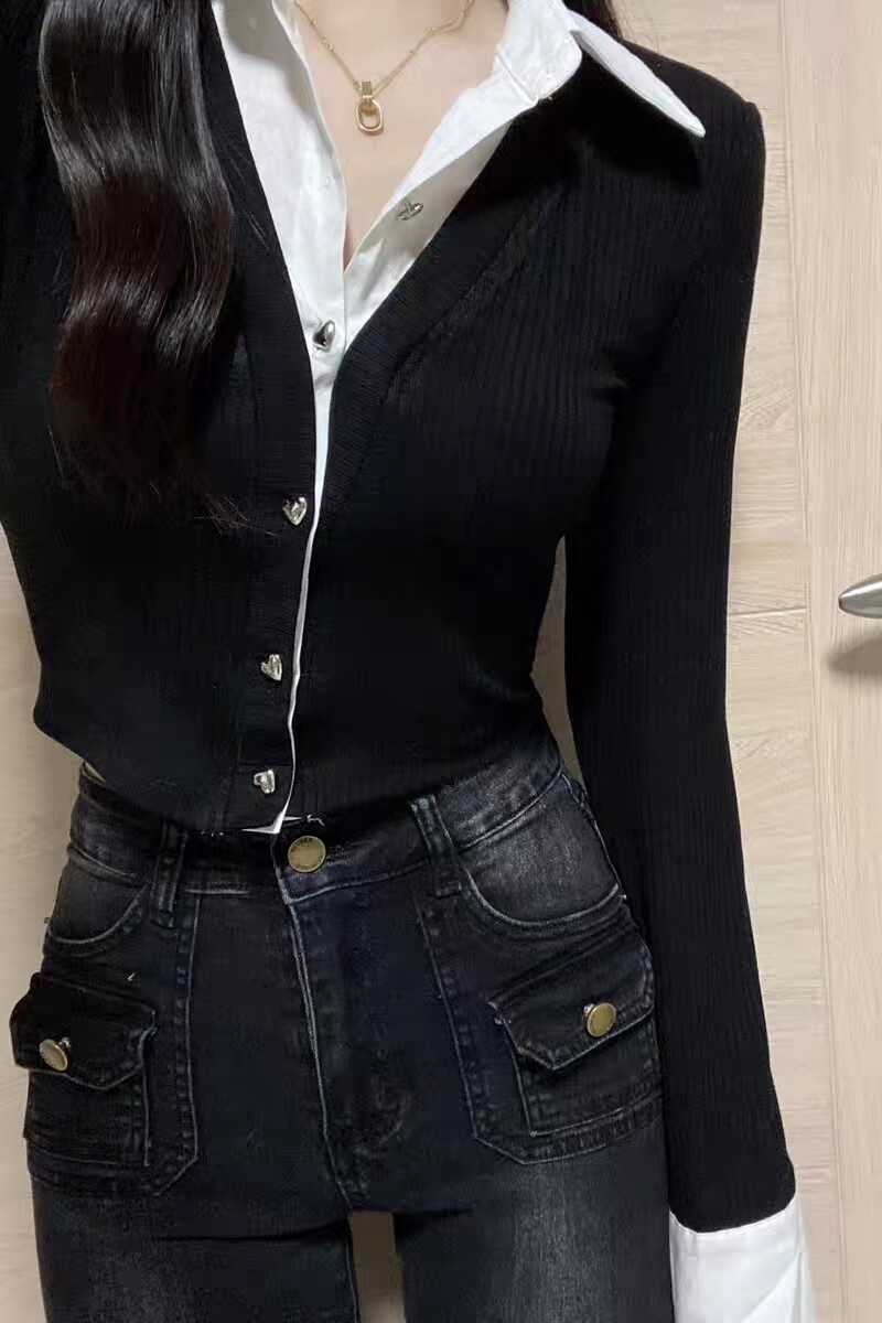 大碼胖妹妹假兩件polo領襯衫女春秋冬v領內搭打底衫修身針織上衣