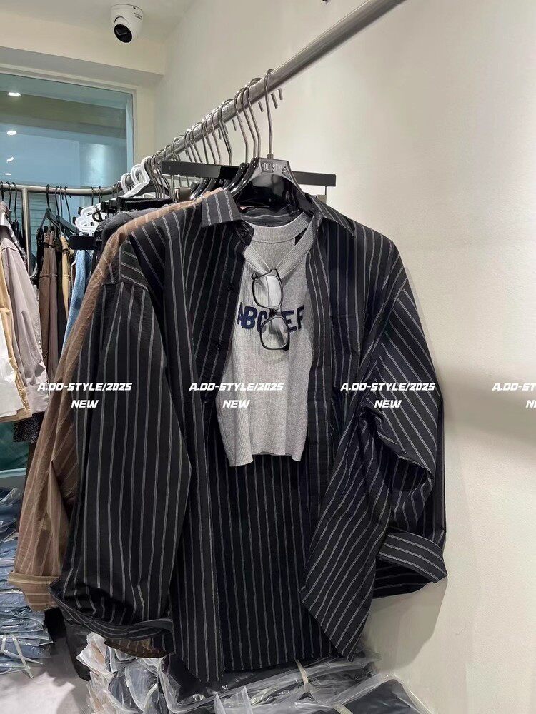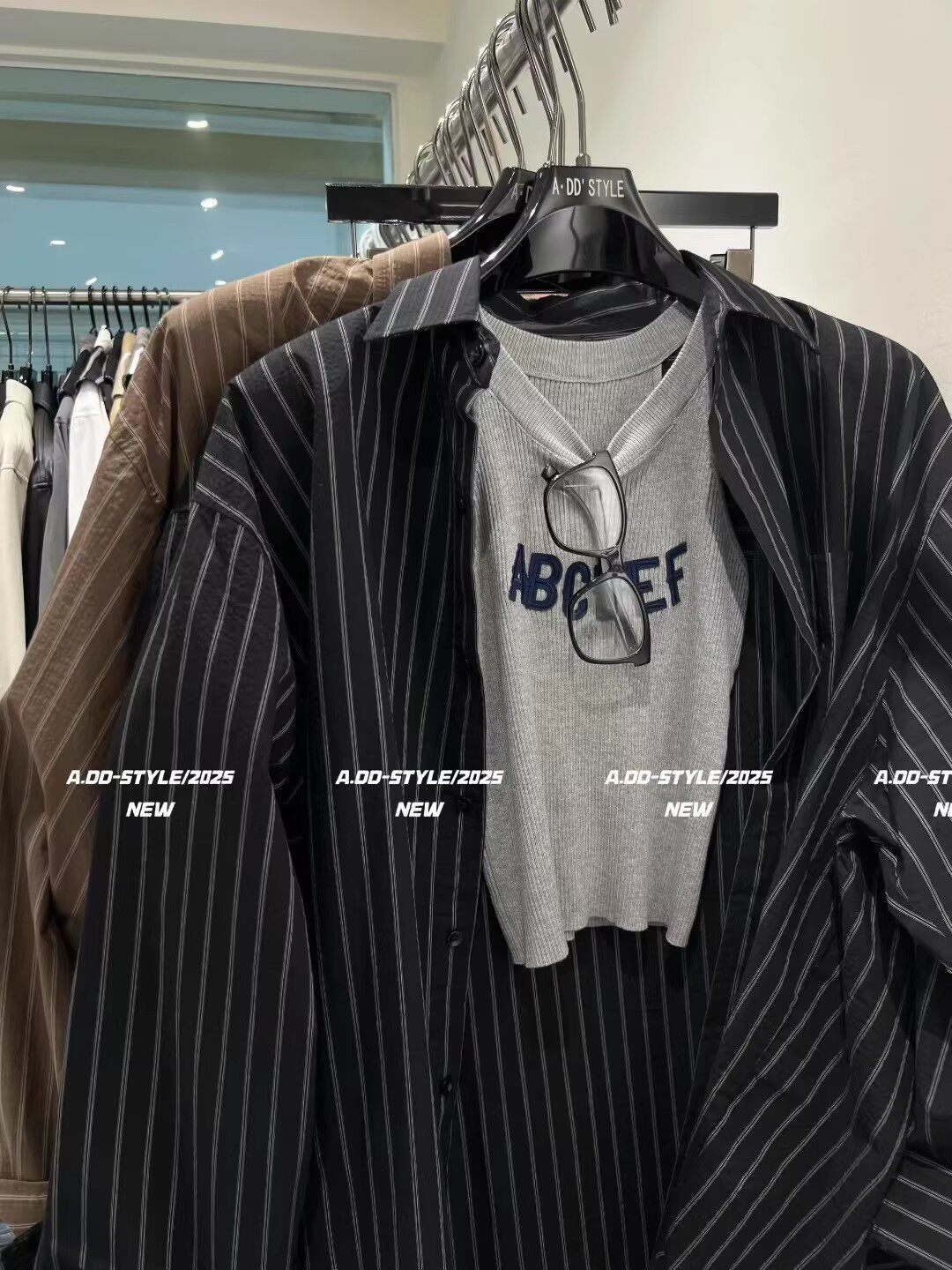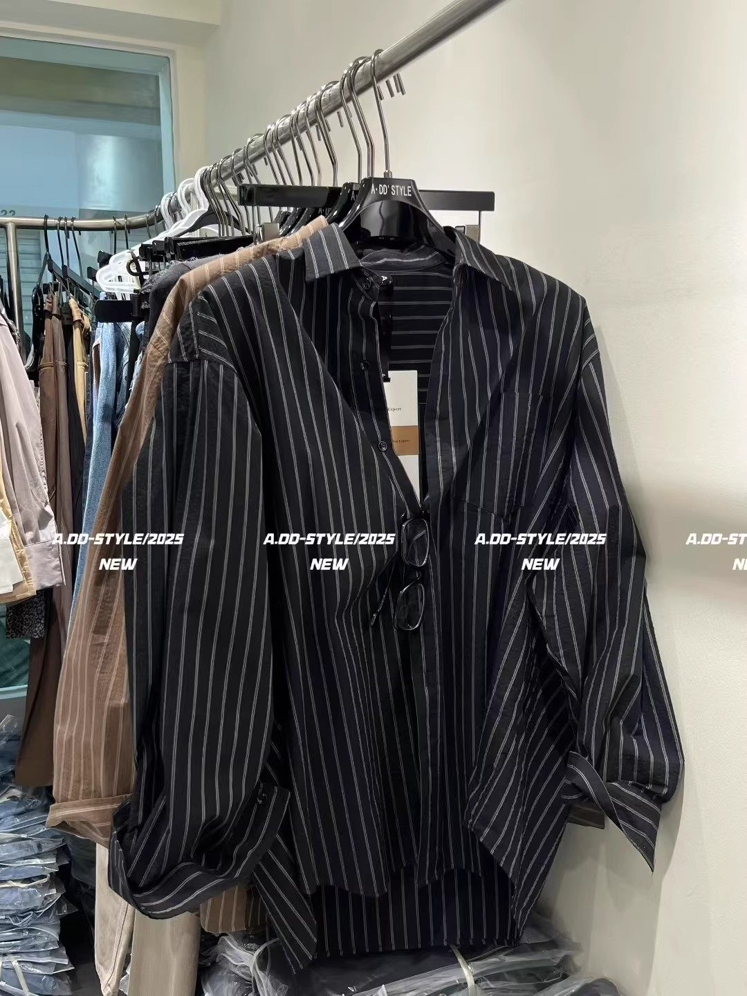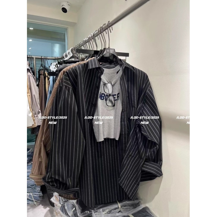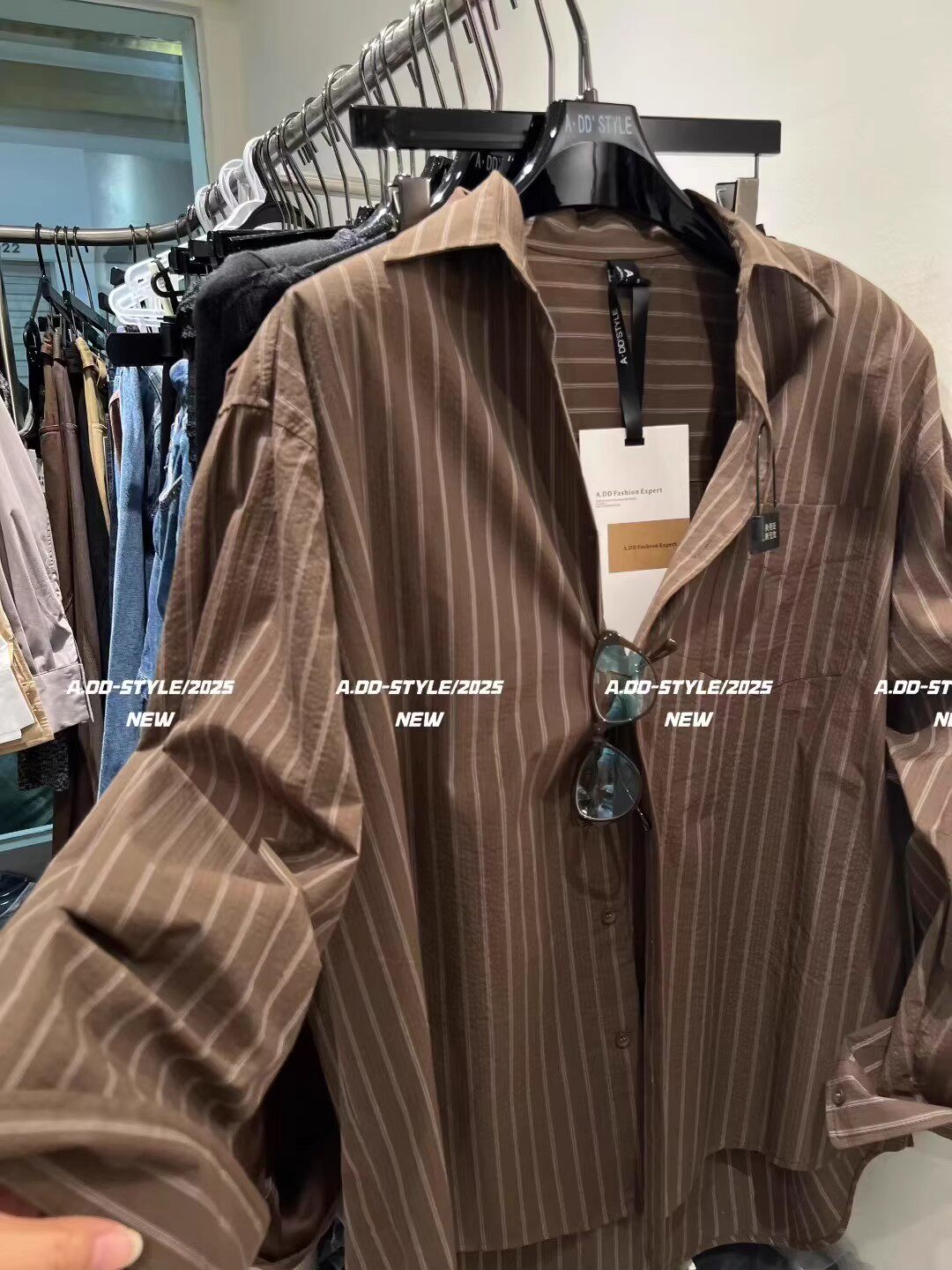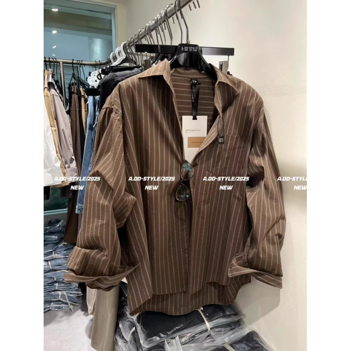 韓國東大門秋季新款復古氣質咖色條紋長袖襯衫女慵懶寬鬆休閒上衣
