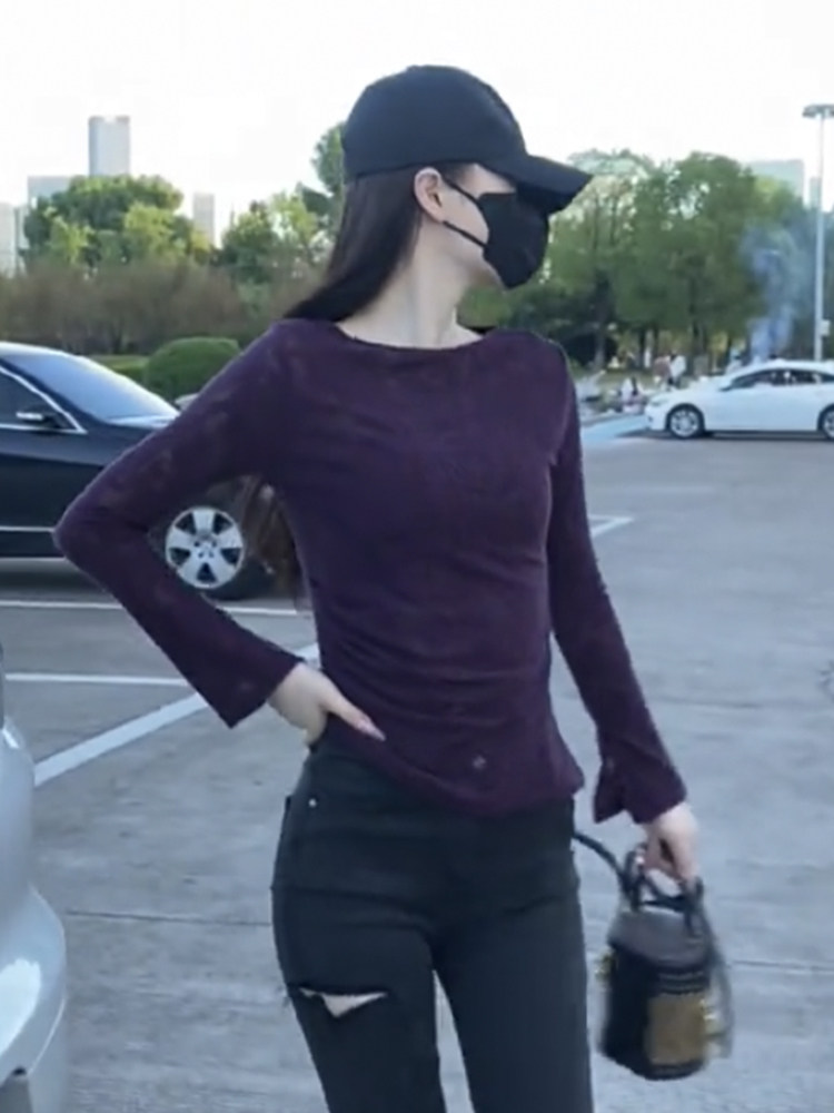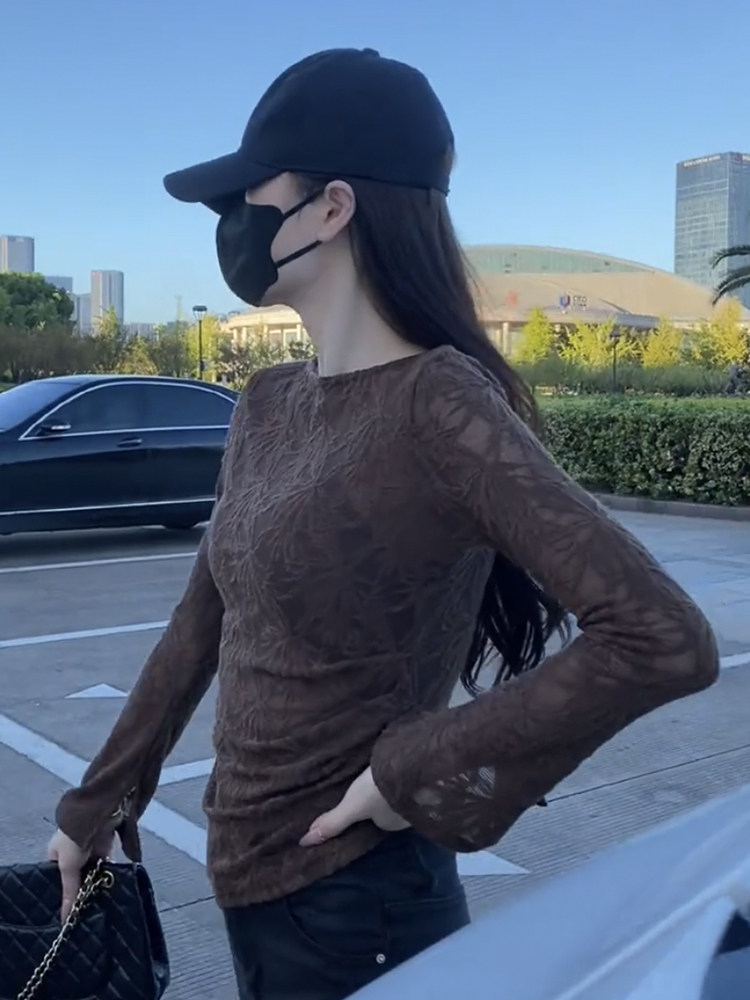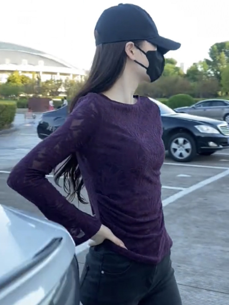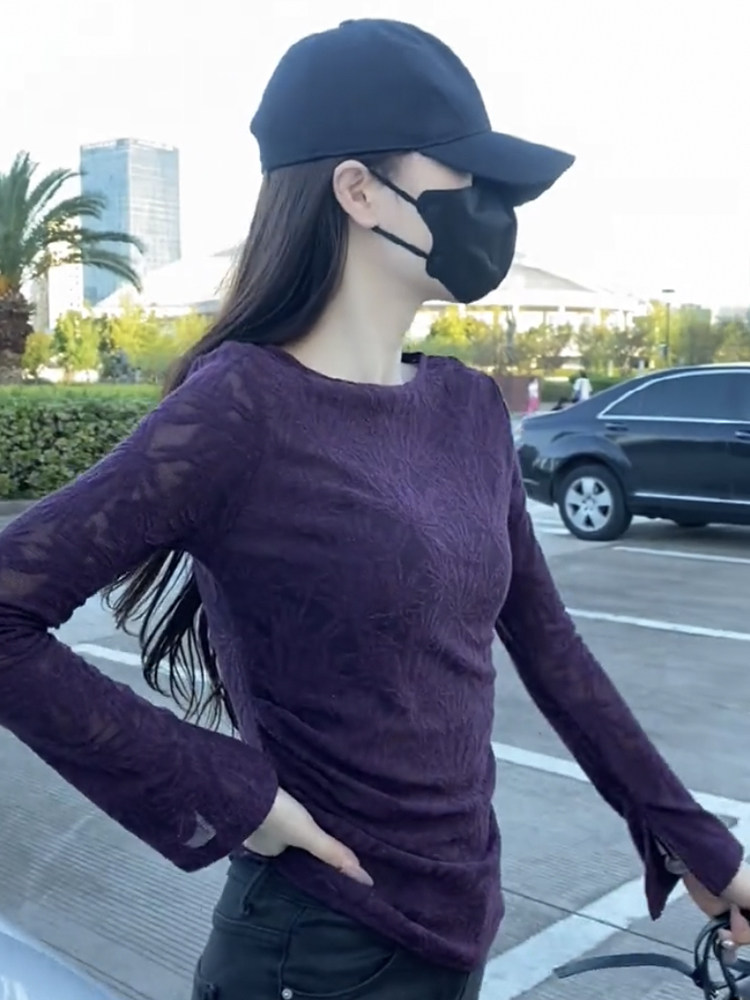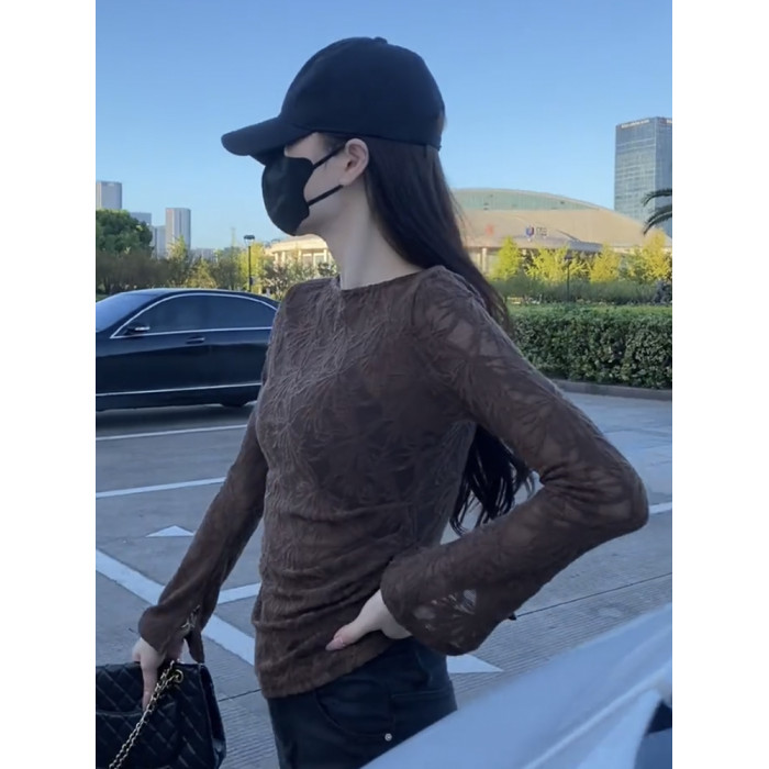 超好看提花微透蕾絲打底衫女長袖2025新款夏季不規則顯瘦絕美上衣